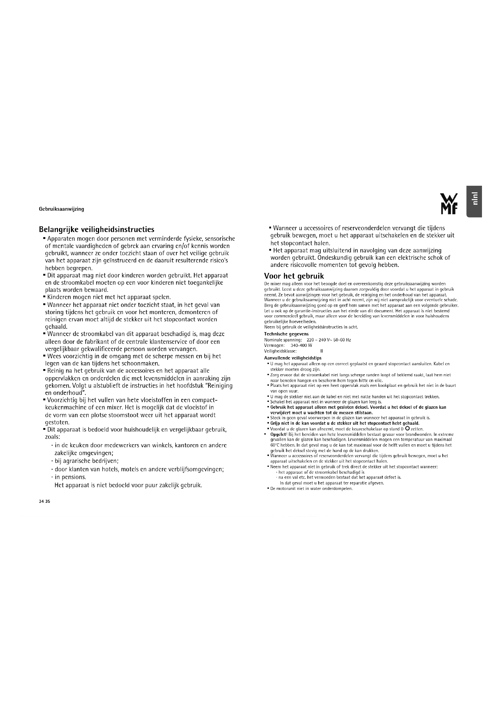 - Het apparaat mag uitsluitend in navolging van deze aanwijzing worden gebruikt. Ondeskundig gebruik kan een elektrische schok of andere risicovolle momenten tot gevolg hebben. Voor het gebruik De mixer mag alleen voor het beoogde doel en overeenkomstig deze gebruiksaanwijzing worden gebruikt. Leest u deze gebruiksaanwijzing daarom zorgvuldig door voordat u het apparaat in gebruik neemt. Ze bevat aanwijzingen voor het gebruik, de reiniging en het onderhoud van het apparaat. Wanneer u de gebruiksaanwijzing niet in acht neemt, zijn wij niet aansprakelijk voor eventuele schade. Berg de gebruiksaanwijzing goed op en geef hem samen met het apparaat aan een volgende gebruiker. Let u ook op de garantie-instructies aan het einde van dit document. Het apparaat is niet bestemd voor commercieel gebruik, maar alleen voor de bereiding van levensmiddelen in voor huishoudens gebruikelijke hoeveelheden. Neem bij gebruik de veiligheidsinstructies in acht. Technische gegevens Nominale spanning: 220 – 240 V~ 50-60 Hz Vermogen: 340-400 W Veiligheidsklasse: II Aanvullende veiligheidstips