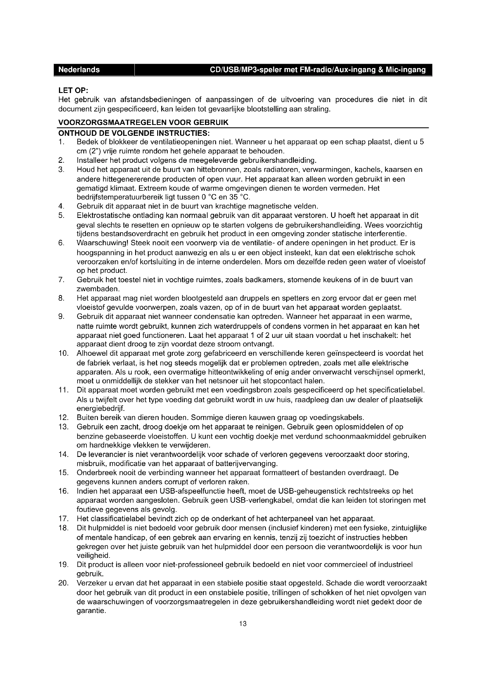 Let op: Gebruik van bedieningen of afstellingen of uitvoer van procedures anders dan gespecificeerd in deze documentatie kan leiden tot blootstelling aan schadelijke straling. Dit apparaat dient uitsluitend te worden aangepast of gerepareerd door gekwalificeerd onderhoudspersoneel. Belangrijk: Omdat de beweging van het CD-mechanisme en de gevoelige schakelingen interferentie kan veroorzaken in radiotuners in de buurt, dient u dit apparaat uit te schakelen terwijl u andere radioapparatuur gebruikt. Wegens de complexiteit van MCU-bediening, dient u de stekker uit het stopcontact te halen als het apparaat tijdens gebruik stopt met werken! Dit duidt niet op een storing van het systeem!18