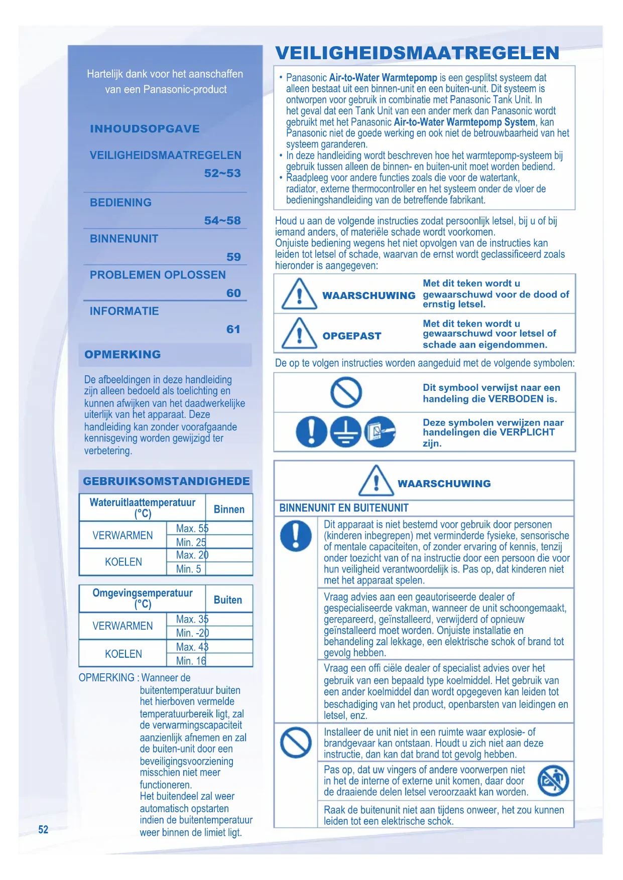 OPMERKING OPMERKING De afbeeldingen in deze handleiding zijn alleen bedoeld als toelichting en kunnen afwijken van het daadwerkelijke uiterlijk van het apparaat. Deze handleiding kan zonder voorafgaande kennisgeving worden gewijzigd ter verbetering. GEBRUIKSOMSTANDIGHEDE GEBRUIKSOMSTANDIGHEDE Wateruitlaattemperatuur (°C) Binnen VERWARMEN Max. 55 Min. 25 KOELEN Max. 20 Min. 5 Omgevingsemperatuur (°C) Buiten VERWARMEN Max. 35 Min. -20 KOELEN Max. 43 Min. 16 OPMERKING : Wanneer de buitentemperatuur buiten het hierboven vermelde temperatuurbereik ligt, zal de verwarmingscapaciteit aanzienlijk afnemen en zal de buiten-unit door een beveiligingsvoorziening misschien niet meer functioneren. Het buitendeel zal weer automatisch opstarten indien de buitentemperatuur weer binnen de limiet ligt. Houd u aan de volgende instructies zodat persoonlijk letsel, bij u of bij iemand anders, of materiële schade wordt voorkomen. Onjuiste bediening wegens het niet opvolgen van de instructies kan leiden tot letsel of schade, waarvan de ernst wordt geclassifi ceerd zoals hieronder is aangegeven: WAARSCHUWING WAARSCHUWING Met dit teken wordt u gewaarschuwd voor de dood of ernstig letsel. OPGEPAST OPGEPAST Met dit teken wordt u gewaarschuwd voor letsel of schade aan eigendommen. De op te volgen instructies worden aangeduid met de volgende symbolen: Dit symbool verwijst naar een handeling die VERBODEN is. Deze symbolen verwijzen naar handelingen die VERPLICHT zijn. WAARSCHUWING WAARSCHUWING