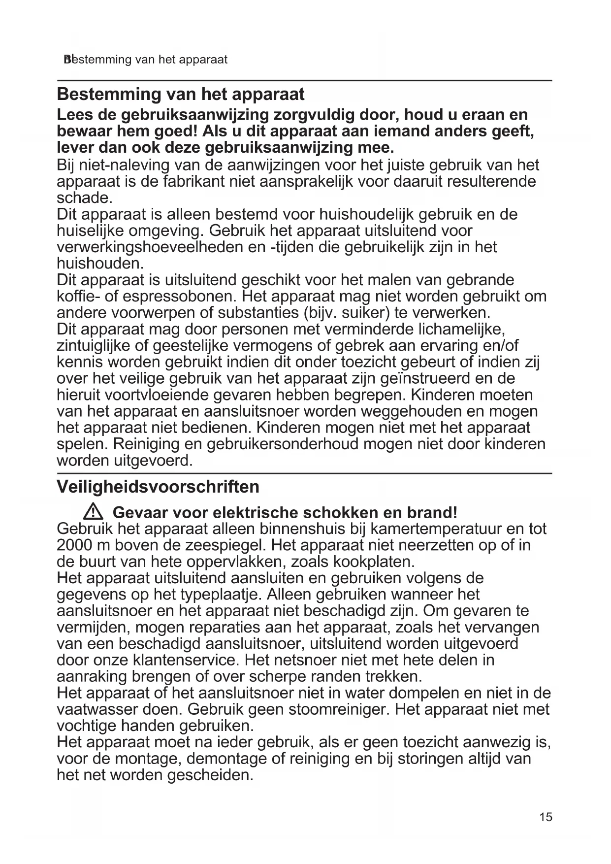 - Bestemming van het apparaat Bestemming van het apparaat Lees de gebruiksaanwijzing zorgvuldig door, houd u eraan en bewaar hem goed! Als u dit apparaat aan iemand anders geeft, lever dan ook deze gebruiksaanwijzing mee. Bij niet-naleving van de aanwijzingen voor het juiste gebruik van het apparaat is de fabrikant niet aansprakelijk voor daaruit resulterende schade. Dit apparaat is alleen bestemd voor huishoudelijk gebruik en de huiselijke omgeving. Gebruik het apparaat uitsluitend voor verwerkingshoeveelheden en -tijden die gebruikelijk zijn in het huishouden. Dit apparaat is uitsluitend geschikt voor het malen van gebrande koffie- of espressobonen. Het apparaat mag niet worden gebruikt om andere voorwerpen of substanties (bijv. suiker) te verwerken. Dit apparaat mag door personen met verminderde lichamelijke, zintuiglijke of geestelijke vermogens of gebrek aan ervaring en/of kennis worden gebruikt indien dit onder toezicht gebeurt of indien zij over het veilige gebruik van het apparaat zijn geïnstrueerd en de hieruit voortvloeiende gevaren hebben begrepen. Kinderen moeten van het apparaat en aansluitsnoer worden weggehouden en mogen het apparaat niet bedienen. Kinderen mogen niet met het apparaat spelen. Reiniging en gebruikersonderhoud mogen niet door kinderen worden uitgevoerd. Veiligheidsvoorschriften W Gevaar voor elektrische schokken en brand! Gebruik het apparaat alleen binnenshuis bij kamertemperatuur en tot 2000 m boven de zeespiegel. Het apparaat niet neerzetten op of in de buurt van hete oppervlakken, zoals kookplaten. Het apparaat uitsluitend aansluiten en gebruiken volgens de gegevens op het typeplaatje. Alleen gebruiken wanneer het aansluitsnoer en het apparaat niet beschadigd zijn. Om gevaren te vermijden, mogen reparaties aan het apparaat, zoals het vervangen van een beschadigd aansluitsnoer, uitsluitend worden uitgevoerd door onze klantenservice. Het netsnoer niet met hete delen in aanraking brengen of over scherpe randen trekken. Het apparaat of het aansluitsnoer niet in water dompelen en niet in de vaatwasser doen. Gebruik geen stoomreiniger. Het apparaat niet met vochtige handen gebruiken. Het apparaat moet na ieder gebruik, als er geen toezicht aanwezig is, voor de montage, demontage of reiniging en bij storingen altijd van het net worden gescheiden.16 nl Veiligheidsvoorschriften W Gevaar voor letsel! Tijdens het gebruik altijd toezicht houden op het apparaat! Het apparaat niet langer ingeschakeld laten dan nodig is voor het verwerken van het levensmiddel. Direct na gebruik van het apparaat wachten totdat de aandrijving stilstaat. Het apparaat niet onbelast laten lopen. W Belangrijk! Nadat het apparaat drie maal achtereen onafgebroken is gebruikt, is een onderbreking van ca. 60 minuten vereist. Het apparaat na elk gebruik of als het langere tijd niet is gebruikt, altijd volgens de beschrijving reinigen. X “Reiniging en verzorging” zie pagina 17 Hartelijk gefeliciteerd met de aankoop van uw nieuwe Bosch-apparaat. Meer informatie over onze producten vindt u op onze website. Inhoud Bestemming van het apparaat p. 15