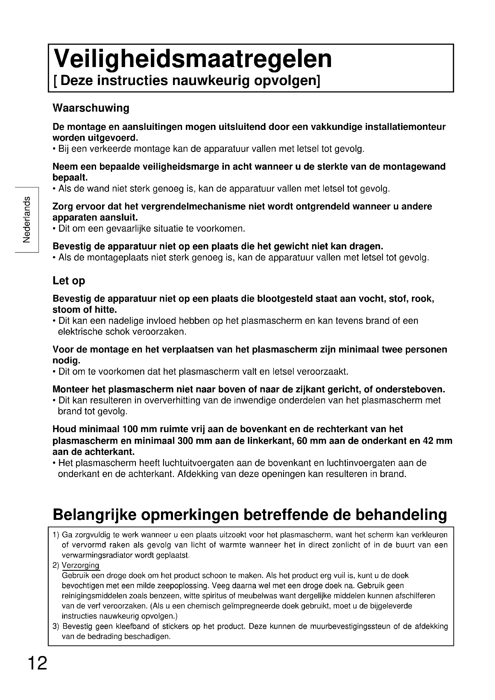 Waarschuwing De montage en aansluitingen mogen uitsluitend door een vakkundige installatiemonteurworden uitgevoerd.• Bij een verkeerde montage kan de apparatuur vallen met letsel tot gevolg.Neem een bepaalde veiligheidsmarge in acht wanneer u de sterkte van de montagewandbepaalt.• Als de wand niet sterk genoeg is, kan de apparatuur vallen met letsel tot gevolg.Zorg ervoor dat het vergrendelmechanisme niet wordt ontgrendeld wanneer u andereapparaten aansluit.• Dit om een gevaarlijke situatie te voorkomen.Bevestig de apparatuur niet op een plaats die het gewicht niet kan dragen.• Als de montageplaats niet sterk genoeg is, kan de apparatuur vallen met letsel tot gevolg. Let op Bevestig de apparatuur niet op een plaats die blootgesteld staat aan vocht, stof, rook,stoom of hitte.• Dit kan een nadelige invloed hebben op het plasmascherm en kan tevens brand of eenelektrische schok veroorzaken.Voor de montage en het verplaatsen van het plasmascherm zijn minimaal twee personennodig.• Dit om te voorkomen dat het plasmascherm valt en letsel veroorzaakt.Monteer het plasmascherm niet naar boven of naar de zijkant gericht, of ondersteboven.• Dit kan resulteren in oververhitting van de inwendige onderdelen van het plasmascherm metbrand tot gevolg.Houd minimaal 100 mm ruimte vrij aan de bovenkant en de rechterkant van hetplasmascherm en minimaal 300 mm aan de linkerkant, 60 mm aan de onderkant en 42 mmaan de achterkant.• Het plasmascherm heeft luchtuitvoergaten aan de bovenkant en luchtinvoergaten aan deonderkant en de achterkant. Afdekking van deze openingen kan resulteren in brand.1) Ga zorgvuldig te werk wanneer u een plaats uitzoekt voor het plasmascherm, want het scherm kan verkleurenof vervormd raken als gevolg van licht of warmte wanneer het in direct zonlicht of in de buurt van eenverwarmingsradiator wordt geplaatst.2) VerzorgingGebruik een droge doek om het product schoon te maken. Als het product erg vuil is, kunt u de doekbevochtigen met een milde zeepoplossing. Veeg daarna wel met een droge doek na. Gebruik geenreinigingsmiddelen zoals benzeen, witte spiritus of meubelwas want dergelijke middelen kunnen afschilferenvan de verf veroorzaken. (Als u een chemisch geïmpregneerde doek gebruikt, moet u de bijgeleverdeinstructies nauwkeurig opvolgen.)3) Bevestig geen kleefband of stickers op het product. Deze kunnen de muurbevestigingssteun of de afdekkingvan de bedrading beschadigen. Belangrijke opmerkingen betreffende de behandeling Veiligheidsmaatregelen