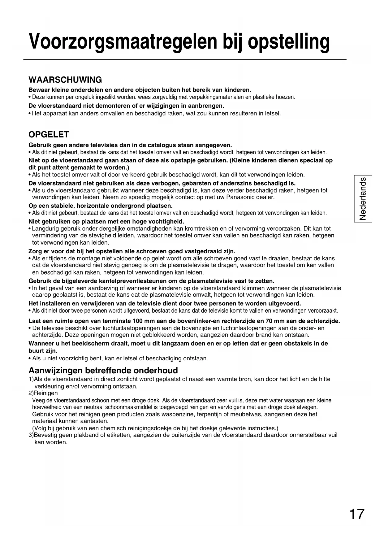 - In het geval van een aardbeving of wanneer er kinderen op de vloerstandaard klimmen wanneer de plasmatelevisie daarop geplaatst is, bestaat de kans dat de plasmatelevisie omvalt, hetgeen tot verwondingen kan leiden. Het installeren en verwijderen van de televisie dient door twee personen te worden uitgevoerd.