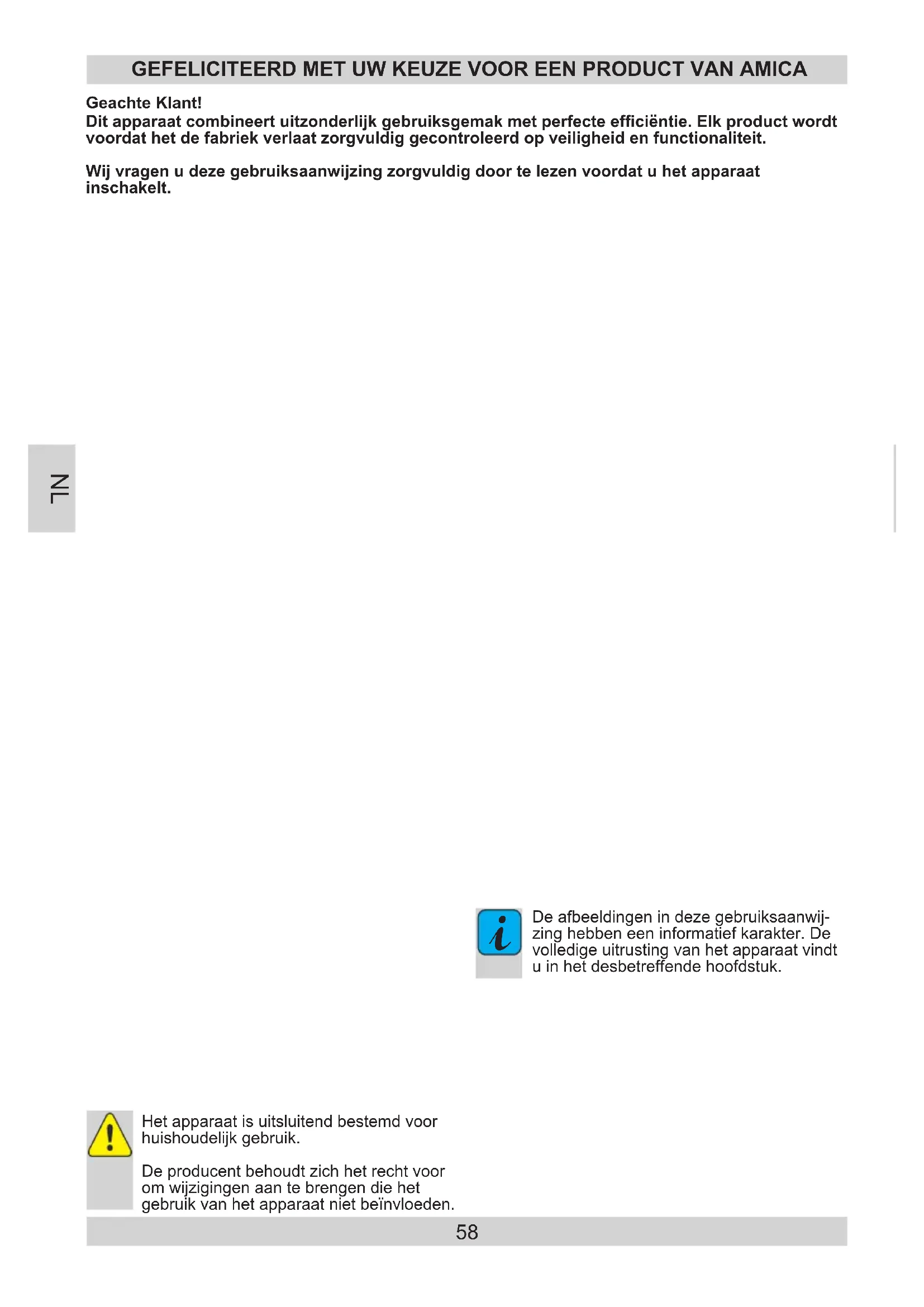 EN58 Ditapparaatcombineertuitzonderlijkgebruiksgemakmetperfecteefciëntie.Elkproductwordt voordathetdefabriekverlaatzorgvuldiggecontroleerdopveiligheidenfunctionaliteit. Wijvragenudezegebruiksaanwijzingzorgvuldigdoortelezenvoordatuhetapparaat inschakelt. GeachteKlant! GEFELICITEERD MET UW KEUZE VOOR EEN PRODUCT VAN AMICA Het apparaat is uitsluitend bestemd voor huishoudelijk gebruik. De producent behoudt zich het recht voor om wijzigingen aan te brengen die het gebruik van het apparaat niet beïnvloeden.