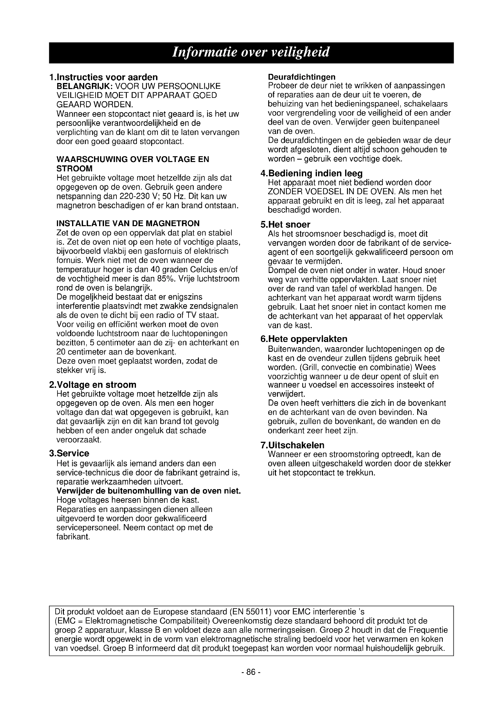 Zet de oven op een oppervlak dat plat en stabiel is. Zet de oven niet op een hete of vochtige plaats, bijvoorbeeld vlakbij een gasfornuis of elektrisch fornuis. Werk niet met de oven wanneer de temperatuur hoger is dan 40 graden Celcius en/of de vochtigheid meer is dan 85%. Vrije luchtstroom rond de oven is belangrijk. De mogeljkheid bestaat dat er enigszins interferentie plaatsvindt met zwakke zendsignalen als de oven te dicht bij een radio of TV staat. Voor veilig en effïciënt werken moet de oven voldoende luchtstroom naar de luchtopeningen bezitten, 5 centimeter aan de zij- en achterkant en 20 centimeter aan de bovenkant. Deze oven moet geplaatst worden, zodat de stekker vrij is. 2.Voltage en stroom Het gebruikte voltage moet hetzelfde zijn als opgegeven op de oven. Als men een hoger voltage dan dat wat opgegeven is gebruikt, kan dat gevaarlijk zijn en dit kan brand tot gevolg hebben of een ander ongeluk dat schade veroorzaakt. 3.Service Het is gevaarlijk als iemand anders dan een service-technicus die door de fabrikant getraind is, reparatie werkzaamheden uitvoert. Verwijder de buitenomhulling van de oven niet. Hoge voltages heersen binnen de kast. Reparaties en aanpassingen dienen alleen uitgevoerd te worden door gekwalificeerd servicepersoneel. Neem contact op met de fabrikant. Deurafdichtingen Probeer de deur niet te wrikken of aanpassingen of reparaties aan de deur uit te voeren, de behuizing van het bedieningspaneel, schakelaars voor vergrendeling voor de veiligheid of een ander deel van de oven. Verwijder geen buitenpaneel van de oven. De deurafdichtingen en de gebieden waar de deur wordt afgesloten, dient altijd schoon gehouden te worden – gebruik een vochtige doek. 4.Bediening indien leeg Het apparaat moet niet bediend worden door ZONDER VOEDSEL IN DE OVEN. Als men het apparaat gebruikt en dit is leeg, zal het apparaat beschadigd worden. 5.Het snoer Als het stroomsnoer beschadigd is, moet dit vervangen worden door de fabrikant of de service- agent of een soortgelijk gekwalificeerd persoon om gevaar te vermijden. Dompel de oven niet onder in water. Houd snoer weg van verhitte oppervlakten. Laat snoer niet over de rand van tafel of werkblad hangen. De achterkant van het apparaat wordt warm tijdens gebruik. Laat het snoer niet in contact komen me de achterkant van het apparaat of het oppervlak van de kast. 6.Hete oppervlakten Buitenwanden, waaronder luchtopeningen op de kast en de ovendeur zullen tijdens gebruik heet worden. (Grill, convectie en combinatie) Wees voorzichtig wanneer u de deur opent of sluit en wanneer u voedsel en accessoires insteekt of verwijdert. De oven heeft verhitters die zich in de bovenkant en de achterkant van de oven bevinden. Na gebruik, zullen de bovenkant, de wanden en de onderkant zeer heet zijn. 7.Uitschakelen Wanneer er een stroomstoring optreedt, kan de oven alleen uitgeschakeld worden door de stekker uit het stopcontact te trekkun. Dit produkt voldoet aan de Europese standaard (EN 55011) voor EMC interferentie ’s (EMC = Elektromagnetische Compabiliteit) Overeenkomstig deze standaard behoord dit produkt tot de groep 2 apparatuur, klasse B en voldoet deze aan alle normeringseisen. Groep 2 houdt in dat de Frequentie energie wordt opgewekt in de vorm van elektromagnetische straling bedoeld voor het verwarmen en koken van voedsel. Groep B informeerd dat dit produkt toegepast kan worden voor normaal huishoudelijk gebruik. Informatie over veiligheid- 87 - Nederlands Wanneer u voor de eerste keer de oven uitpakt Plaatsing van oven 1.Luchtopeningen Deze oven heeft voldoende ventilatie nodig aan de achterkant om maximale koelefficiency te bereiken.