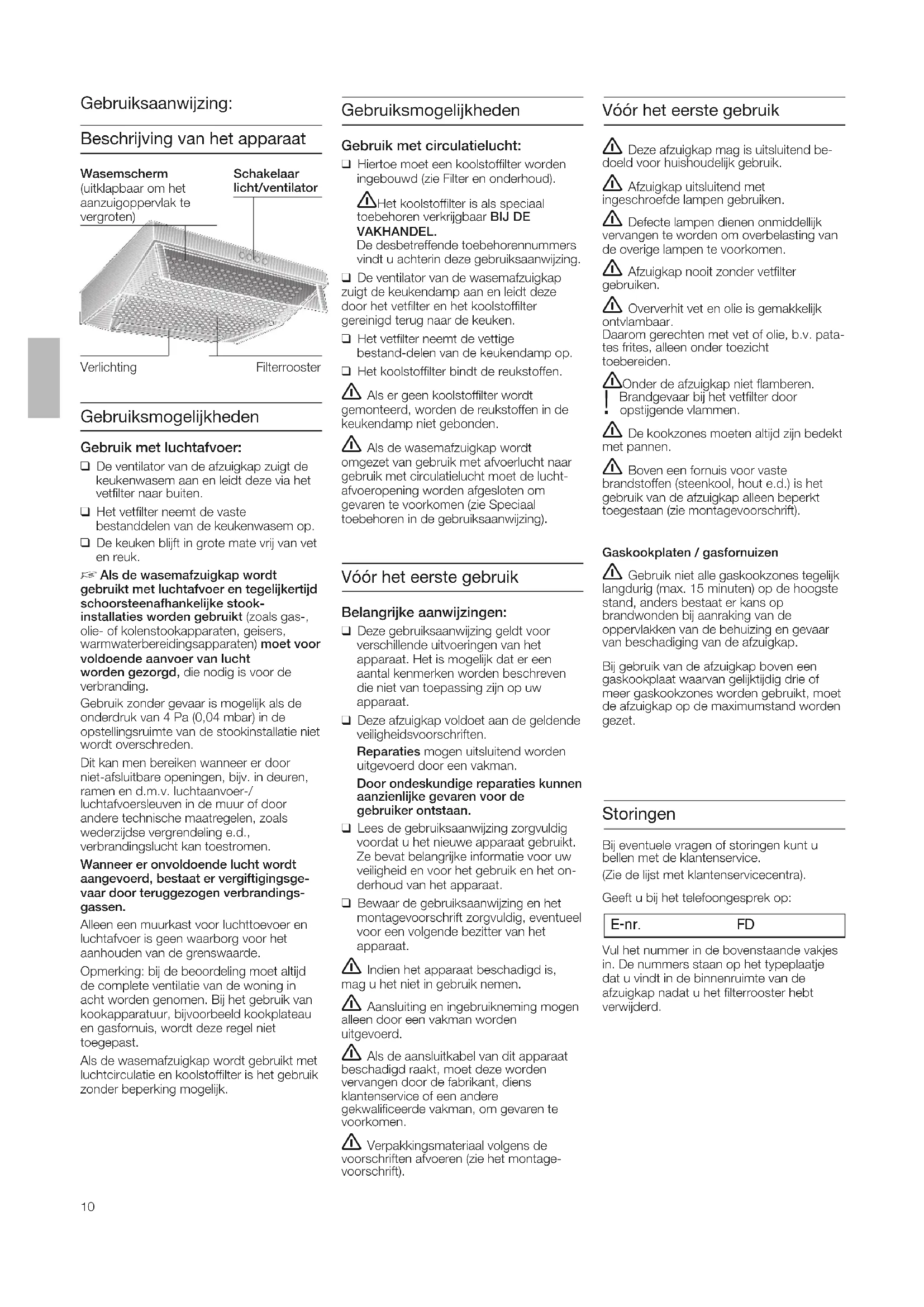 Gewicht in kg: AbluftBreite Umluft 50 cm 60 cm 1-motorig 60 cm 2-motorig 7,0 8,0 10,0 8,0 9,0 11,0 13,0 14,0 90 cm Konstruktionsänderungen im Rahmen der technischen Entwicklung bleiben vorenthalten.10 Gebruiksmogelijkheden Gebruik met circulatielucht:K Hiertoe moet een koolstoffilter wordeningebouwd (zie Filter en onderhoud). 몇Het koolstoffilter is als speciaal toebehoren verkrijgbaar BIJ DE VAKHANDEL.De desbetreffende toebehorennummersvindt u achterin deze gebruiksaanwijzing.K De ventilator van de wasemafzuigkapzuigt de keukendamp aan en leidt dezedoor het vetfilter en het koolstoffilter gereinigd terug naar de keuken.K Het vetfilter neemt de vettige bestand-delen van de keukendamp op.K Het koolstoffilter bindt de reukstoffen. 몇 Als er geen koolstoffilter wordt gemonteerd, worden de reukstoffen in dekeukendamp niet gebonden. 몇 Als de wasemafzuigkap wordt omgezet van gebruik met afvoerlucht naargebruik met circulatielucht moet de lucht-afvoeropening worden afgesloten om gevaren te voorkomen (zie Speciaal toebehoren in de gebruiksaanwijzing) VerlichtingSchakelaarlicht/ventilatorFilterroosterWasemscherm(uitklapbaar om het aanzuigoppervlak te vergroten) Beschrijving van het apparaat Gebruiksaanwijzing: Gebruiksmogelijkheden Gebruik met luchtafvoer:K De ventilator van de afzuigkap zuigt dekeukenwasem aan en leidt deze via hetvetfilter naar buiten.K Het vetfilter neemt de vaste bestanddelen van de keukenwasem op.K De keuken blijft in grote mate vrij van veten reuk. Als de wasemafzuigkap wordtgebruikt met luchtafvoer en tegelijkertijdschoorsteenafhankelijke stook-installaties worden gebruikt (zoals gas-,olie- of kolenstookapparaten, geisers,warmwaterbereidingsapparaten) moet voorvoldoende aanvoer van luchtworden gezorgd, die nodig is voor de verbranding.Gebruik zonder gevaar is mogelijk als deonderdruk van 4 Pa (0,04 mbar) in deopstellingsruimte van de stookinstallatie nietwordt overschreden.Dit kan men bereiken wanneer er door niet-afsluitbare openingen, bijv. in deuren,ramen en d.m.v. luchtaanvoer-/luchtafvoersleuven in de muur of doorandere technische maatregelen, zoalswederzijdse vergrendeling e.d., verbrandingslucht kan toestromen.Wanneer er onvoldoende lucht wordtaangevoerd, bestaat er vergiftigingsge-vaar door teruggezogen verbrandings-gassen.Alleen een muurkast voor luchttoevoer enluchtafvoer is geen waarborg voor het aanhouden van de grenswaarde.Opmerking: bij de beoordeling moet altijdde complete ventilatie van de woning inacht worden genomen. Bij het gebruik vankookapparatuur, bijvoorbeeld kookplateauen gasfornuis, wordt deze regel niettoegepast.Als de wasemafzuigkap wordt gebruikt metluchtcirculatie en koolstoffilter is het gebruikzonder beperking mogelijk. Storingen Bij eventuele vragen of storingen kunt u bellen met de klantenservice. (Zie de lijst met klantenservicecentra).Geeft u bij het telefoongesprek op: E-nr. FD Vul het nummer in de bovenstaande vakjesin. De nummers staan op het typeplaatjedat u vindt in de binnenruimte van de afzuigkap nadat u het filterrooster hebt verwijderd. Vóór het eerste gebruik Belangrijke aanwijzingen:K Deze gebruiksaanwijzing geldt voor verschillende uitvoeringen van het apparaat. Het is mogelijk dat er een aantal kenmerken worden beschrevendie niet van toepassing zijn op uw apparaat.K Deze afzuigkap voldoet aan de geldendeveiligheidsvoorschriften.Reparaties mogen uitsluitend wordenuitgevoerd door een vakman.Door ondeskundige reparaties kunnenaanzienlijke gevaren voor de gebruiker ontstaan.K Lees de gebruiksaanwijzing zorgvuldigvoordat u het nieuwe apparaat gebruikt.Ze bevat belangrijke informatie voor uwveiligheid en voor het gebruik en het on-derhoud van het apparaat.K Bewaar de gebruiksaanwijzing en hetmontagevoorschrift zorgvuldig, eventueelvoor een volgende bezitter van het apparaat. 몇 Indien het apparaat beschadigd is, mag u het niet in gebruik nemen. 몇 Aansluiting en ingebruikneming mogen alleen door een vakman worden uitgevoerd. 몇 Als de aansluitkabel van dit apparaat beschadigd raakt, moet deze worden vervangen door de fabrikant, diens klantenservice of een andere gekwalificeerde vakman, om gevaren tevoorkomen. 몇 Verpakkingsmateriaal volgens de voorschriften afvoeren (zie het montage-voorschrift). 몇 Deze afzuigkap mag is uitsluitend be- doeld voor huishoudelijk gebruik. 몇 Afzuigkap uitsluitend met ingeschroefde lampen gebruiken. 몇 Defecte lampen dienen onmiddellijk vervangen te worden om overbelasting vande overige lampen te voorkomen. 몇 Afzuigkap nooit zonder vetfilter gebruiken. 몇 Oververhit vet en olie is gemakkelijk ontvlambaar.Daarom gerechten met vet of olie, b.v. pata-tes frites, alleen onder toezicht toebereiden. 몇Onder de afzuigkap niet flamberen. Brandgevaar bij het vetfilter door ! opstijgende vlammen. 몇 De kookzones moeten altijd zijn bedekt met pannen. 몇 Boven een fornuis voor vaste brandstoffen (steenkool, hout e.d.) is hetgebruik van de afzuigkap alleen beperkttoegestaan (zie montagevoorschrift).Gaskookplaten / gasfornuizen 몇 Gebruik niet alle gaskookzones tegelijk langdurig (max. 15 minuten) op de hoogstestand, anders bestaat er kans op brandwonden bij aanraking van de oppervlakken van de behuizing en gevaarvan beschadiging van de afzuigkap.Bij gebruik van de afzuigkap boven eengaskookplaat waarvan gelijktijdig drie ofmeer gaskookzones worden gebruikt, moetde afzuigkap op de maximumstand wordengezet. Vóór het eerste gebruik11 Bedienen van de wasemafzuigkap