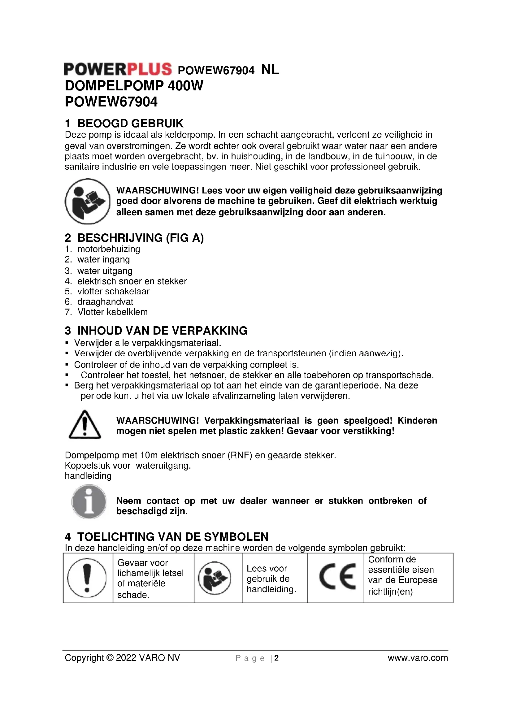 Copyright © 2022 VARO NV P a g e | 2 www.varo.com DOMPELPOMP 400W POWEW67904 1 BEOOGD GEBRUIK Deze pomp is ideaal als kelderpomp. In een schacht aangebracht, verleent ze veiligheid in geval van overstromingen. Ze wordt echter ook overal gebruikt waar water naar een andere plaats moet worden overgebracht, bv. in huishouding, in de landbouw, in de tuinbouw, in de sanitaire industrie en vele toepassingen meer. Niet geschikt voor professioneel gebruik. WAARSCHUWING! Lees voor uw eigen veiligheid deze gebruiksaanwijzing goed door alvorens de machine te gebruiken. Geef dit elektrisch werktuig alleen samen met deze gebruiksaanwijzing door aan anderen. 2 BESCHRIJVING (FIG A)