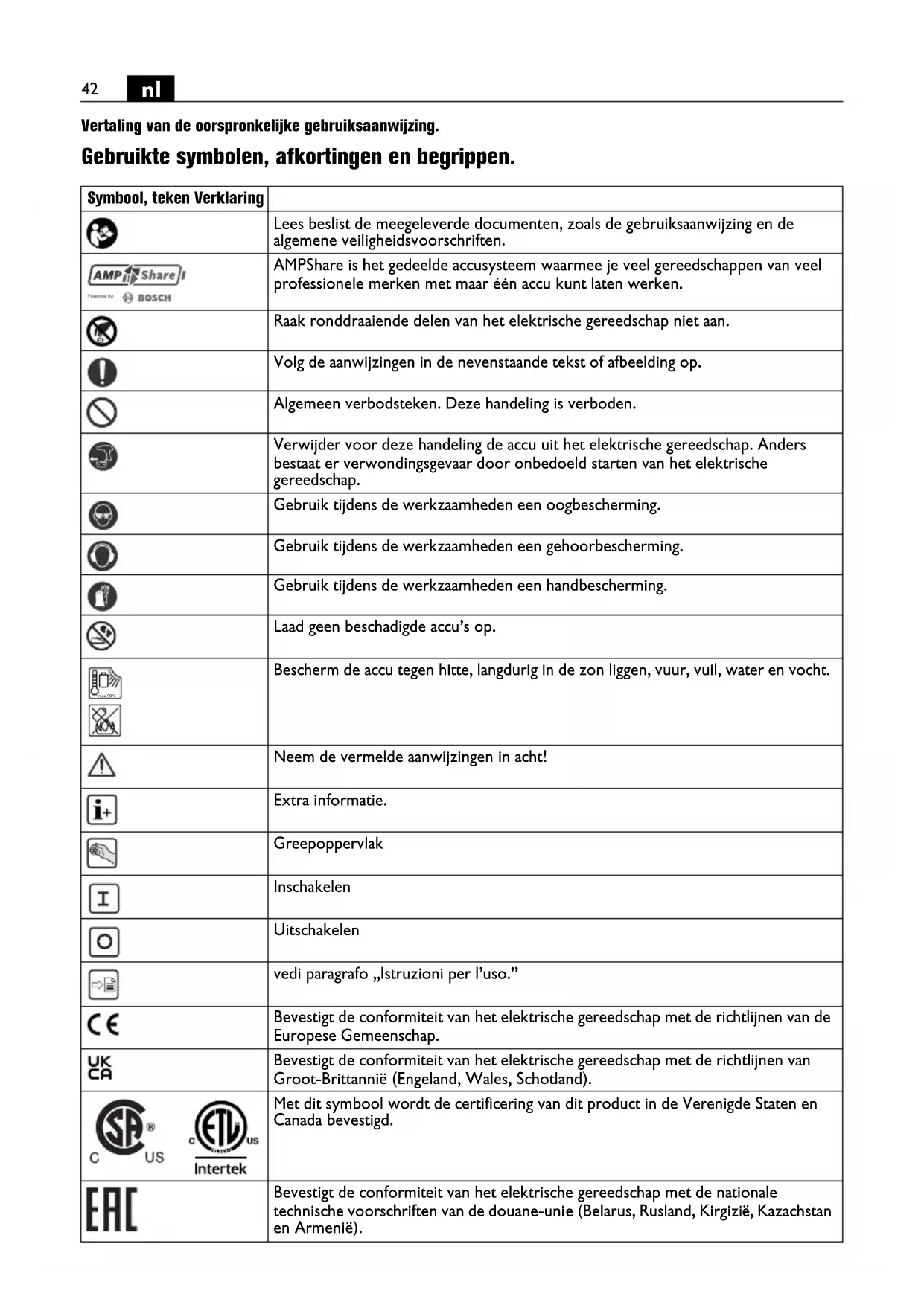 Vertaling van de oorspronkelijke gebruiksaanwijzing. Gebruikte symbolen, afkortingen en begrippen. Symbool, teken Verklaring Lees beslist de meegeleverde documenten, zoals de gebruiksaanwijzing en de algemene veiligheidsvoorschriften. AMPShare is het gedeelde accusysteem waarmee je veel gereedschappen van veel professionele merken met maar één accu kunt laten werken. Raak ronddraaiende delen van het elektrische gereedschap niet aan. Volg de aanwijzingen in de nevenstaande tekst of afbeelding op. Algemeen verbodsteken. Deze handeling is verboden. Verwijder voor deze handeling de accu uit het elektrische gereedschap. Anders bestaat er verwondingsgevaar door onbedoeld starten van het elektrische gereedschap. Gebruik tijdens de werkzaamheden een oogbescherming. Gebruik tijdens de werkzaamheden een gehoorbescherming. Gebruik tijdens de werkzaamheden een handbescherming. Laad geen beschadigde accu’s op. Bescherm de accu tegen hitte, langdurig in de zon liggen, vuur, vuil, water en vocht. Neem de vermelde aanwijzingen in acht! Extra informatie. Greepoppervlak Inschakelen Uitschakelen vedi paragrafo „Istruzioni per l’uso.” Bevestigt de conformiteit van het elektrische gereedschap met de richtlijnen van de Europese Gemeenschap. Bevestigt de conformiteit van het elektrische gereedschap met de richtlijnen van Groot-Brittannië (Engeland, Wales, Schotland). Met dit symbool wordt de certificering van dit product in de Verenigde Staten en Canada bevestigd. Bevestigt de conformiteit van het elektrische gereedschap met de nationale technische voorschriften van de douane-unie (Belarus, Rusland, Kirgizië, Kazachstan en Armenië). max.50°C43