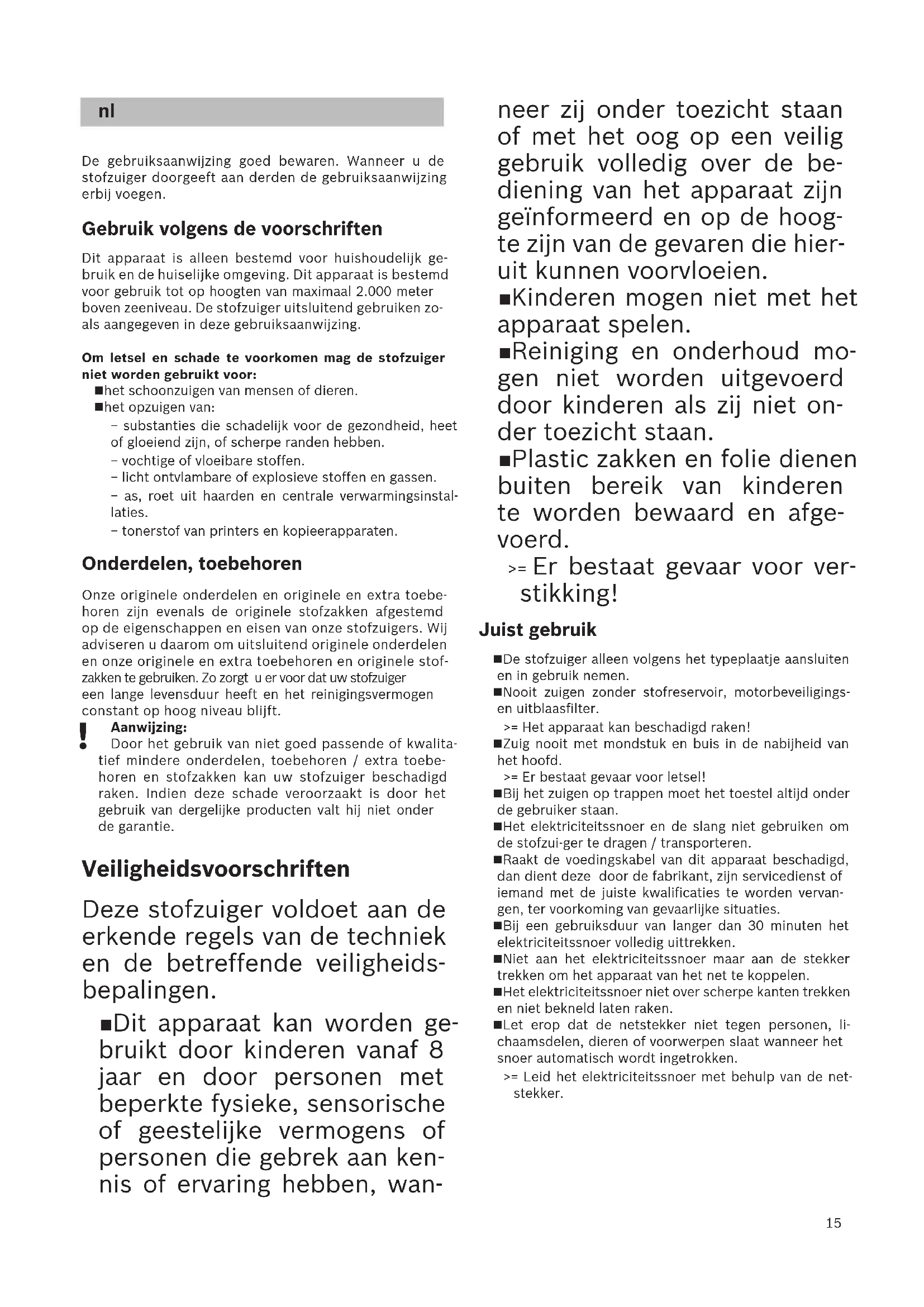 Attenzione! La presa di corrente deve essere protetta attraverso un dispositivo salvavita di almeno 16 A. Se quando si attiva l'apparecchio scatta il disposi- tivo salvavita, la causa può essere dovuta al fatto che sono stati collegati contemporaneamente allo stesso circuito altri apparecchi a elevato consumo energetico. Per evitare di far scattare il dispositivo salvavita, pri- ma di accendere l'apparecchio selezionare il livello di potenza più basso e solo in un secondo momento selezionare un livello di potenza maggiore. Avvertenze per lo smaltimento Imballaggio L'imballaggio protegge l'aspirapolvere contro even- tuali danni durante il trasporto. È costituito da mate- riali non inquinanti e può pertanto essere riciclato. Provvedere allo smaltimento dei materiali di imbal- laggio non più necessari rivolgendosi ai centri di rac- colta per il sistema di riciclaggio "Punto verde". Apparecchio dismesso Gli apparecchi dismessi contengono ancora molte- plici materiali preziosi. Si consiglia pertanto di resti- tuire l'apparecchio dismesso al proprio rivenditore o a un centro di riciclaggio. Per informazioni sulle mo- dalità del riciclaggio, rivolgersi al proprio rivenditore o all'amministrazione comunale della propria città. Smaltimento del filtro Il filtro sono costituiti da materiali non inquinanti. A condizione che non contengono alcuna sostanza dannosa, possono essere smaltiti con i normali rifiu- ti domestici.15 De gebruiksaanwijzing goed bewaren. Wanneer u de stofzuiger doorgeeft aan derden de gebruiksaanwijzing erbij voegen. Gebruik volgens de voorschriften Dit apparaat is alleen bestemd voor huishoudelijk ge-bruik en de huiselijke omgeving. Dit apparaat is bestemd voor gebruik tot op hoogten van maximaal 2.000 meter boven zeeniveau. De stofzuiger uitsluitend gebruiken zo-als aangegeven in deze gebruiksaanwijzing. Om letsel en schade te voorkomen mag de stofzuiger niet worden gebruikt voor: het schoonzuigen van mensen of dieren. het opzuigen van: − substanties die schadelijk voor de gezondheid, heet of gloeiend zijn, of scherpe randen hebben. − vochtige of vloeibare stoffen. − licht ontvlambare of explosieve stoffen en gassen. − as, roet uit haarden en centrale verwarmingsinstal-laties. − tonerstof van printers en kopieerapparaten. Onderdelen, toebehoren Onze originele onderdelen en originele en extra toebe-horen zijn evenals de originele stofzakken afgestemd op de eigenschappen en eisen van onze stofzuigers. Wij adviseren u daarom om uitsluitend originele onderdelen en onze originele en extra toebehoren en originele stof-zakken te gebruiken. Zo zorgt u er voor dat uw stofzuiger een lange levensduur heeft en het reinigingsvermogen constant op hoog niveau blijft. Aanwijzing: Door het gebruik van niet goed passende of kwalita-tief mindere onderdelen, toebehoren / extra toebe-horen en stofzakken kan uw stofzuiger beschadigd raken. Indien deze schade veroorzaakt is door het gebruik van dergelijke producten valt hij niet onder de garantie. Veiligheidsvoorschriften Deze stofzuiger voldoet aan de erkende regels van de techniek en de betreffende veiligheids- bepalingen. Dit apparaat kan worden ge- bruikt door kinderen vanaf 8 jaar en door personen met beperkte fysieke, sensorische of geestelijke vermogens of personen die gebrek aan ken- nis of ervaring hebben, wan-