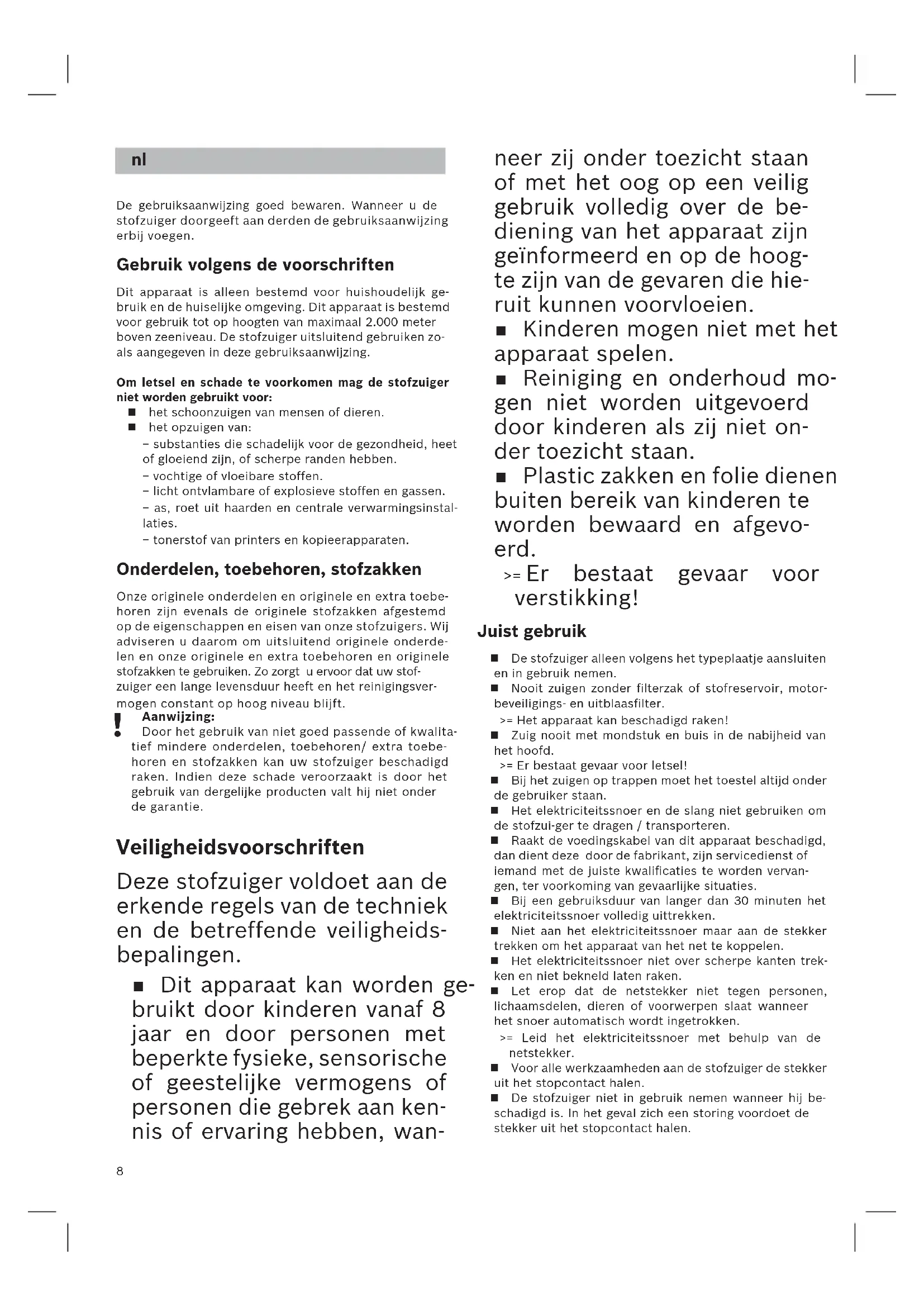 neer zij onder toezicht staan of met het oog op een veilig gebruik volledig over de be- diening van het apparaat zijn geïnformeerd en op de hoog- te zijn van de gevaren die hie- ruit kunnen voorvloeien. Kinderen mogen niet met het apparaat spelen. Reiniging en onderhoud mo- gen niet worden uitgevoerd door kinderen als zij niet on- der toezicht staan. Plastic zakken en folie dienen buiten bereik van kinderen te worden bewaard en afgevo- erd. >= Er bestaat gevaar voor verstikking! Juist gebruik De stofzuiger alleen volgens het typeplaatje aansluiten en in gebruik nemen. Nooit zuigen zonder filterzak of stofreservoir, motor-beveiligings- en uitblaasfilter. >= Het apparaat kan beschadigd raken! Zuig nooit met mondstuk en buis in de nabijheid van het hoofd.>= Er bestaat gevaar voor letsel! Bij het zuigen op trappen moet het toestel altijd onder de gebruiker staan. Het elektriciteitssnoer en de slang niet gebruiken om de stofzui-ger te dragen / transporteren. Raakt de voedingskabel van dit apparaat beschadigd, dan dient deze door de fabrikant, zijn servicedienst of iemand met de juiste kwalificaties te worden vervan-gen, ter voorkoming van gevaarlijke situaties. Bij een gebruiksduur van langer dan 30 minuten het elektriciteitssnoer volledig uittrekken. Niet aan het elektriciteitssnoer maar aan de stekker trekken om het apparaat van het net te koppelen. Het elektriciteitssnoer niet over scherpe kanten trek-ken en niet bekneld laten raken. Let erop dat de netstekker niet tegen personen, lichaamsdelen, dieren of voorwerpen slaat wanneer het snoer automatisch wordt ingetrokken. >= Leid het elektriciteitssnoer met behulp van de netstekker. Voor alle werkzaamheden aan de stofzuiger de stekker uit het stopcontact halen. De stofzuiger niet in gebruik nemen wanneer hij be-schadigd is. In het geval zich een storing voordoet de stekker uit het stopcontact halen.9 Om risico's te voorkomen mogen reparaties aan de stofzuiger en de vervanging van onderdelen alleen worden uitgevoerd door onze klantenservice. De stofzuiger beschermen tegen weersinvloeden, vocht en hittebronnen. Zorg ervoor dat er geen brandbare of alcoholhouden- de stoffen op de filters (filterzak, motorbeveiligingsfil- ter, uitblaasfilter, etc.) terechtkomen. De stofzuiger is niet geschikt voor gebruik op bouw- plaatsen. >= Opzuigen van bouwpuin kan leiden tot beschadi- ging van het toestel. Wanneer de stofzuiger niet gebruikt wordt het toestel uitschakelen en de stekker uit het stopcontact halen. Versleten apparaten onmiddellijk onbruikbaar maken, het toestel daarna op een verantwoorde wijze afvo- eren.