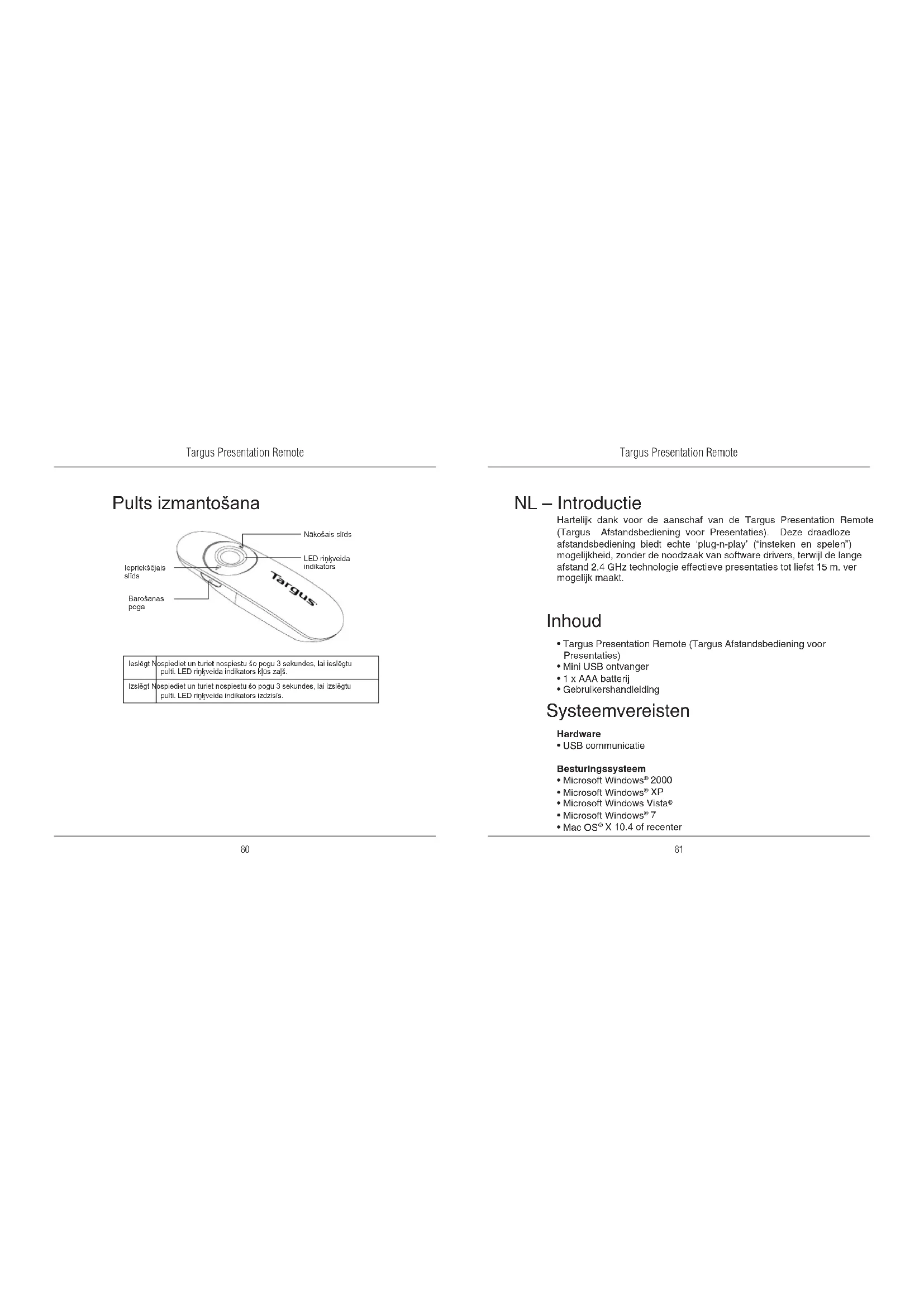 NL – Introductie Hartelijk dank voor de aanschaf van de Targus Presentation Remote (Targus Afstandsbediening voor Presentaties). Deze draadloze afstandsbediening biedt echte ‘plug-n-play’ (“insteken en spelen”) mogelijkheid, zonder de noodzaak van software drivers, terwijl de lange afstand 2.4 GHz technologie effectieve presentaties tot liefst 15 m. ver mogelijk maakt. Systeemvereisten Hardware