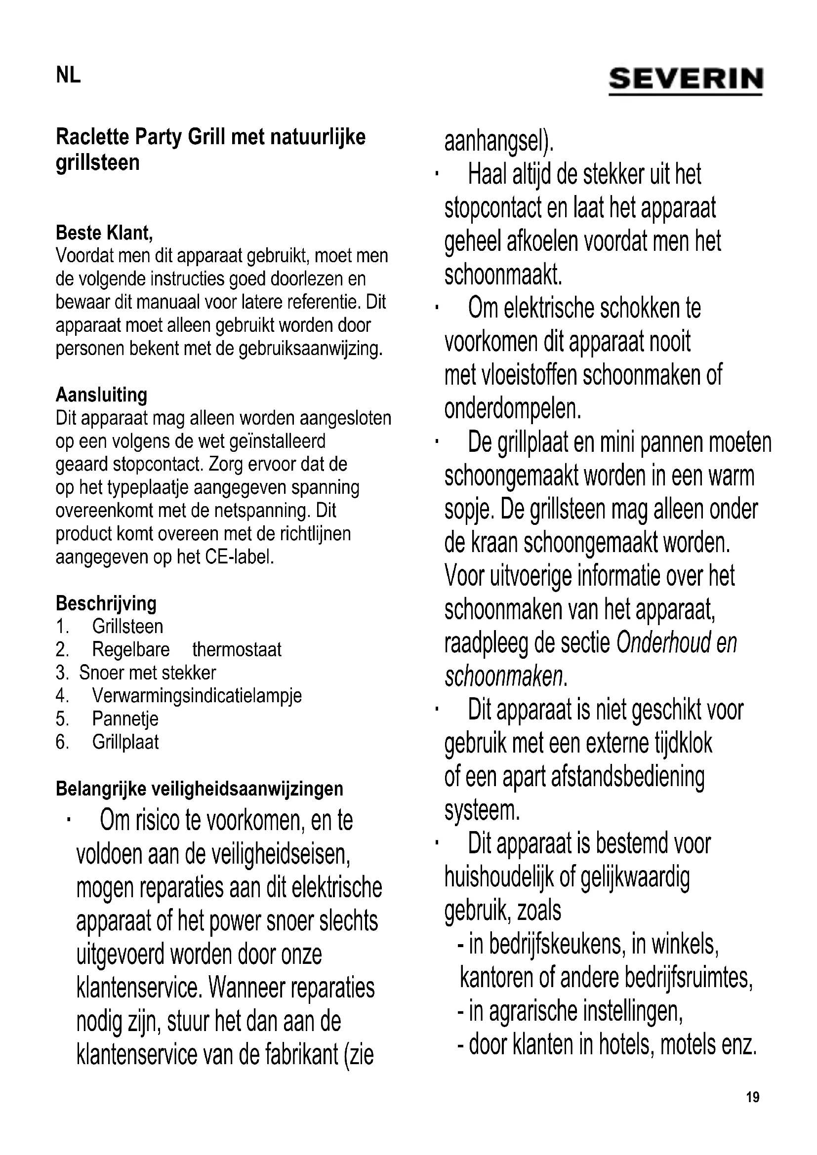 Belangrijke veiligheidsaanwijzingen ∙ Om risico te voorkomen, en te voldoen aan de veiligheidseisen, mogen reparaties aan dit elektrische apparaat of het power snoer slechts uitgevoerd worden door onze klantenservice. Wanneer reparaties nodig zijn, stuur het dan aan de klantenservice van de fabrikant (zie aanhangsel). ∙ Haal altijd de stekker uit het stopcontact en laat het apparaat geheel afkoelen voordat men het schoonmaakt. ∙ Om elektrische schokken te voorkomen dit apparaat nooit met vloeistoffen schoonmaken of onderdompelen. ∙ De grillplaat en mini pannen moeten schoongemaakt worden in een warm sopje. De grillsteen mag alleen onder de kraan schoongemaakt worden. Voor uitvoerige informatie over het schoonmaken van het apparaat, raadpleeg de sectie Onderhoud en schoonmaken. ∙ Dit apparaat is niet geschikt voor gebruik met een externe tijdklok of een apart afstandsbediening systeem. ∙ Dit apparaat is bestemd voor huishoudelijk of gelijkwaardig gebruik, zoals - in bedrijfskeukens, in winkels, kantoren of andere bedrijfsruimtes, - in agrarische instellingen, - door klanten in hotels, motels enz. NL20 en gelijkwaardige accommodaties, - in bed and breakfast gasthuizen. ∙ Dit apparaat mag gebruikt worden door kinderen (tenminste 8 jaar oud) en door personen met verminderde fysische, zintuiglijke of mentale bekwaamheden, of gebrek van ervaring en kennis, wanneer deze onder begeleiding zijn of instructies ontvangen hebben over het gebruik van dit apparaat en volledig de gevaren en veiligheidsvoorschriften begrijpen. ∙ Kinderen mogen niet met het apparaat spelen. ∙ Kinderen mogen in geen geval dit apparaat schoonmaken of onderhoudswerkzaamheden uitvoeren behalve wanneer onder toezicht van een volwassene en ze tenminste 8 jaar oud zijn. ∙ Het apparaat en het snoer moeten altijd goed weggehouden worden van kinderen jonger dan 8 jaar. ∙ Waarschuwing: Houdt kinderen weg van inpakmateriaal, daar deze een bron van gevaar zijn bv. door verstikking. ∙ Voordat het apparaat gebruikt wordt moet het hoofddeel inclusief het snoer evenals welk hulpstuk dan ook dat wordt aangebracht, zorgvuldig gecontroleerd worden op eventuele gebreken of defecten. Ingeval het apparaat, bijvoorbeeld, op een hard oppervlak is gevallen, of wanneer men met overdadige kracht aan het power snoer getrokken heeft, mag men het niet meer gebruiken: zelfs onzichtbare beschadiging kan ongewenste effecten hebben op de gebruiksveiligheid van het apparaat. ∙ Het snoer moet vrijgehouden worden van hete onderdelen van het apparaat. ∙ Waarschuwing: Er is gevaar voor verbranding. De oppervlaktes van de behuizing, het grill gebied en mini pannetjes worden heet tijdens gebruik. ∙ Laat dit apparaat nooit onbeheerd achter. ∙ Tijdens gebruik moet het apparaat altijd op een hittebestendige ondergrond geplaatst zijn die tevens bestand is tegen spetteren en vlekken. Wanneer men voedsel roostert met een hoog vetgehalte kan spetteren niet altijd voorkomen worden. ∙ De grill niet bij een muur of in een hoek plaatsen, en zorg ervoor dat in de buurt ervan geen ontvlambare materialen worden opgeslagen. ∙ Voor gebruik, moet men de grillsteen en grillplaat boven op het apparaat geplaatst worden, over het verwarmingselement. ∙ Pas op: Gebruik dit apparaat niet buitenshuis. ∙ Verwijder altijd de stekker uit het stopcontact: - na gebruik, - wanneer het apparaat niet werkt, - wanneer men het apparaat schoonmaakt. ∙ Trek de stekker niet aan het snoer uit het stopcontact, trek aan de stekker zelf. ∙ Dit apparaat mag alleen gebruikt worden21 met de door de fabrikant bijgeleverde hulpstukken. ∙ Geef het apparaat altijd voldoende tijd om af te koelen voordat men de grillsteen en grillplaat verwijdert, en voordat men de unit schoonmaakt of opbergt. ∙ De fabrikant heeft geen verantwoordelijkheid wanneer dit apparaat verkeerd gebruikt word of wanneer de veiligheidsinstructies niet gevolgd worden. Gebruik Eerste ingebruikname Verwijder al het verpakkingsmateriaal. Voordat men het apparaat voor de eerste keer gebruikt, moet men de grillsteen, grillplaat en mini pannetjes schoonmaken met een vochtige doek. Wij adviseren u om voor het eerste gebruik het apparaat en de mini pannetjes ca. 10 minuten op max. stand zonder vlees te verwarmen, zodat de reuk, van het apparaat zelf, kan verdwijnen (hierbij kan een lichte rookontwikkeling ontstaan, zorg voor goede ventilatie). Steen ∙ Breng de steen op het apparaat aan boven het verwarmingselement, met de gepolijste kant naar boven gericht. Zorg ervoor dat de uitsparingen aan de onderzijde van de steen zodanig over de rails van het frame passen dat de steen niet kan bewegen. ∙ Let wel: Een koude steen mag niet op een heet element worden aangebracht. ∙ De steen kan, naar wens, worden gebruikt voor het koken van groenten, van in schijven gesneden vlees of vis, etc. ∙ Deze steen is gemaakt van natuurlijk materiaal. Kleine barsten erin zijn het resultaat van het natuurlijk uitzetten en krimpen ervan tijdens het verwarmen en afkoelen, terwijl ook een verandering in een donkerder kleur normaal is; een en ander heeft echter geen nadelige effecten. ∙ Plaats geen diepgevroren voedsel of items die azijn bevatten (zoals zure augurken of mosterd) op de steen. Grillplaat ∙ Voordat het apparaat wordt aangezet, de plaat op de bovenkant van het apparaat boven het verwarmingselement plaatsen met de geribbelde kant naar boven. ∙ De uitsparingen aan de onderzijde moeten over de geleiderails van het frame passen. Beweeg nu de grillplaat een beetje zijwaarts om deze te vergrendelen en ondertussen letten op de markeringen op de plaat. ∙ De grillplaat kan gebruikt worden voor het koken van groenten, vlees of vis. Regelbare thermostaat ∙ De verstelbare thermostaat controleert de gebruikstijd van het verwarmingselement, met het indicatielampje wat de huidige gebruiksstatus aangeeft. Verwarmingselement aan = indicatielampje aan Verwarmingselement uit = indicatielampje uit ∙ Voor het smelten