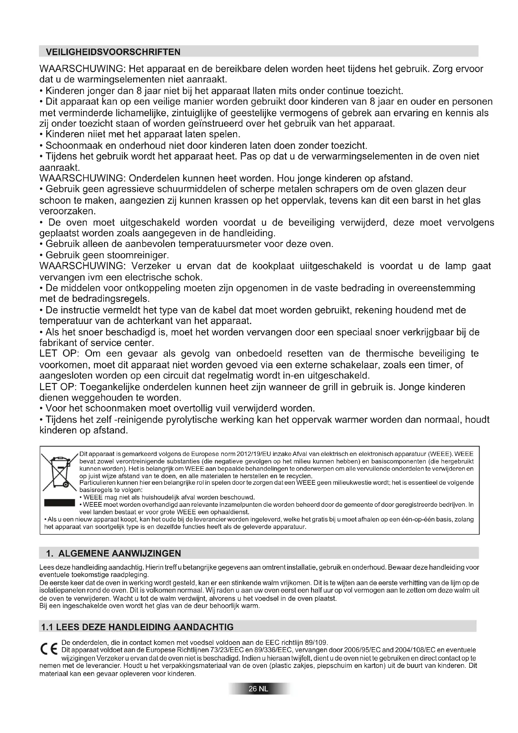 Lees deze handleiding aandachtig. Hierin treff u betangrijke gegevens aan omtrent installatie, gebruik en onderhoud. Bewaar deze handleiding voor eventuele toekomstige raadpleging. De eerste keer dat de oven in werking wordt gesteld, kan er een stinkende walm vrijkomen. Dit is te wijten aan de eerste verhitting van de lijm op de isolatiepanelen rond de oven. Dit is volkomen normaal. Wij raden u aan uw oven eerst een half uur op vol vermogen aan te zetten om deze walm uit de oven te verwijderen. Wacht u tot de walm verdwijnt, alvorens u het voedsel in de oven plaatst. Bij een ingeschakelde oven wordt het glas van de deur behoorlijk warm. De onderdelen, die in contact komen met voedsel voldoen aan de EEC richtlijn 89/109. Dit apparaat voldoet aan de Europese Richtlijnen 73/23/EEC en 89/336/EEC, vervangen door 2006/95/EC and 2004/108/EC en eventuele wijzigingen Verzeker u ervan dat de oven niet is beschadigd. Indien u hieraan twijfelt, dient u de oven niet te gebruiken en direct contact op te nemen met de leverancier. Houdt u het verpakkingsmateriaal van de oven (plastic zakjes, piepschuim en karton) uit de buurt van kinderen. Dit materiaal kan een gevaar opleveren voor kinderen.