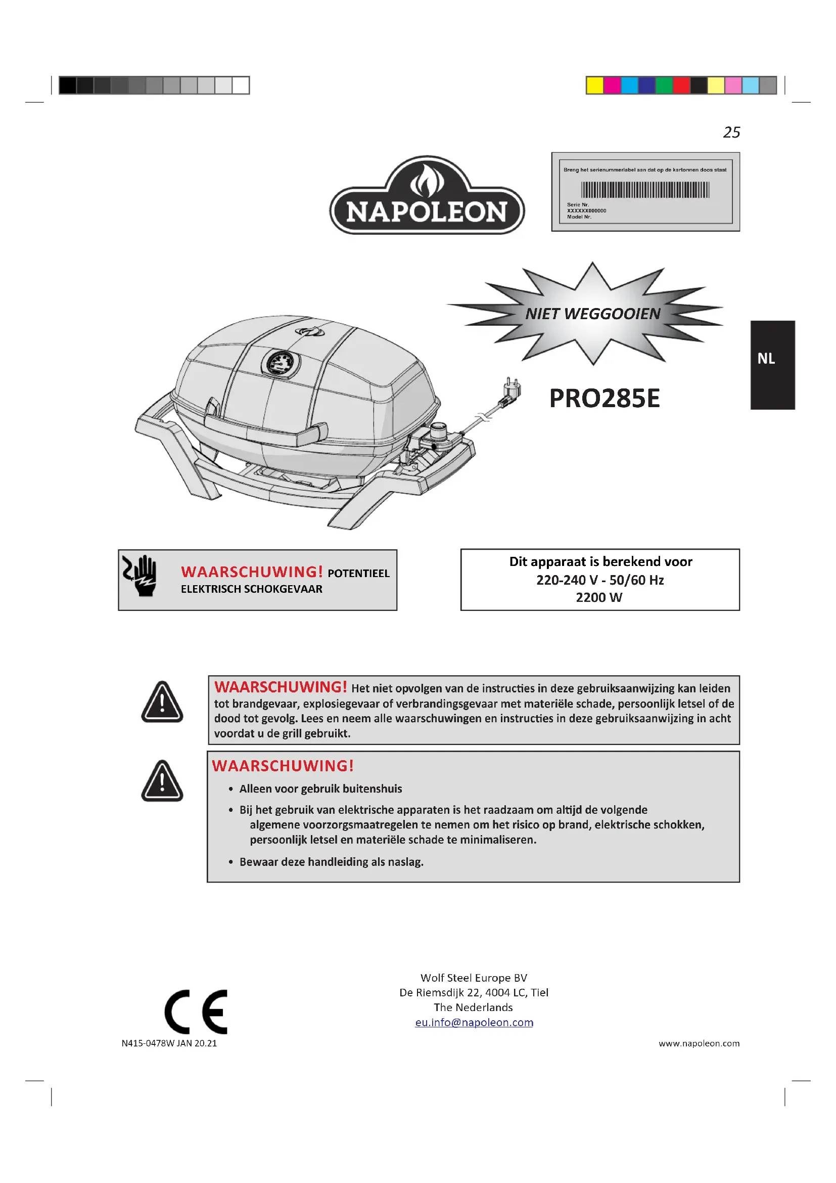 Breng het serienummerlabel aan dat op de kartonnen doos staat Serie Nr. XXXXXX000000Model Nr. NIET WEGGOOIEN Wolf Steel Europe BVDe Riemsdijk 22, 4004 LC, TielThe Nederlandseu.info@napoleon.com WAARSCHUWING! POTENTIEEL ELEKTRISCH SCHOKGEVAAR Dit apparaat is berekend voor 220-240 V - 50/60 Hz 2200 W PRO285E WAARSCHUWING! Het niet opvolgen van de instruces in deze gebruiksaanwijzing kan leiden tot brandgevaar, explosiegevaar of verbrandingsgevaar met materiële schade, persoonlijk letsel of de dood tot gevolg. Lees en neem alle waarschuwingen en instruces in deze gebruiksaanwijzing in acht voordat u de grill gebruikt. WAARSCHUWING!