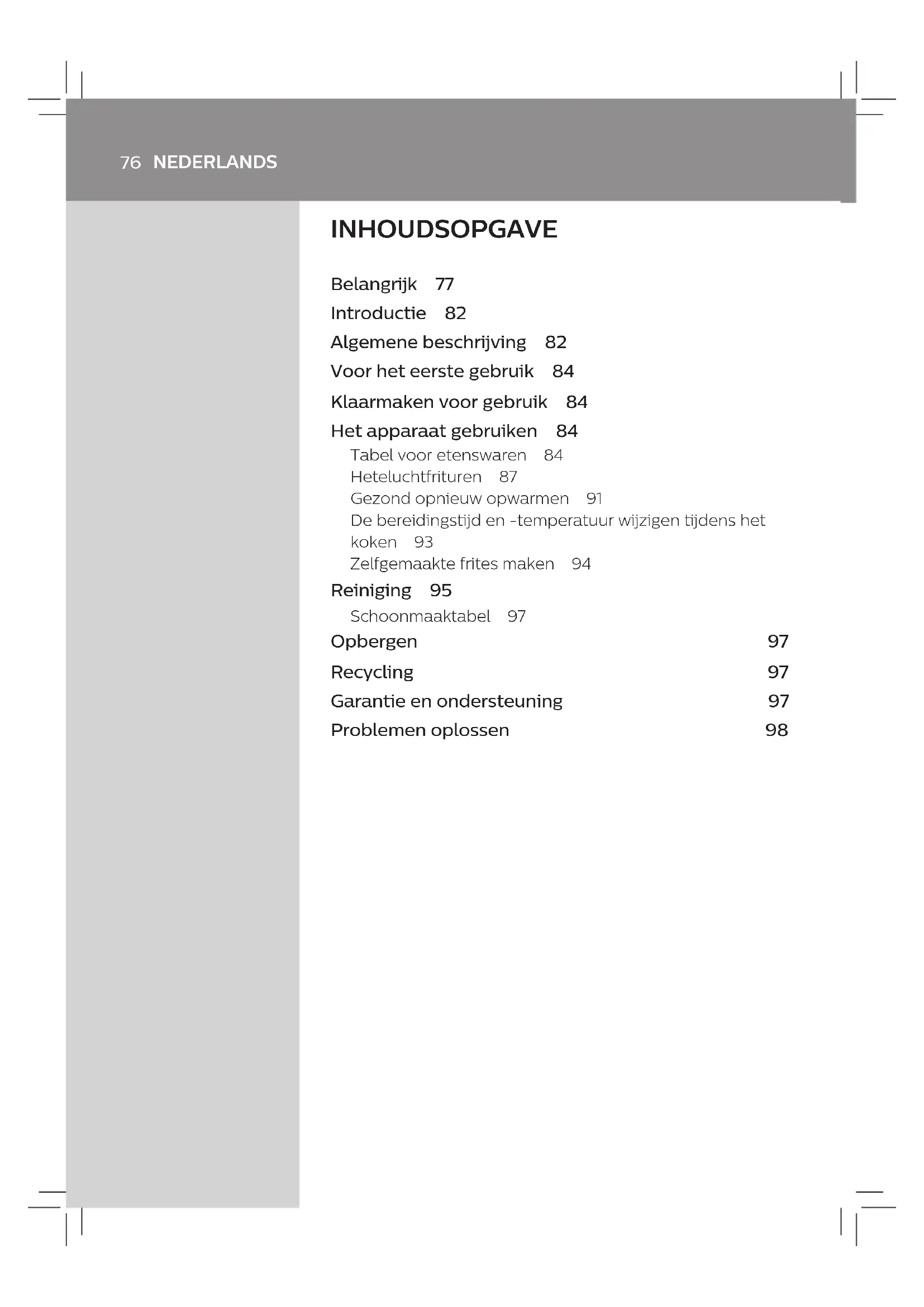 - Assurez-vous toujours que les pièces amovibles de l'Airfryer sont xées avant de transporter et/ou de ranger l'appareil. Recyclage - Ce symbole signie que ce produit ne doit pas être mis au rebut avec les ordures ménagères (2012/19/UE). - Respectez les règles en vigueur dans votre pays pour la mise au rebut des produits électriques et électroniques. Une mise au rebut correcte contribue à préserver l'environnement et la santé. Garantie et assistance Si vous avez besoin d'une assistance ou d'informations supplémentaires, consultez le site Web www.philips.com/support ou lisez le dépliant séparé sur la garantie internationale.74 FRANÇAIS Dépannage Cette rubrique présente les problèmes les plus courants que vous pouvez rencontrer avec votre appareil. Si vous ne parvenez pas à résoudre le problème à l'aide des informations ci-dessous, rendez-vous sur www.philips.com/support pour consulter les questions fréquemment posées ou contactez le Service Consommateurs de votre pays. Problème Cause possible Solution L'extérieur de l'appareil devient chaud en cours d'utilisation. La chaleur interne chaue les parois extérieures. Ce phénomène est normal. Tous les boutons et poignées que vous êtes amené(e) à toucher pendant l'utilisation resteront susamment froids pour que vous puissiez les toucher. Lorsque l'appareil est allumé, la cuve, le panier et l'intérieur de l'appareil deviennent toujours chauds, an d'assurer une cuisson correcte des aliments. Ces pièces sont toujours trop chaudes pour que vous puissiez les toucher. Si vous laissez l'appareil allumé pendant longtemps, certaines zones seront très chaudes au toucher. L'icône suivante vous permet de reconnaître ces zones : À partir du moment où vous savez qu'il y a des zones très chaudes et que vous évitez de les toucher, l'appareil ne présente aucun danger. Mes frites maison ne sont pas comme je l'espérais. Vous n'avez pas utilisé la bonne variété de pommes de terre. Pour obtenir les meilleurs résultats, utilisez des pommes de terre fraîches farineuses. Si vous avez besoin de conserver les pommes de terre, ne les placez pas en milieu froid comme un réfrigérateur. Choisissez des pommes de terre pour lesquelles il est indiqué sur l'emballage qu'elles conviennent à la friture. La quantité d'aliments dans le panier est trop importante. Suivez les instructions de ce manuel d'utilisation pour préparer des frites maison. Certains types d'aliments doivent être mélangés à mi-cuisson. Suivez les instructions de ce manuel d'utilisation pour préparer des frites maison. L'Airfryer ne s'allume pas. L'appareil n'est pas branché. Vériez si la che est correctement insérée dans la prise secteur.75 FRANÇAIS Problème Cause possible Solution Plusieurs appareils sont branchés sur une même prise. L'Airfryer est très puissant. Essayez une autre prise et vériez les fusibles. Je vois des éraures dans mon Airfryer. De petites taches peuvent apparaître dans la cuve de l'Airfryer suite à un contact accidentel avec le revêtement (par exemple en nettoyant avec des outils de nettoyage durs et/ou en insérant le panier). Vous pouvez éviter ces éraures en abaissant correctement le panier dans la cuve. Si vous insérez le panier de travers, le côté peut taper contre la paroi de la cuve et abîmer le revêtement. Si cela se produit, sachez que ce n'est pas nocif car tous les matériaux utilisés sont sûrs pour les aliments. De la fumée blanche s'échappe de l'appareil. Vous faites cuire des aliments riches en matières grasses. Videz avec précaution l'excédent d'huile ou de graisse de la cuve et poursuivez la cuisson. La cuve contient des résidus de graisse de l'utilisation précédente. La fumée blanche est causée par la cuisson de résidus de graisse dans la cuve. Nettoyez soigneusement la cuve et le panier après chaque utilisation. La chapelure n'adhère pas correctement aux aliments. De petits morceaux de chapelure peuvent provoquer un dégagement de fumée blanche. Appuyez bien la chapelure sur aliments an qu'elle adhère. Il y a des éclaboussures de marinade, de liquide ou de jus de viande dans la graisse fondue ou l'huile. Épongez les aliments avant de les placer dans le panier. Mon écran ache 6 tirets pendant la cuisson. La fonction de sécurité a été activée en raison de la surchaue de l'appareil. Débranchez l'appareil et laissez-le refroidir pendant 1 minute avant de le rebrancher. Mon écran ache 6 tirets une fois l'appareil débranché depuis une minute. Le dispositif de sécurité a été activé. Appelez la hot line de la SAV Philips ou contactez le Service Consommateurs de votre pays.76 NEDERLANDS INHOUDSOPGAVE Belangrijk 77 Introductie 82 Algemene beschrijving 82 Voor het eerste gebruik 84 Klaarmaken voor gebruik 84 Het apparaat gebruiken 84 Tabel voor etenswaren 84 Heteluchtfrituren 87 Gezond opnieuw opwarmen 91 De bereidingstijd en -temperatuur wijzigen tijdens het koken 93 Zelfgemaakte frites maken 94 Reiniging 95 Schoonmaaktabel 97 Opbergen 97 Recycling 97 Garantie en ondersteuning 97 Problemen oplossen 9877 NEDERLANDS Belangrijk Lees deze belangrijke informatie zorgvuldig door voordat u het apparaat gaat gebruiken. Bewaar het boekje om het indien nodig later te kunnen raadplegen. Gevaar - Doe de etenswaren die u wilt bakken altijd in de mand om te voorkomen dat ze met de verwarmingselementen in contact komen. - Bedek de luchtinlaat- en -uitlaatopeningen niet wanneer het apparaat in gebruik is. - Vul de pan niet met olie, want dit kan brandgevaar veroorzaken. - Dompel het apparaat nooit in water of een andere vloeistof en spoel het ook niet af onder de kraan. - Zorg dat er geen water of een andere vloeistof in het apparaat terechtkomt om een elektrische schok te voorkomen. - Overschrijd nooit het maximumniveau dat is aangegeven in de mand. - Raak nooit de binnenkant van het apparaat aan wanneer het is ingeschakeld. Waarschuwing - Controleer of het voltage dat wordt aangeg