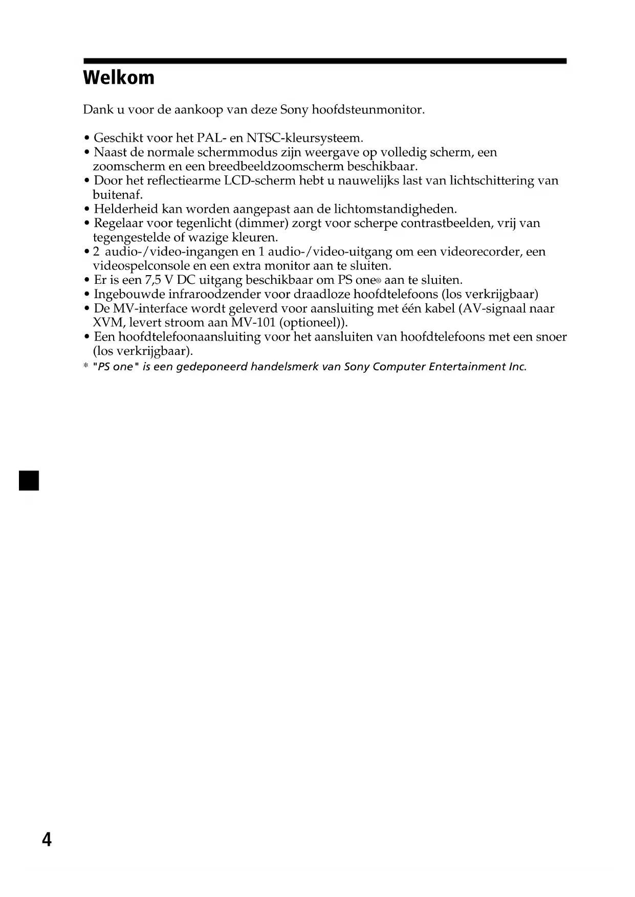 - "PS one" is een gedeponeerd handelsmerk van Sony Computer Entertainment Inc. GND (1 m) Zwart AV-Kabel (audio/video geïntegreerd) (los verkrijgbaar)18 Voor de Klanten in NederlandGooi de batterij niet weg maar lever deze in als klein chemisch afval (KCA).