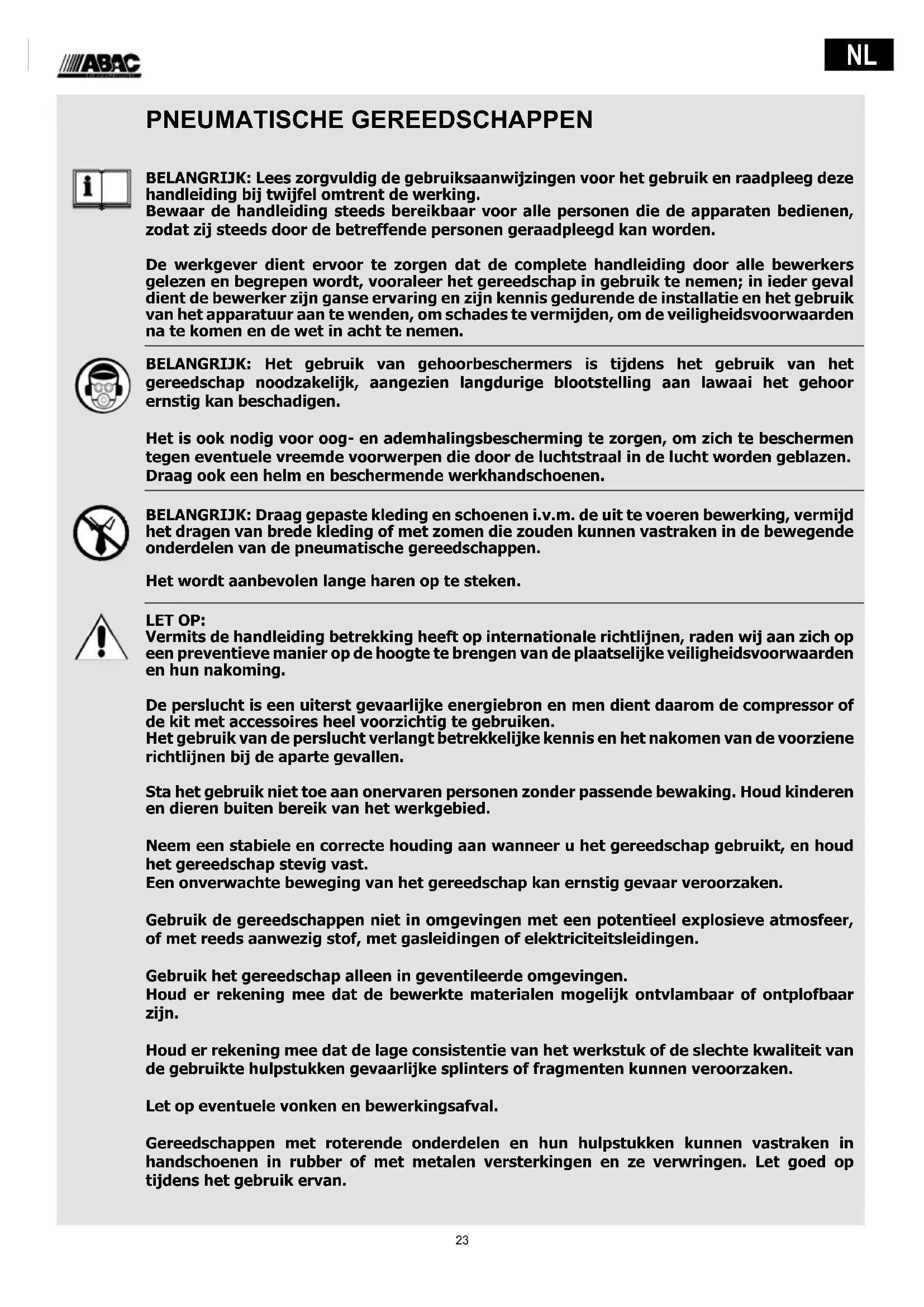 PNEUMATISCHE GEREEDSCHAPPEN BELANGRIJK: Lees zorgvuldig de gebruiksaanwijzingen voor het gebruik en raadpleeg deze handleiding bij twijfel omtrent de werking. Bewaar de handleiding steeds bereikbaar voor alle personen die de apparaten bedienen, zodat zij steeds door de betreffende personen geraadpleegd kan worden. De werkgever dient ervoor te zorgen dat de complete handleiding door alle bewerkers gelezen en begrepen wordt, vooraleer het gereedschap in gebruik te nemen; in ieder geval dient de bewerker zijn ganse ervaring en zijn kennis gedurende de installatie en het gebruik van het apparatuur aan te wenden, om schades te vermijden, om de veiligheidsvoorwaarden na te komen en de wet in acht te nemen. BELANGRIJK: Het gebruik van gehoorbeschermers is tijdens het gebruik van het gereedschap noodzakelijk, aangezien langdurige blootstelling aan lawaai het gehoor ernstig kan beschadigen. Het is ook nodig voor oog- en ademhalingsbescherming te zorgen, om zich te beschermen tegen eventuele vreemde voorwerpen die door de luchtstraal in de lucht worden geblazen. Draag ook een helm en beschermende werkhandschoenen. BELANGRIJK: Draag gepaste kleding en schoenen i.v.m. de uit te voeren bewerking, vermijd het dragen van brede kleding of met zomen die zouden kunnen vastraken in de bewegende onderdelen van de pneumatische gereedschappen. Het wordt aanbevolen lange haren op te steken. LET OP: Vermits de handleiding betrekking heeft op internationale richtlijnen, raden wij aan zich op een preventieve manier op de hoogte te brengen van de plaatselijke veiligheidsvoorwaarden en hun nakoming. De perslucht is een uiterst gevaarlijke energiebron en men dient daarom de compressor of de kit met accessoires heel voorzichtig te gebruiken. Het gebruik van de perslucht verlangt betrekkelijke kennis en het nakomen van de voorziene richtlijnen bij de aparte gevallen. Sta het gebruik niet toe aan onervaren personen zonder passende bewaking. Houd kinderen en dieren buiten bereik van het werkgebied. Neem een stabiele en correcte houding aan wanneer u het gereedschap gebruikt, en houd het gereedschap stevig vast. Een onverwachte beweging van het gereedschap kan ernstig gevaar veroorzaken. Gebruik de gereedschappen niet in omgevingen met een potentieel explosieve atmosfeer, of met reeds aanwezig stof, met gasleidingen of elektriciteitsleidingen. Gebruik het gereedschap alleen in geventileerde omgevingen. Houd er rekening mee dat de bewerkte materialen mogelijk ontvlambaar of ontplofbaar zijn. Houd er rekening mee dat de lage consistentie van het werkstuk of de slechte kwaliteit van de gebruikte hulpstukken gevaarlijke splinters of fragmenten kunnen veroorzaken. Let op eventuele vonken en bewerkingsafval. Gereedschappen met roterende onderdelen en hun hulpstukken kunnen vastraken in handschoenen in rubber of met metalen versterkingen en ze verwringen. Let goed op tijdens het gebruik ervan.24