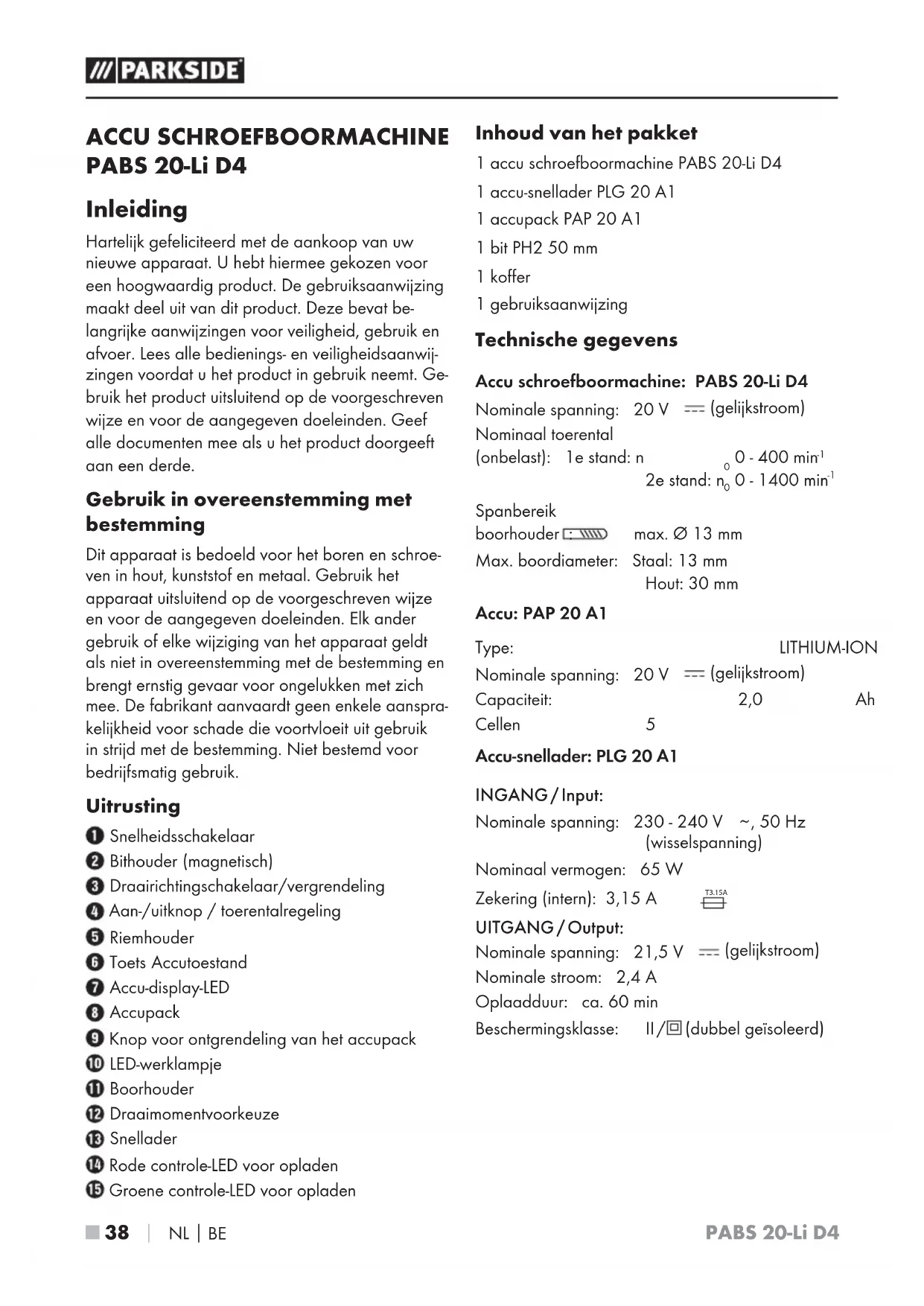 ACCU SCHROEFBOORMACHINE PABS 20-Li D4 Inleiding Hartelijk gefeliciteerd met de aankoop van uw nieuwe apparaat. U hebt hiermee gekozen voor een hoogwaardig product. De gebruiksaanwijzing maakt deel uit van dit product. Deze bevat be- langrijke aanwijzingen voor veiligheid, gebruik en afvoer. Lees alle bedienings- en veiligheidsaanwij- zingen voordat u het product in gebruik neemt. Ge- bruik het product uitsluitend op de voorgeschreven wijze en voor de aangegeven doeleinden. Geef alle documenten mee als u het product doorgeeft aan een derde. Gebruik in overeenstemming met bestemming Dit apparaat is bedoeld voor het boren en schroe- ven in hout, kunststof en metaal. Gebruik het apparaat uitsluitend op de voorgeschreven wijze en voor de aangegeven doeleinden. Elk ander gebruik of elke wijziging van het apparaat geldt als niet in overeenstemming met de bestemming en brengt ernstig gevaar voor ongelukken met zich mee. De fabrikant aanvaardt geen enkele aanspra- kelijkheid voor schade die voortvloeit uit gebruik in strijd met de bestemming. Niet bestemd voor bedrijfsmatig gebruik. Uitrusting Snelheidsschakelaar Bithouder (magnetisch) Draairichtingschakelaar/vergrendeling Aan-/uitknop / toerentalregeling Riemhouder Toets Accutoestand Accu-display-LED Accupack Knop voor ontgrendeling van het accupack LED-werklampje Boorhouder Draaimomentvoorkeuze Snellader Rode controle-LED voor opladen Groene controle-LED voor opladen Inhoud van het pakket 1 accu schroefboormachine PABS 20-Li D4 1 accu-snellader PLG 20 A1 1 accupack PAP 20 A1 1 bit PH2 50 mm 1 koffer 1 gebruiksaanwijzing Technische gegevens Accu schroefboormachine: PABS 20-Li D4 Nominale spanning: 20 V (gelijkstroom) Nominaal toerental (onbelast): 1e stand: n