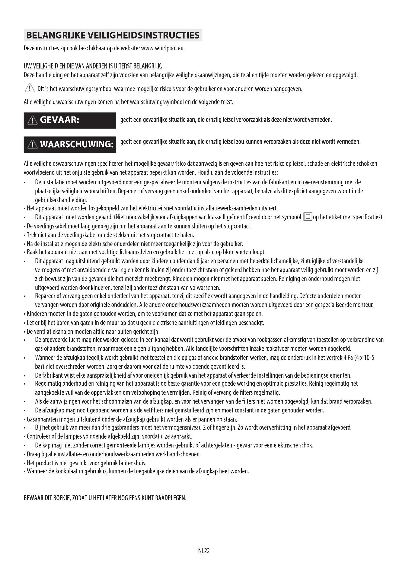 - Wanneer de kookplaat in gebruik is, kunnen de toegankelijke delen van de afzuigkap heet worden. BEWAAR DIT BOEKJE, ZODAT U HET LATER NOG EENS KUNT RAADPLEGEN. WAARSCHUWING: GEVAAR: NL22Controleer het apparaat, nadat u het hebt uitgepakt, op eventuele transportschade. Neem in geval van problemen contact op met de dealer of de dichtstbijzijnde Klantenservice. Om eventuele schade te voorkomen wordt geadviseerd om de oven pas vlak voor de installatie van de piepschuim bodem te halen.
