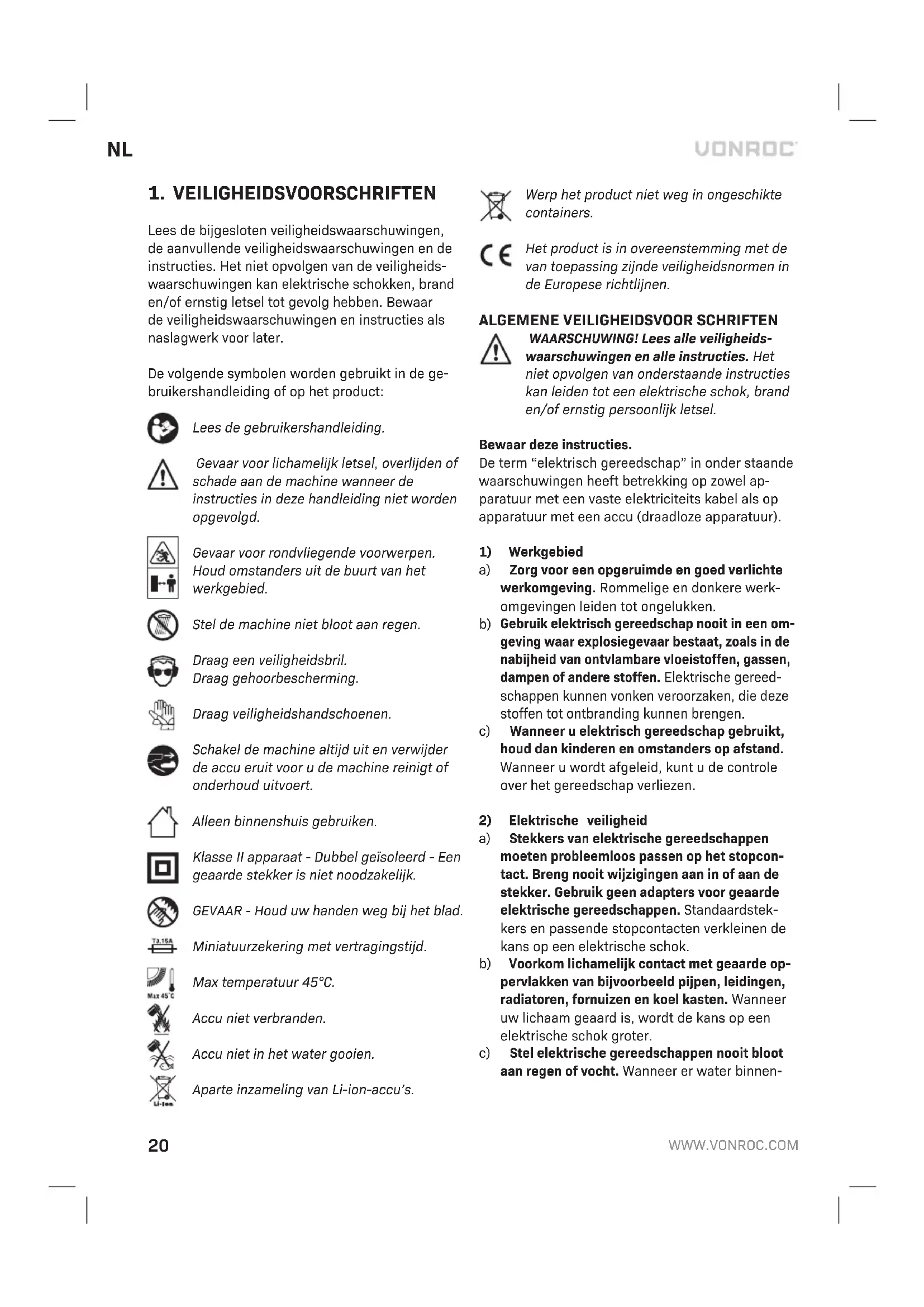 a) Open de accu niet. Er bestaat gevaar voor kort- sluiting. b) Bescherm de accu tegen hitte, bijvoorbeeld ook tegen voortdurend zonlicht, vuur, water en vocht. Er bestaat explosiegevaar. c) Bij beschadiging en onjuist gebruik van de accu kunnen er dampen vrijkomen. Zorg voor frisse lucht en raadpleeg bij klachten een arts. De dampen kunnen de lucht wegen irriteren. d) Gebruik de accu alleen in combinatie met uw Vonroc product. Alleen zo wordt de accu tegen gevaarlijke over belasting beschermd. e) Door scherpe voorwerpen, zoals bijv. spijkers of schroevendraaiers of door krachtinwerking van buitenaf kan de accu beschadigd worden. Het kan tot een interne kortsluiting leiden en de accu doen branden, roken, exploderen of oververhitten.