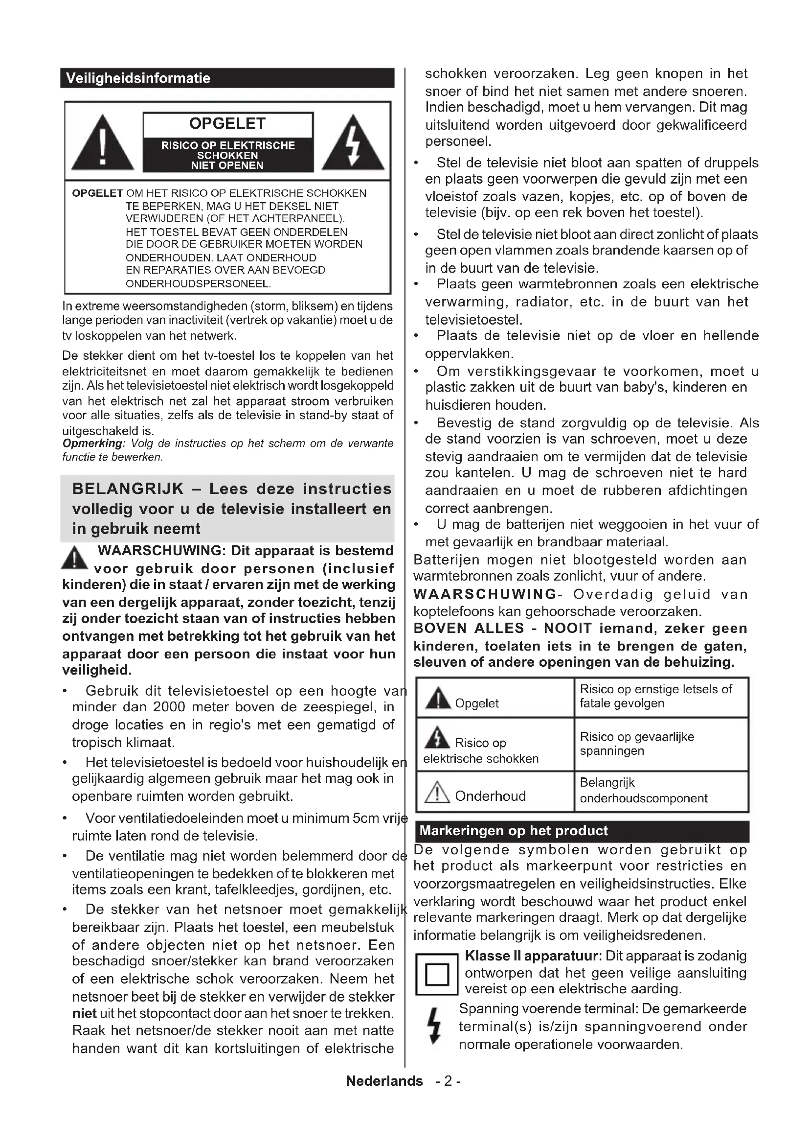- U mag de batterijen niet weggooien in het vuur of met gevaarlijk en brandbaar materiaal. Batterijen mogen niet blootgesteld worden aan warmtebronnen zoals zonlicht, vuur of andere. WAARSCHUWING- Overdadig geluid van koptelefoons kan gehoorschade veroorzaken. BOVEN ALLES - NOOIT iemand, zeker geen kinderen, toelaten iets in te brengen de gaten, sleuven of andere openingen van de behuizing. Opgelet Risico op ernstige letsels of fatale gevolgen Risico op elektrische schokken Risico op gevaarlijke spanningen Onderhoud Belangrijk onderhoudscomponent Markeringen op het product De volgende symbolen worden gebruikt op het product als markeerpunt voor restricties en voorzorgsmaatregelen en veiligheidsinstructies. Elke verklaring wordt beschouwd waar het product enkel relevante markeringen draagt. Merk op dat dergelijke informatie belangrijk is om veiligheidsredenen. Klasse II apparatuur: Dit apparaat is zodanig ontworpen dat het geen veilige aansluiting vereist op een elektrische aarding. Spanning voerende terminal: De gemarkeerde terminal(s) is/zijn spanningvoerend onder normale operationele voorwaarden.Nederlands - 3 -
