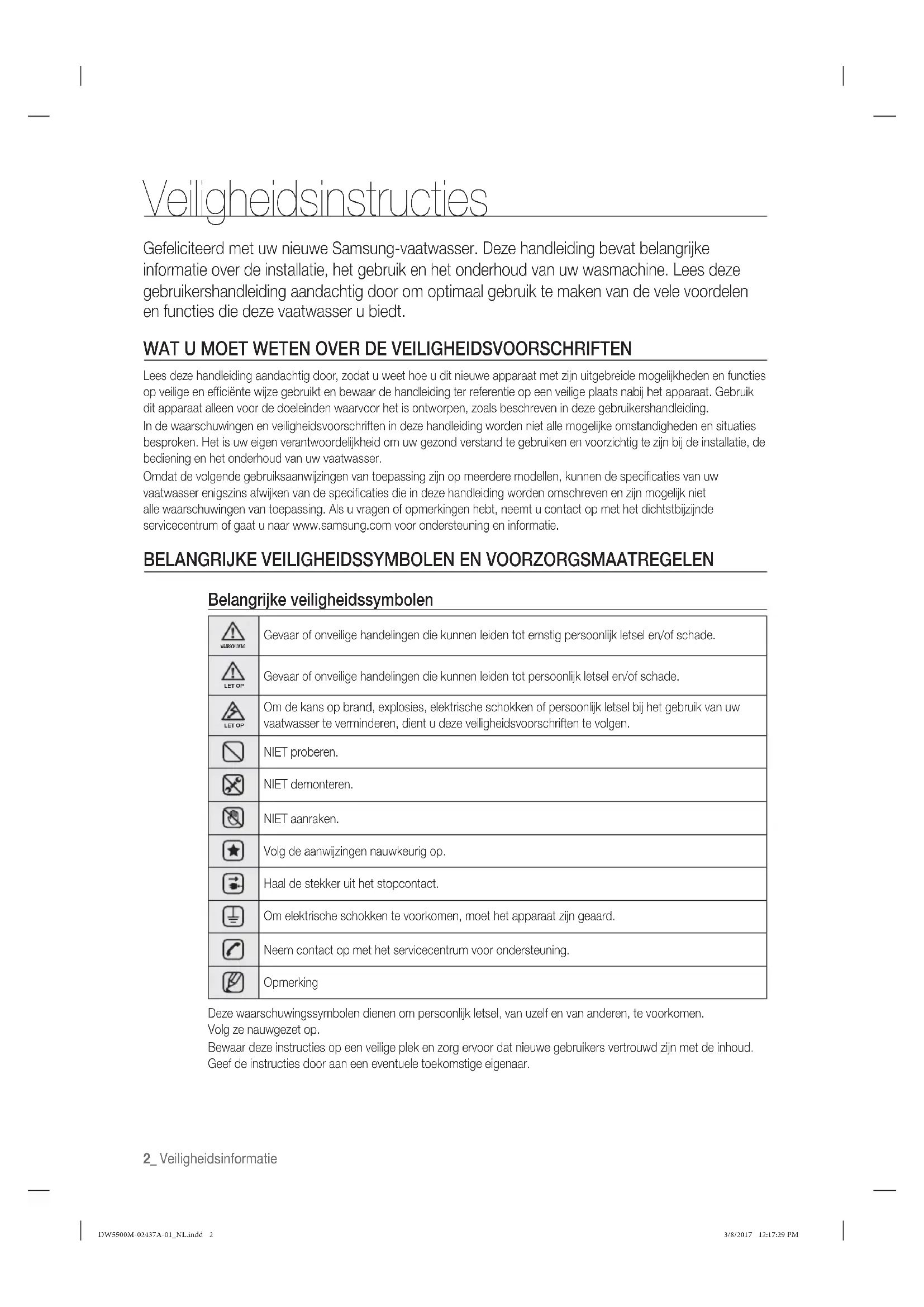 Belangrijke veiligheidssymbolen WAARSCHUWING Gevaar of onveilige handelingen die kunnen leiden tot ernstig persoonlijk letsel en/of schade. LET OP Gevaar of onveilige handelingen die kunnen leiden tot persoonlijk letsel en/of schade. LET OP Om de kans op brand, explosies, elektrische schokken of persoonlijk letsel bij het gebruik van uw vaatwasser te verminderen, dient u deze veiligheidsvoorschriften te volgen. NIET proberen. NIET demonteren. NIET aanraken. Volg de aanwijzingen nauwkeurig op. Haal de stekker uit het stopcontact. Om elektrische schokken te voorkomen, moet het apparaat zijn geaard. Neem contact op met het servicecentrum voor ondersteuning. Opmerking Deze waarschuwingssymbolen dienen om persoonlijk letsel, van uzelf en van anderen, te voorkomen. Volg ze nauwgezet op. Bewaar deze instructies op een veilige plek en zorg ervoor dat nieuwe gebruikers vertrouwd zijn met de inhoud. Geef de instructies door aan een eventuele toekomstige eigenaar. DW5500M-02437A-00_NL.indd 2DW5500M-02437A-01_NL.indd 2 3/8/2017 12:17:29 PM3/8/2017 12:17:29 PMVeiligheidsinformatie _3 Om de kans op brand, elektrische schokken of persoonlijk letsel bij het gebruik van uw apparaat te verminderen, dient u de veiligheidsvoorschriften te volgen, waaronder de volgende: