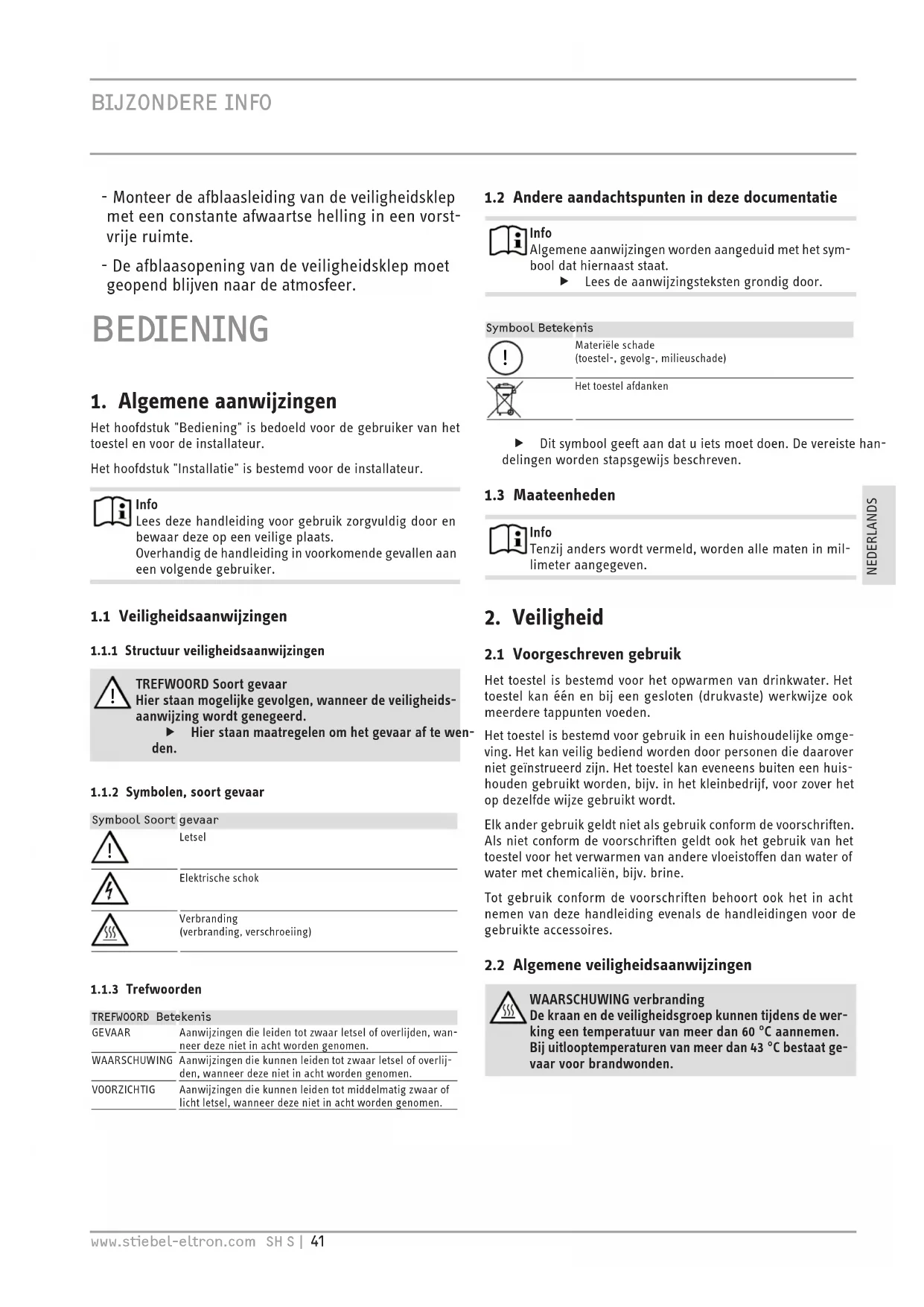 BZONDERE INFO - Het toestel kan door kinderen vanaf 3 jaar, als- mede door personen met verminderde fysieke, sensorische of geestelijke vermogens of met een gebrek aan ervaring en kennis gebruikt worden, wanneer er toezicht op hen gehouden wordt, of wanneer ze met betrekking tot het veilige gebruik van het toestel geïnstrueerd zijn en de gevaren die daaruit ontstaan, begrepen hebben. Kinderen in de leeftijd van 3 tot 8 jaar mogen alleen de kraan bedienen die op het toestel aangesloten is. Kinderen mogen niet met het toestel spelen. Kinderen mogen zonder toezicht geen reiniging of gebruikersonderhoud uitvoeren. - De aansluiting op het stroomnet is enkel als vaste aansluiting toegestaan in combinatie met de uit- neembare kabeldoorvoer. Het toestel moet op alle polen met een afstand van minstens 3mm van de aansluiting van het net kunnen worden losgekoppeld. - Monteer het toestel zoals dat in de hoofdstukken "Installatie/voorbereidingen" en "Installatie/mon- tage/montage van het toestel" beschreven is. - Houd rekening met de minimale en maximale inlaatwaterdruk (zie hoofdstuk "Installatie/techni- sche gegevens/gegevenstabel"). - Tap het toestel af zoals beschreven in het hoofd- stuk "Installatie/onderhoud/het toestel aftappen". - Installeer een reststroom-veiligheidsapparaat (RCD). Gesloten werkwijze: - Het toestel staat onder druk. Tijdens verwarming druppelt expansiewater uit de veiligheidsklep. - Stel periodiek de veiligheidsklep in werking, zodat vastzitten, bijv. door kalkafzettingen, voor- komen wordt. - Monteer een type-gekeurde veiligheidsklep in de koudwateraanvoerleiding. Let erop dat daarvoor, afhankelijk van de statische druk, eventueel ook een reduceerafsluiter nodig is. - Dimensioneer de afvoerleiding op een wijze dat het water bij volledig geopende veiligheidsklep ongehinderd kan worden afgevoerd.NEDERLANDSwww.stiebel-eltron.com SH S | 41 BZONDERE INFO - Monteer de afblaasleiding van de veiligheidsklep met een constante afwaartse helling in een vorst-vrije ruimte. - De afblaasopening van de veiligheidsklep moet geopend blijven naar de atmosfeer. BEDIENING