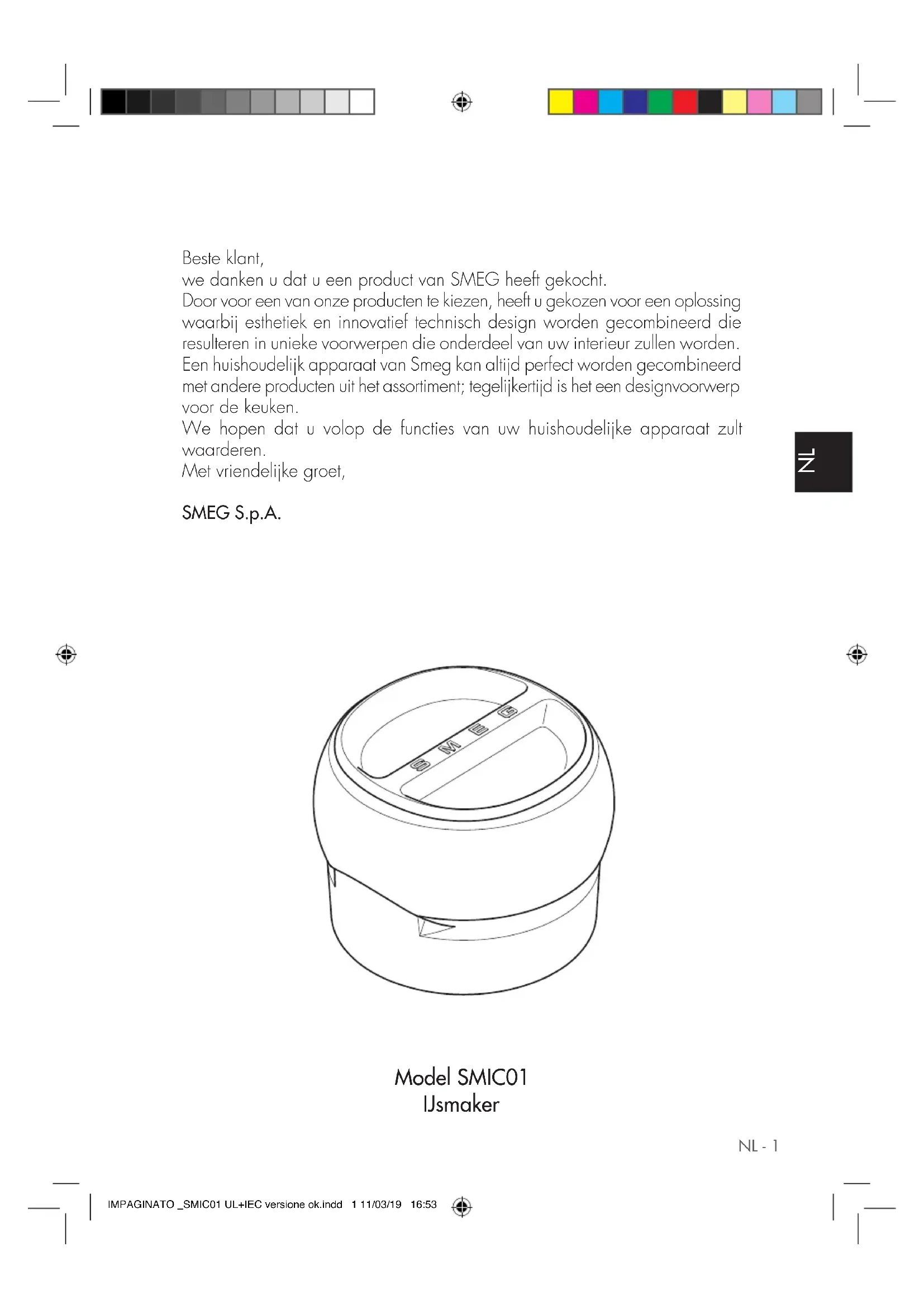 - Die Schüssel solange in den Kühlschrank stellen, bis die Eismischung die Kühlschranktemperatur erreicht hat. IMPAGINATO _SMIC01 UL+IEC versione ok.indd 7 11/03/19 16:538 - DE IMPAGINATO _SMIC01 UL+IEC versione ok.indd 8 11/03/19 16:53NL NL - 1 Beste klant, we danken u dat u een product van SMEG heeft gekocht. Door voor een van onze producten te kiezen, heeft u gekozen voor een oplossing waarbij esthetiek en innovatief technisch design worden gecombineerd die resulteren in unieke voorwerpen die onderdeel van uw interieur zullen worden. Een huishoudelijk apparaat van Smeg kan altijd perfect worden gecombineerd met andere producten uit het assortiment; tegelijkertijd is het een designvoorwerp voor de keuken. We hopen dat u volop de functies van uw huishoudelijke apparaat zult waarderen. Met vriendelijke groet, SMEG S.p.A. Model SMIC01 IJsmaker IMPAGINATO _SMIC01 UL+IEC versione ok.indd 1 11/03/19 16:532 - NL Waarschuwingen VEILIGHEID Belangrijke veiligheidsaanwijzingen Gebruik de ijsmaker uitsluitend in combinatie met de keukenmachine uit het assortiment SMF van de fabrikant. Raadpleeg de gebruiksaanwijzing die samen met het huishoudelijke apparaat is geleverd voor alle informatie over het gebruik van de keukenmachine.