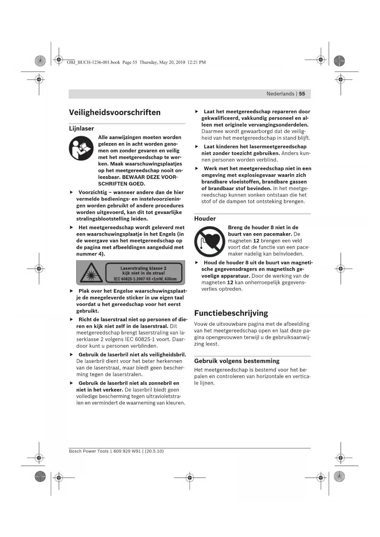 Veiligheidsvoorschriften Lijnlaser Alle aanwijzingen moeten worden gelezen en in acht worden geno- men om zonder gevaren en veilig met het meetgereedschap te wer- ken. Maak waarschuwingsplaatjes op het meetgereedschap nooit on- leesbaar. BEWAAR DEZE VOOR- SCHRIFTEN GOED. f Voorzichtig – wanneer andere dan de hier vermelde bedienings- en instelvoorzienin- gen worden gebruikt of andere procedures worden uitgevoerd, kan dit tot gevaarlijke stralingsblootstelling leiden. f Het meetgereedschap wordt geleverd met een waarschuwingsplaatje in het Engels (in de weergave van het meetgereedschap op de pagina met afbeeldingen aangeduid met nummer 4). f Plak over het Engelse waarschuwingsplaat- je de meegeleverde sticker in uw eigen taal voordat u het gereedschap voor het eerst gebruikt. f Richt de laserstraal niet op personen of die- ren en kijk niet zelf in de laserstraal. Dit meetgereedschap brengt laserstraling van la- serklasse 2 volgens IEC 60825-1 voort. Daar- door kunt u personen verblinden. f Gebruik de laserbril niet als veiligheidsbril. De laserbril dient voor het beter herkennen van de laserstraal, maar biedt geen bescher- ming tegen de laserstralen. f Gebruik de laserbril niet als zonnebril en niet in het verkeer. De laserbril biedt geen volledige bescherming tegen ultravioletstra- len en vermindert de waarneming van kleuren. f Laat het meetgereedschap repareren door gekwalificeerd, vakkundig personeel en al- leen met originele vervangingsonderdelen. Daarmee wordt gewaarborgd dat de veilig- heid van het meetgereedschap in stand blijft. f Laat kinderen het lasermeetgereedschap niet zonder toezicht gebruiken. Anders kun- nen personen worden verblind. f Werk met het meetgereedschap niet in een omgeving met explosiegevaar waarin zich brandbare vloeistoffen, brandbare gassen of brandbaar stof bevinden. In het meetge- reedschap kunnen vonken ontstaan die het stof of de dampen tot ontsteking brengen. Houder Breng de houder 8 niet in de buurt van een pacemaker. De magneten 12 brengen een veld voort dat de functie van een pace- maker nadelig kan beïnvloeden. f Houd de houder 8 uit de buurt van magneti- sche gegevensdragers en magnetisch ge- voelige apparatuur. Door de werking van de magneten 12 kan onherroepelijk gegevens- verlies optreden. Functiebeschrijving Vouw de uitvouwbare pagina met de afbeelding van het meetgereedschap open en laat deze pa- gina opengevouwen terwijl u de gebruiksaanwij- zing leest. Gebruik volgens bestemming Het meetgereedschap is bestemd voor het be- palen en controleren van horizontale en vertica- le lijnen. OBJ_BUCH-1236-001.book Page 55 Thursday, May 20, 2010 12:21 PM56 | Nederlands 1 609 929 W91 | (20.5.10) Bosch Power Tools Technische gegevens Afgebeelde componenten De componenten zijn genummerd zoals op de afbeelding van het meetgereedschap op de pa- gina met afbeeldingen. 1 Opening voor laserstraal 2 Statiefopname 1/4" 3 Aan/uit-schakelaar 4 Laser-waarschuwingsplaatje 5 Serienummer 6 Vergrendeling van het batterijvakdeksel 7 Deksel van batterijvak 8 Houder 9 Vastzetschroef van houder 10 Schroefgaten van houder 11 Riemgeleiding 12 Magneten 13 Statiefopname 1/4" op houder 14 Statiefopname 5/8" op houder 15 Beschermetui 16 Laserbril* 17 Meetplaat met voet* 18 Statief*