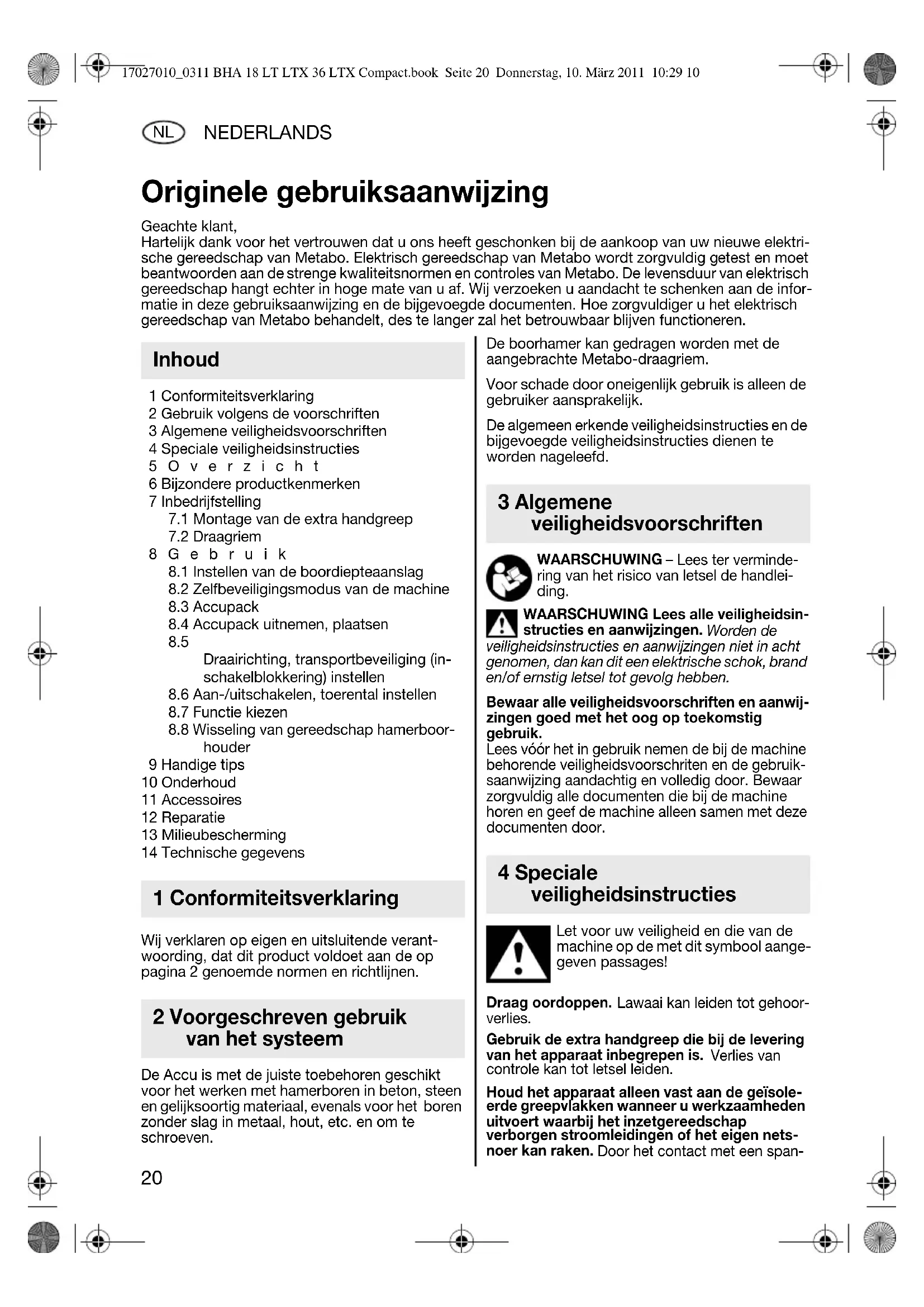 et voor uw veiligheid en die van de machine op de met dit symbool aange- geven passages! Draag oordoppen. Lawaai kan leiden tot gehoor- verlies. Gebruik de extra handgreep die bij de levering van het apparaat inbegrepen is. Verlies van controle kan tot letsel leiden. Houd het apparaat alleen vast aan de geïsole- erde greepvlakken wanneer u werkzaamheden uitvoert waarbij het inzetgereedschap verborgen stroomleidingen of het eigen nets- noer kan raken. Door het contact met een span- Originele gebruiksaanwijzing Geachte klant, Hartelijk dank voor het vertrouwen dat u ons heeft geschonken bij de aankoop van uw nieuwe elektri- sche gereedschap van Metabo. Elektrisch gereedschap van Metabo wordt zorgvuldig getest en moet beantwoorden aan de strenge kwaliteitsnormen en controles van Metabo. De levensduur van elektrisch gereedschap hangt echter in hoge mate van u af. Wij verzoeken u aandacht te schenken aan de infor- matie in deze gebruiksaanwijzing en de bijgevoegde documenten. Hoe zorgvuldiger u het elektrisch gereedschap van Metabo behandelt, des te langer zal het betrouwbaar blijven functioneren. Inhoud 1 Conformiteitsverklaring 2 Voorgeschreven gebruik van het systeem 3 Algemene veiligheidsvoorschriften 4 Speciale veiligheidsinstructies 17027010_0311 BHA 18 LT LTX 36 LTX Compact.book Seite 20 Donnerstag, 10. März 2011 10:29 10NEDERLANDS