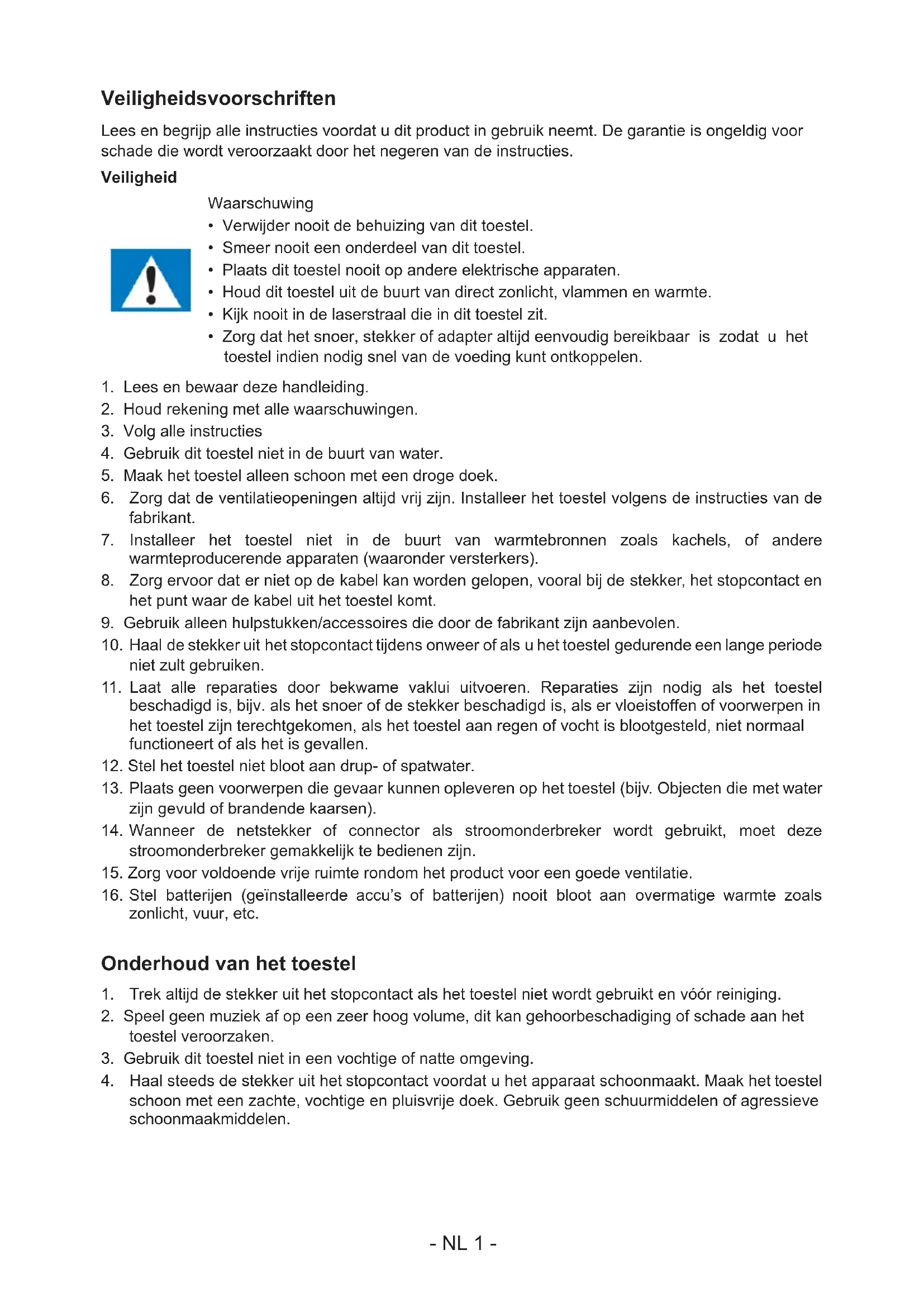 ALVORENS DEZE EENHEID TE BEDIENEN, EN BEWAAR DIT BOEKJE VOOR UW ADMINISTRATIE. NL- NL 1 - Veiligheidsvoorschriften Lees en begrijp alle instructies voordat u dit product in gebruik neemt. De garantie is ongeldig voor schade die wordt veroorzaakt door het negeren van de instructies. Veiligheid Waarschuwing