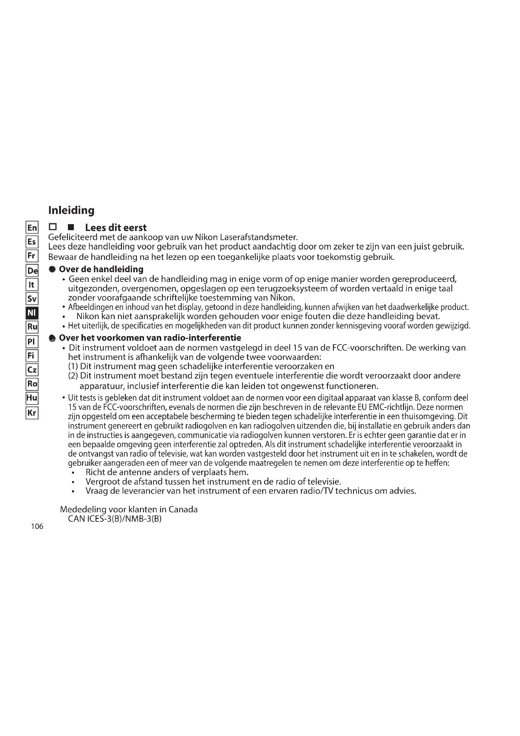 Inleiding Lees dit eerst Gefeliciteerd met de aankoop van uw Nikon Laserafstandsmeter. Lees deze handleiding voor gebruik van het product aandachtig door om zeker te zijn van een juist gebruik. Bewaar de handleiding na het lezen op een toegankelijke plaats voor toekomstig gebruik. l Over de handleiding