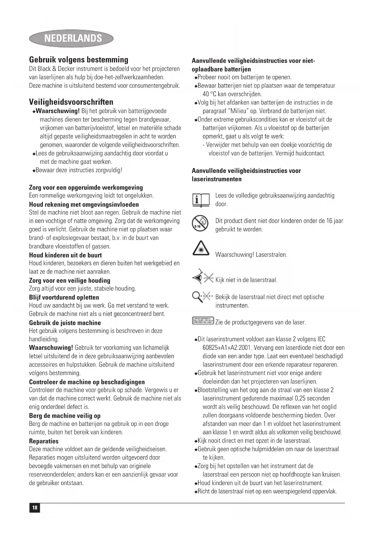 Dit Black & Decker instrument is bedoeld voor het projecteren van laserlijnen als hulp bij doe-het-zelfwerkzaamheden.