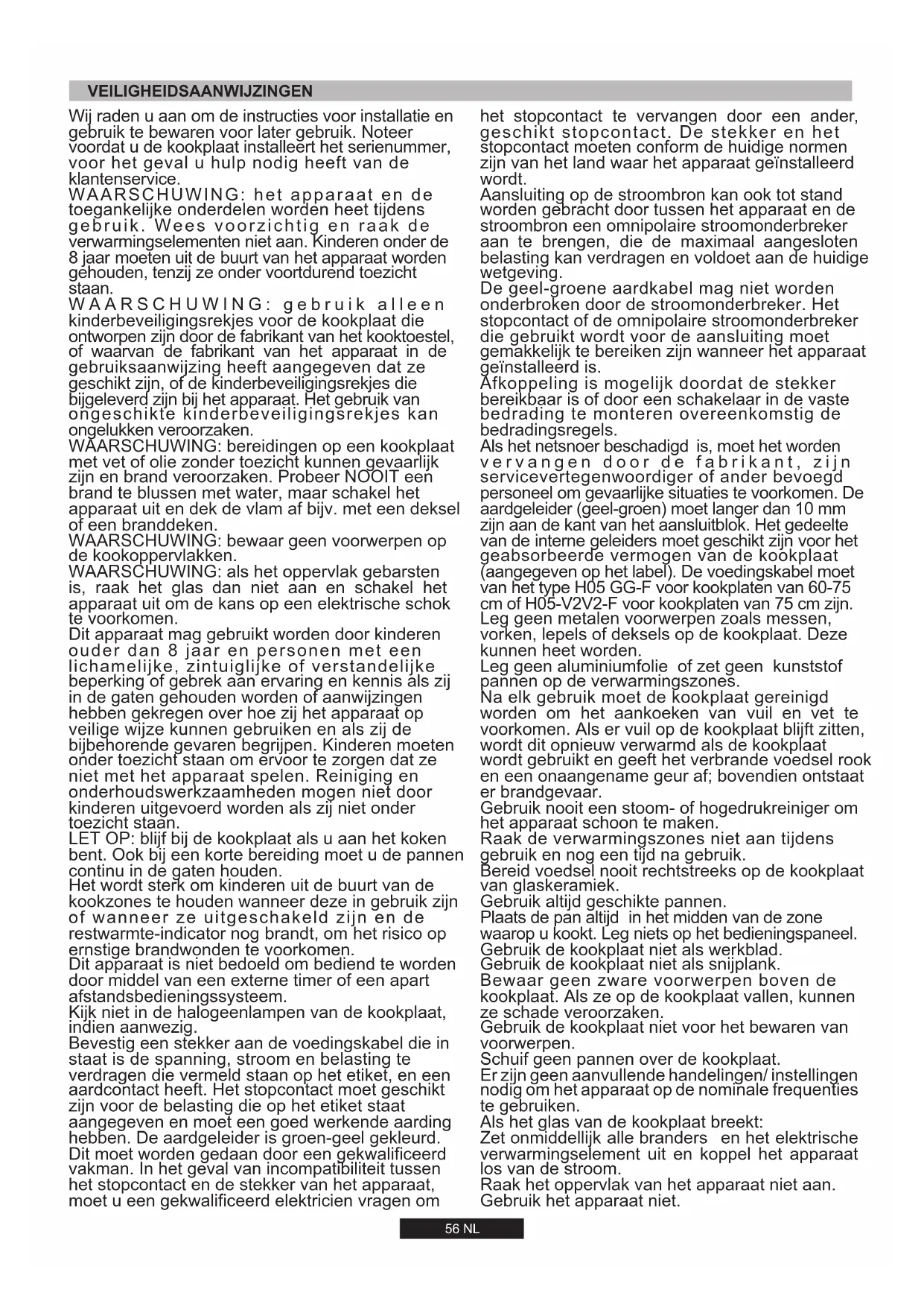 UR 3,5 kW56 NL Het wordt sterk om kinderen uit de buurt van de kookzones te houden wanneer deze in gebruik zijn of wanneer ze uitgeschakeld zijn en de restwarmte-indicator nog brandt, om het risico op ernstige brandwonden te voorkomen. Bevestig een stekker aan de voedingskabel die in staat is de spanning, stroom en belasting te verdragen die vermeld staan op het etiket, en een aardcontact heeft. Het stopcontact moet geschikt zijn voor de belasting die op het etiket staat aangegeven en moet een goed werkende aarding hebben. De aardgeleider is groen-geel gekleurd. Dit moet worden gedaan door een gekwalificeerd vakman. In het geval van incompatibiliteit tussen het stopcontact en de stekker van het apparaat, moet u een gekwalificeerd elektricien vragen om WAARSCHUWING: het apparaat en de toegankelijke onderdelen worden heet tijdens gebruik. Wees voorzichtig en raak de verwarmingselementen niet aan. Kinderen onder de 8 jaar moeten uit de buurt van het apparaat worden gehouden, tenzij ze onder voortdurend toezicht staan. Dit apparaat mag gebruikt worden door kinderen ouder dan 8 jaar en personen met een lichamelijke, zintuiglijke of verstandelijke beperking of gebrek aan ervaring en kennis als zij in de gaten gehouden worden of aanwijzingen hebben gekregen over hoe zij het apparaat op veilige wijze kunnen gebruiken en als zij de bijbehorende gevaren begrijpen. Kinderen moeten onder toezicht staan om ervoor te zorgen dat ze niet met het apparaat spelen. Reiniging en onderhoudswerkzaamheden mogen niet door kinderen uitgevoerd worden als zij niet onder toezicht staan. Dit apparaat is niet bedoeld om bediend te worden door middel van een externe timer of een apart afstandsbedieningssysteem. Wij raden u aan om de instructies voor installatie en gebruik te bewaren voor later gebruik. Noteer voordat u de kookplaat installeert het serienummer, voor het geval u hulp nodig heeft van de klantenservice. WAARSCHUWING: bewaar geen voorwerpen op de kookoppervlakken. LET OP: blijf bij de kookplaat als u aan het koken bent. Ook bij een korte bereiding moet u de pannen continu in de gaten houden. WAARSCHUWING: gebruik alleen kinderbeveiligingsrekjes voor de kookplaat die ontworpen zijn door de fabrikant van het kooktoestel, of waarvan de fabrikant van het apparaat in de gebruiksaanwijzing heeft aangegeven dat ze geschikt zijn, of de kinderbeveiligingsrekjes die bijgeleverd zijn bij het apparaat. Het gebruik van ongeschikte kinderbeveiligingsrekjes kan ongelukken veroorzaken. WAARSCHUWING: bereidingen op een kookplaat met vet of olie zonder toezicht kunnen gevaarlijk zijn en brand veroorzaken. Probeer NOOIT een brand te blussen met water, maar schakel het apparaat uit en dek de vlam af bijv. met een deksel of een branddeken. WAARSCHUWING: als het oppervlak gebarsten is, raak het glas dan niet aan en schakel het apparaat uit om de kans op een elektrische schok te voorkomen. Kijk niet in de halogeenlampen van de kookplaat, indien aanwezig. VEILIGHEIDSAANWIJZINGEN het stopcontact te vervangen door een ander, geschikt stopcontact. De stekker en het stopcontact moeten conform de huidige normen zijn van het land waar het apparaat geïnstalleerd wordt. Gebruik altijd geschikte pannen. Er zjn geen aanvullende handelngen/ nstellngen nodg om het apparaat op de nomnale frequentes te gebruken. Raak de verwarmingszones niet aan tijdens gebruik en nog een tijd na gebruik. Raak het oppervlak van het apparaat net aan. Plaats de pan altijd in het midden van de zone waarop u kookt. Leg niets op het bedieningspaneel. Na elk gebruik moet de kookplaat gereinigd worden om het aankoeken van vuil en vet te voorkomen. Als er vuil op de kookplaat blijft zitten, wordt dit opnieuw verwarmd als de kookplaat wordt gebruikt en geeft het verbrande voedsel rook en een onaangename geur af; bovendien ontstaat er brandgevaar. Als het netsnoer beschadigd is, moet het worden vervangen door de fabrikant, zijn servicevertegenwoordiger of ander bevoegd personeel om gevaarlijke situaties te voorkomen. De aardgeleider (geel-groen) moet langer dan 10 mm zijn aan de kant van het aansluitblok. Het gedeelte van de interne geleiders moet geschikt zijn voor het geabsorbeerde vermogen van de kookplaat (aangegeven op het label). De voedingskabel moet van het type H05 GG-F voor kookplaten van 60-75 cm of H05-V2V2-F voor kookplaten van 75 cm zijn. De geel-groene aardkabel mag niet worden onderbroken door de stroomonderbreker. Het stopcontact of de omnipolaire stroomonderbreker die gebruikt wordt voor de aansluiting moet gemakkelijk te bereiken zijn wanneer het apparaat geïnstalleerd is. Leg geen aluminiumfolie of zet geen kunststof pannen op de verwarmingszones. Aansluiting op de stroombron kan ook tot stand worden gebracht door tussen het apparaat en de stroombron een omnipolaire stroomonderbreker aan te brengen, die de maximaal aangesloten belasting kan verdragen en voldoet aan de huidige wetgeving. Gebruik nooit een stoom- of hogedrukreiniger om het apparaat schoon te maken. Bereid voedsel nooit rechtstreeks op de kookplaat van glaskeramiek. Afkoppeling is mogelijk doordat de stekker bereikbaar is of door een schakelaar in de vaste bedrading te monteren overeenkomstig de bedradingsregels. Leg geen metalen voorwerpen zoals messen, vorken, lepels of deksels op de kookplaat. Deze kunnen heet worden. Gebruik de kookplaat niet als werkblad. Gebruik de kookplaat niet als snijplank. Bewaar geen zware voorwerpen boven de kookplaat. Als ze op de kookplaat vallen, kunnen ze schade veroorzaken. Gebruik de kookplaat niet voor het bewaren van voorwerpen. Schuif geen pannen over de kookplaat. Als het glas van de kookplaat breekt: Zet onmddelljk alle branders en het elektrsche verwarmngselement ut en koppel het apparaat los van de stroom. Gebruk het apparaat net.57 NL