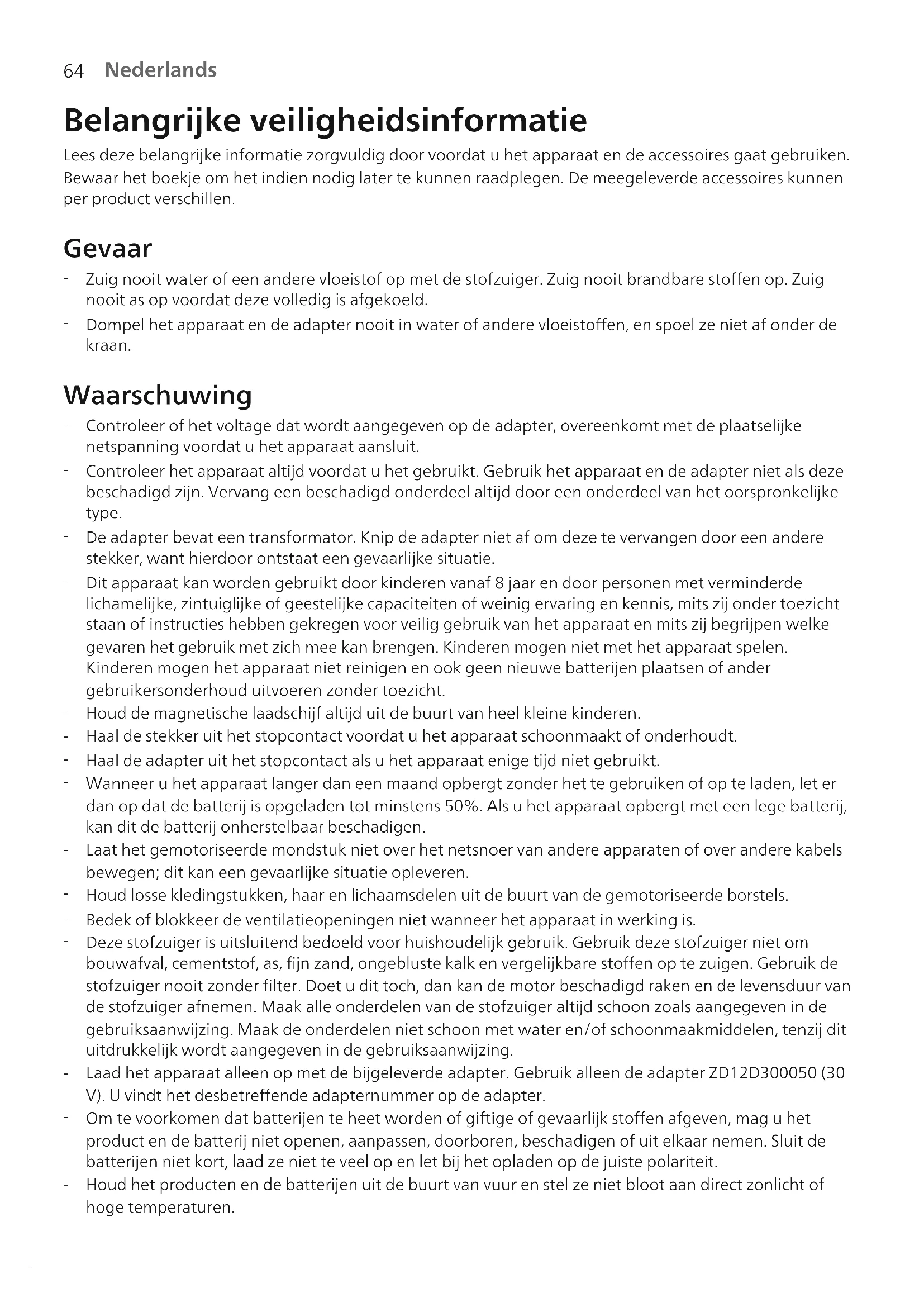 Zuig nooit water of een andere vloeistof op met de stofzuiger. Zuig nooit brandbare stoffen op. Zuig nooit as op voordat deze volledig is afgekoeld.