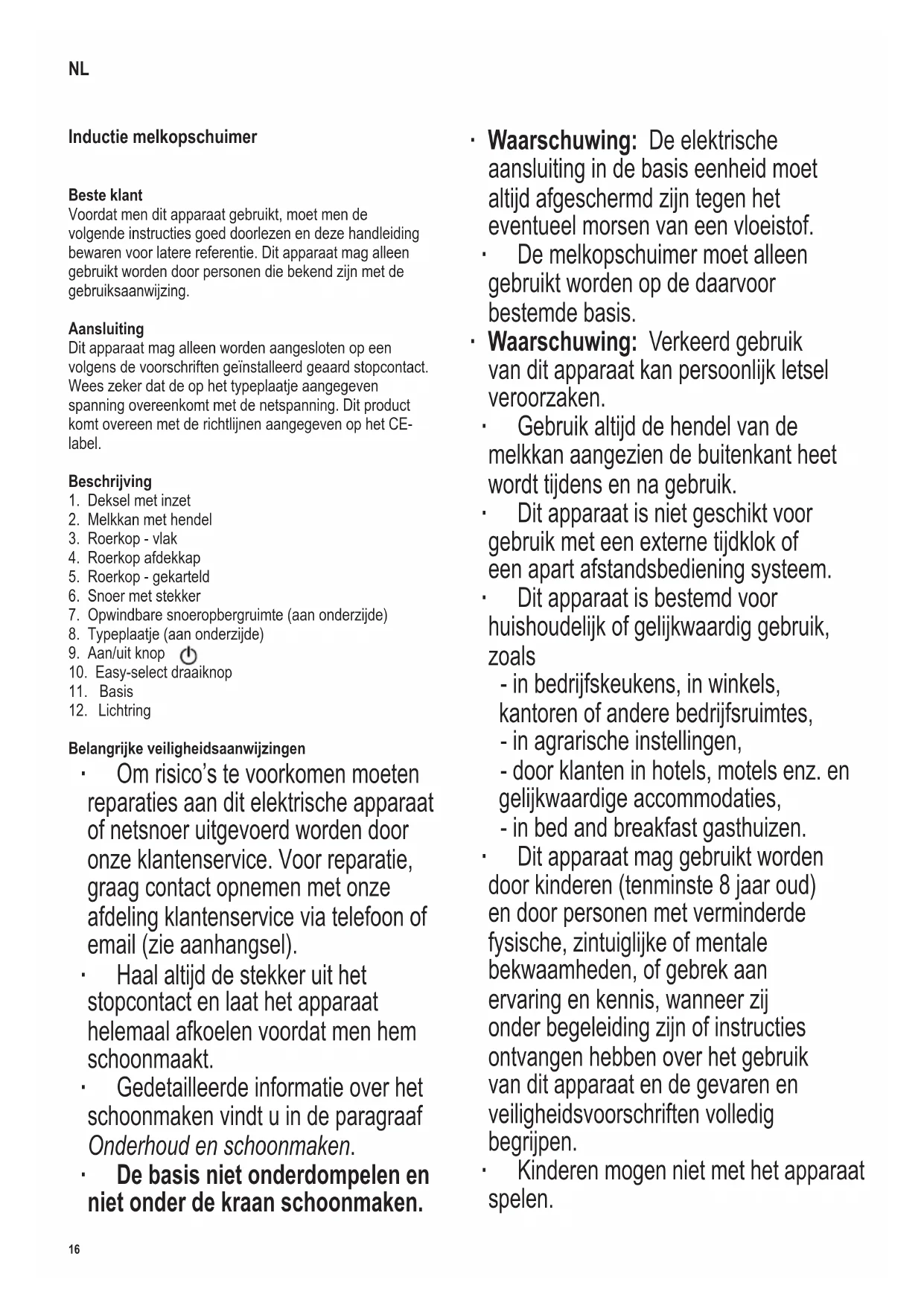 Belangrijke veiligheidsaanwijzingen ∙ Om risico’s te voorkomen moeten reparaties aan dit elektrische apparaat of netsnoer uitgevoerd worden door onze klantenservice. Voor reparatie, graag contact opnemen met onze afdeling klantenservice via telefoon of email (zie aanhangsel). ∙ Haal altijd de stekker uit het stopcontact en laat het apparaat helemaal afkoelen voordat men hem schoonmaakt. ∙ Gedetailleerde informatie over het schoonmaken vindt u in de paragraaf Onderhoud en schoonmaken. ∙ De basis niet onderdompelen en niet onder de kraan schoonmaken. ∙ Waarschuwing: De elektrische aansluiting in de basis eenheid moet altijd afgeschermd zijn tegen het eventueel morsen van een vloeistof. ∙ De melkopschuimer moet alleen gebruikt worden op de daarvoor bestemde basis. ∙ Waarschuwing: Verkeerd gebruik van dit apparaat kan persoonlijk letsel veroorzaken. ∙ Gebruik altijd de hendel van de melkkan aangezien de buitenkant heet wordt tijdens en na gebruik. ∙ Dit apparaat is niet geschikt voor gebruik met een externe tijdklok of een apart afstandsbediening systeem. ∙ Dit apparaat is bestemd voor huishoudelijk of gelijkwaardig gebruik, zoals - in bedrijfskeukens, in winkels, kantoren of andere bedrijfsruimtes, - in agrarische instellingen, - door klanten in hotels, motels enz. en gelijkwaardige accommodaties, - in bed and breakfast gasthuizen. ∙ Dit apparaat mag gebruikt worden door kinderen (tenminste 8 jaar oud) en door personen met verminderde fysische, zintuiglijke of mentale bekwaamheden, of gebrek aan ervaring en kennis, wanneer zij onder begeleiding zijn of instructies ontvangen hebben over het gebruik van dit apparaat en de gevaren en veiligheidsvoorschriften volledig begrijpen. ∙ Kinderen mogen niet met het apparaat spelen. NL17 142 x 208 mm ∙ Kinderen mogen dit apparaat in geen geval schoonmaken of onderhoudswerkzaamheden verrichten behalve onder toezicht van een volwassene en ze tenminste 8 jaar oud zijn. ∙ Het apparaat en het snoer moeten altijd goed weggehouden worden van kinderen jonger dan 8 jaar. ∙ Waarschuwing: Houdt kinderen weg van inpakmateriaal, daar deze een bron van gevaar zijn, bv. door verstikking. ∙ Voordat het apparaat wordt gebruikt moet zowel de hoofdeenheid inclusief het netsnoer als elk hulpstuk dat wordt aangebracht eerst zorgvuldig op eventuele defecten worden gecontroleerd. Ingeval het apparaat bijvoorbeeld op een hard oppervlak is gevallen, of wanneer men met overdadige kracht aan het netsnoer getrokken heeft, mag men het niet meer gebruiken: zelfs onzichtbare beschadigingen kunnen ongewenste effecten hebben op de gebruiksveiligheid van het apparaat. ∙ Dit apparaat is uitsluitend bestemd voor het opwarmen en opschuimen van melk, bereiden van hete chocolade en cacao. Plaats nooit andere soorten vloeistoffen of vast voedsel in de melkkan. ∙ Laat de melkschuimer tijdens gebruik nooit onbeheerd achter. ∙ Let vóór het gebruik altijd op de min en max. markeringen in de melkkan. ∙ De markering in de bodem van de melkkan (min. niveau markering) moet bedekt zijn door melk. Wanneer er niet voldoende melk inzit, kan het apparaat oververhitten. ∙ Waarschuwing: Overvullen van de melkkan kan gevaar veroorzaken wanneer er schuimend melk uitgestoten wordt. ∙ Waarschuwing: De deksel moet tijdens het gebruik altijd erop geplaatst zijn. ∙ De ventilatiesleuven aan de achterkant niet bedekken. ∙ Het apparaat mag alleen gebruikt worden met de originele onderdelen die door de fabrikant bijgeleverd zijn. ∙ Het apparaat moet altijd op een stevig, gelijk oppervlak geplaatst worden. ∙ Zorg ervoor dat het apparaat en het netsnoer niet in contact komen met open vuur of andere hete oppervlakken zoals kookplaten. ∙ Laat het snoer nooit los hangen: het netsnoer moet vrijgehouden worden van hete delen van het apparaat. ∙ Verwijder altijd de stekker uit het stopcontact: - wanneer het apparaat niet werkt, - na gebruik, - wanneer men het apparaat schoonmaakt. ∙ Trek de stekker niet aan het snoer uit het stopcontact maar altijd aan de stekker zelf. ∙ Wordt dit apparaat op een verkeerde manier gebruikt of worden de veiligheidsregels niet gevolgd, dan kan de fabrikant niet aansprakelijk worden gesteld voor eventuele schades. Vóór het eerste gebruik ∙ Verwijder alle overgebleven verpakkingsmaterialen en promotionele stickers, en controleer of alle onderdelen aanwezig zijn. ∙ Voordat men het apparaat voor het eerst gebruikt of wanneer men het apparaat voor een lange periode niet gebruikt heeft, moet men deze eerst goed schoonmaken zoals staat beschreven in de sectie Onderhoud en schoonmaken. Opberging van het netsnoer ∙ Er bevindt zich een opbergruimte voor het netsnoer in de basis. ∙ Wikkel vóór gebruik het snoer af naar de gewenste lengte. ∙ Na gebruik het netsnoer weer opwinden. Gebruik Deksel ∙ De deksel moet tijdens het gebruik altijd erop geplaatst zijn. ∙ Om tijdens werking ingrediënten toe te voegen, de dekselinzet draaien en dan eraf nemen. ∙ Bij het opbergen, kan de vlakke roerkop in de dekselinzet geplaatst worden. Lichtring Rood Er is een opwarmfunctie geselecteerd. Blauw Er is een functie zonder opwarmen geselecteerd. Constant licht Bereiding is bezig. Rood of blauw knipperen Het apparaat wacht op invoer, bereiding is voltooid, of er is een storing (zie Probleemopsporing aan het einde van de instructies).18 142 x 208 mm Het roerhulpstuk selecteren De volgende roerhulpstukken zijn beschikbaar: è vlak è gekarteld