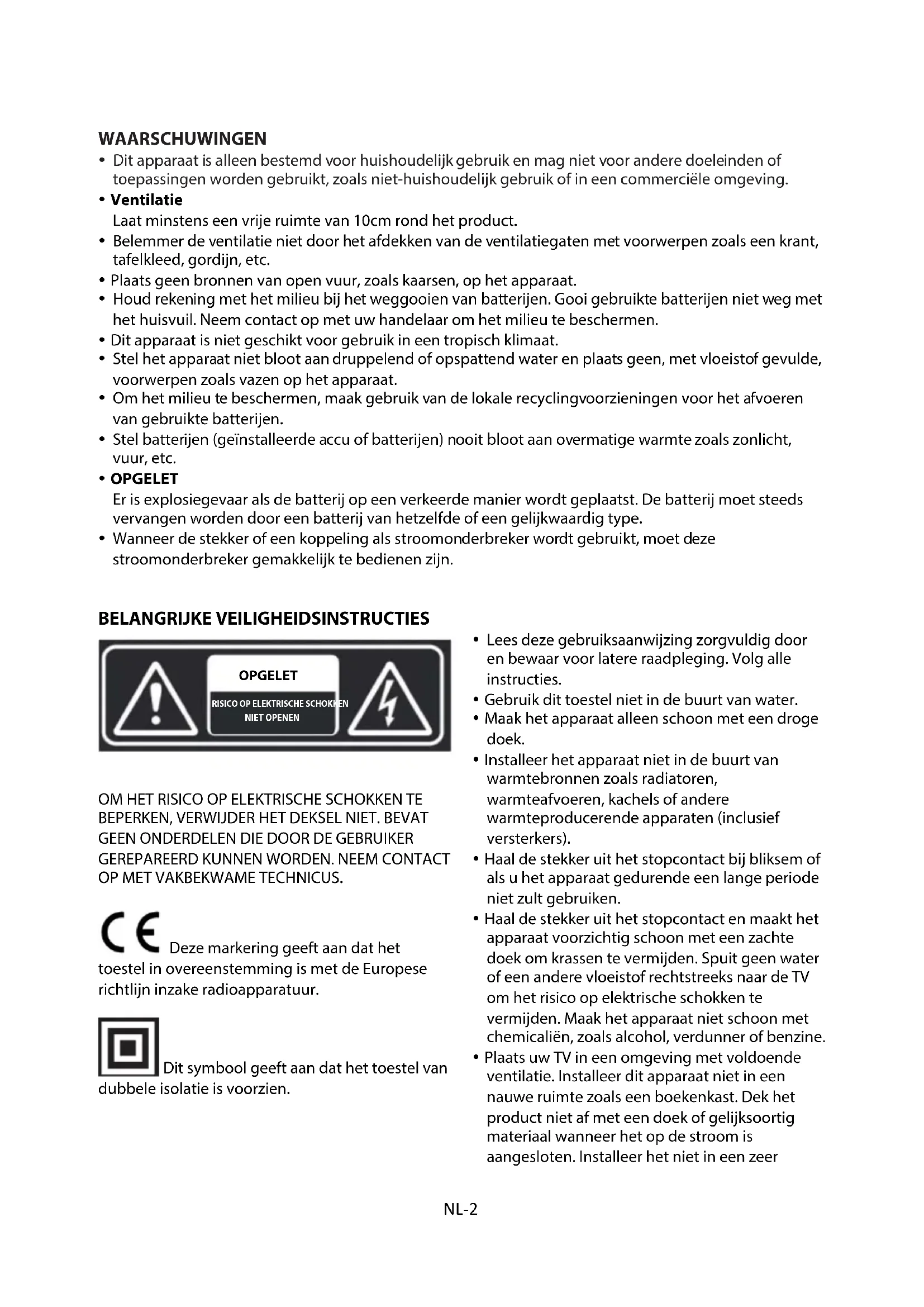 - De termen HDMI en HDMI High-Definition Multimedia Interface, en het HDMI logo zijn handelsmerken of geregistreerde handelsmerken van HDMI Licensing LLC in de Verenigde Staten en andere landen.NL-2 WAARSCHUWINGEN Dit apparaat is alleen bestemd voor huishoudelijk gebruik en mag niet voor andere doeleinden of toepassingen worden gebruikt, zoals niet-huishoudelijk gebruik of in een commerciële omgeving. Ventilatie Laat minstens een vrije ruimte van 10cm rond het product. Belemmer de ventilatie niet door het afdekken van de ventilatiegaten met voorwerpen zoals een krant, tafelkleed, gordijn, etc. Plaats geen bronnen van open vuur, zoals kaarsen, op het apparaat. Houd rekening met het milieu bij het weggooien van batterijen. Gooi gebruikte batterijen niet weg met het huisvuil. Neem contact op met uw handelaar om het milieu te beschermen. Dit apparaat is niet geschikt voor gebruik in een tropisch klimaat. Stel het apparaat niet bloot aan druppelend of opspattend water en plaats geen, met vloeistof gevulde, voorwerpen zoals vazen op het apparaat. Om het milieu te beschermen, maak gebruik van de lokale recyclingvoorzieningen voor het afvoeren van gebruikte batterijen. Stel batterijen (geïnstalleerde accu of batterijen) nooit bloot aan overmatige warmte zoals zonlicht, vuur, etc. OPGELET Er is explosiegevaar als de batterij op een verkeerde manier wordt geplaatst. De batterij moet steeds vervangen worden door een batterij van hetzelfde of een gelijkwaardig type. Wanneer de stekker of een koppeling als stroomonderbreker wordt gebruikt, moet deze stroomonderbreker gemakkelijk te bedienen zijn. BELANGRIJKE VEILIGHEIDSINSTRUCTIES