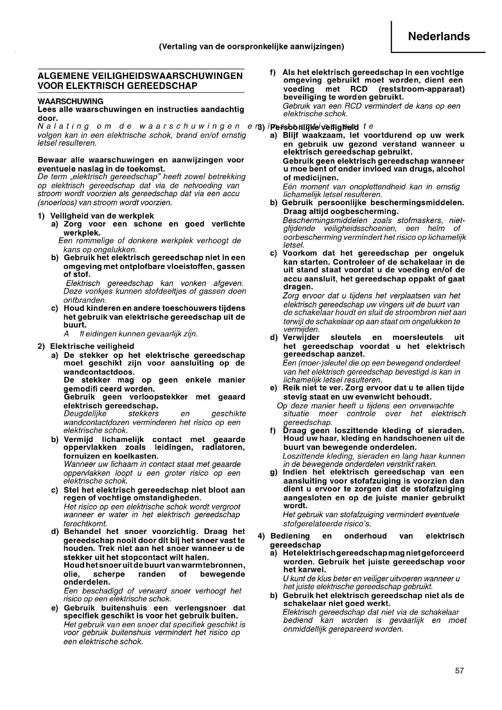 a) Blijf waakzaam, let voortdurend op uw werk en gebruik uw gezond verstand wanneer u elektrisch gereedschap gebruikt. Gebruik geen elektrisch gereedschap wanneer u moe bent of onder invloed van drugs, alcohol of medicijnen. Eén moment van onoplettendheid kan in ernstig lichamelijk letsel resulteren. b) Gebruik persoonlijke beschermingsmiddelen. Draag altijd oogbescherming. Beschermingsmiddelen zoals stofmaskers, niet- glijdende veiligheidsschoenen, een helm of oorbescherming vermindert het risico op lichamelijk letsel. c) Voorkom dat het gereedschap per ongeluk kan starten. Controleer of de schakelaar in de uit stand staat voordat u de voeding en/of de accu aansluit, het gereedschap oppakt of gaat dragen. Zorg ervoor dat u tijdens het verplaatsen van het elektrisch gereedschap uw vingers uit de buurt van de schakelaar houdt en sluit de stroombron niet aan terwijl de schakelaar op aan staat om ongelukken te vermijden. d) Verwijder sleutels en moersleutels uit het gereedschap voordat u het elektrisch gereedschap aanzet. Een (moer-)sleutel die op een bewegend onderdeel van het elektrisch gereedschap bevestigd is kan in lichamelijk letsel resulteren. e) Reik niet te ver. Zorg ervoor dat u te allen tijde stevig staat en uw evenwicht behoudt. Op deze manier heeft u tijdens een onverwachte situatie meer controle over het elektrisch gereedschap. f) Draag geen loszittende kleding of sieraden. Houd uw haar, kleding en handschoenen uit de buurt van bewegende onderdelen. Loszittende kleding, sieraden en lang haar kunnen in de bewegende onderdelen verstrikt raken. g) Indien het elektrisch gereedschap van een aansluiting voor stofafzuiging is voorzien dan dient u ervoor te zorgen dat de stofafzuiging aangesloten en op de juiste manier gebruikt wordt. Het gebruik van stofafzuiging vermindert eventuele stofgerelateerde risico’s.