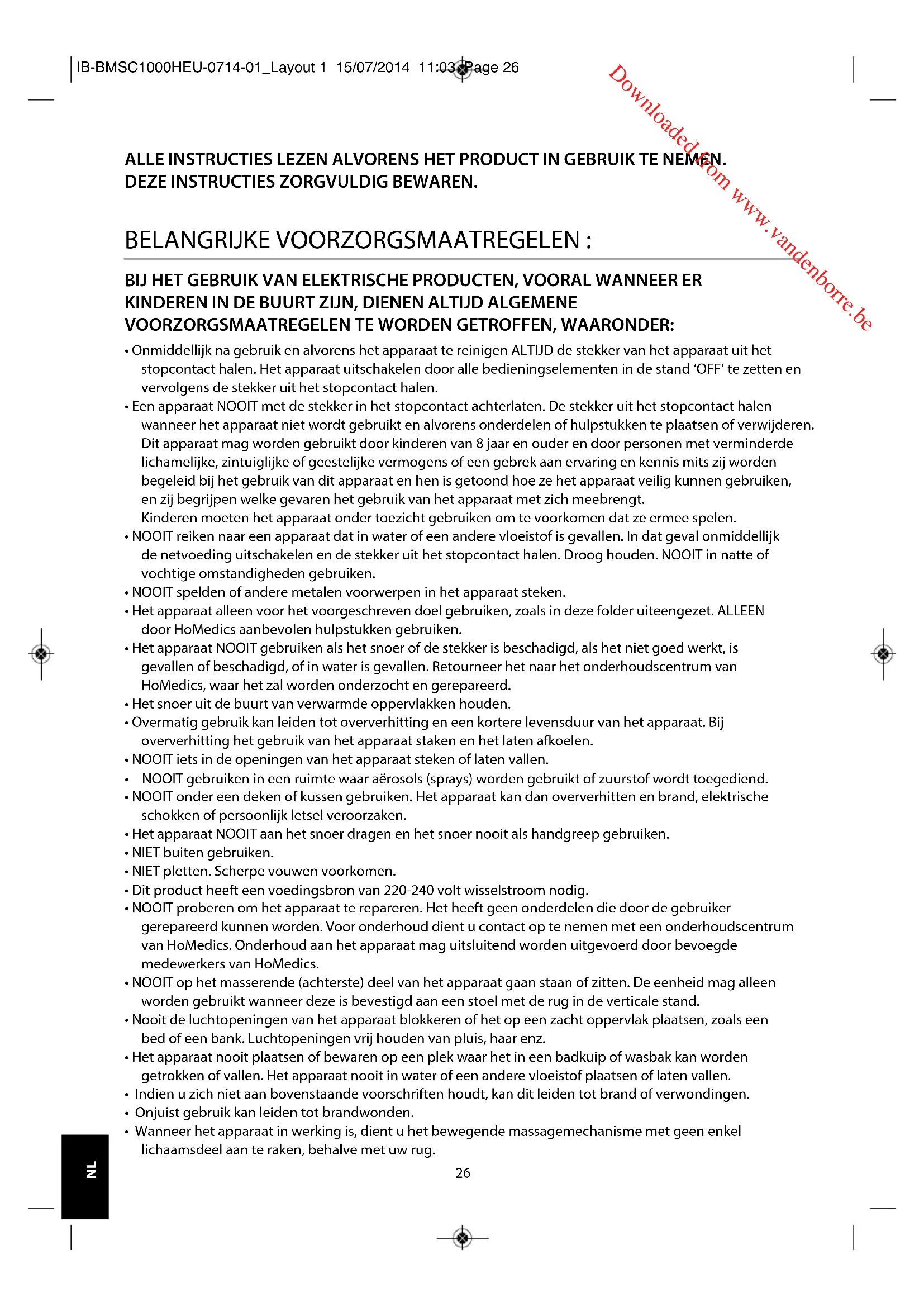 - Wanneer het apparaat in werking is, dient u het bewegende massagemechanisme met geen enkel lichaamsdeel aan te raken, behalve met uw rug. IB-BMSC1000HEU-0714-01_Layout 1 15/07/2014 11:03 Page 26 Downloaded from www.vandenborre.be27