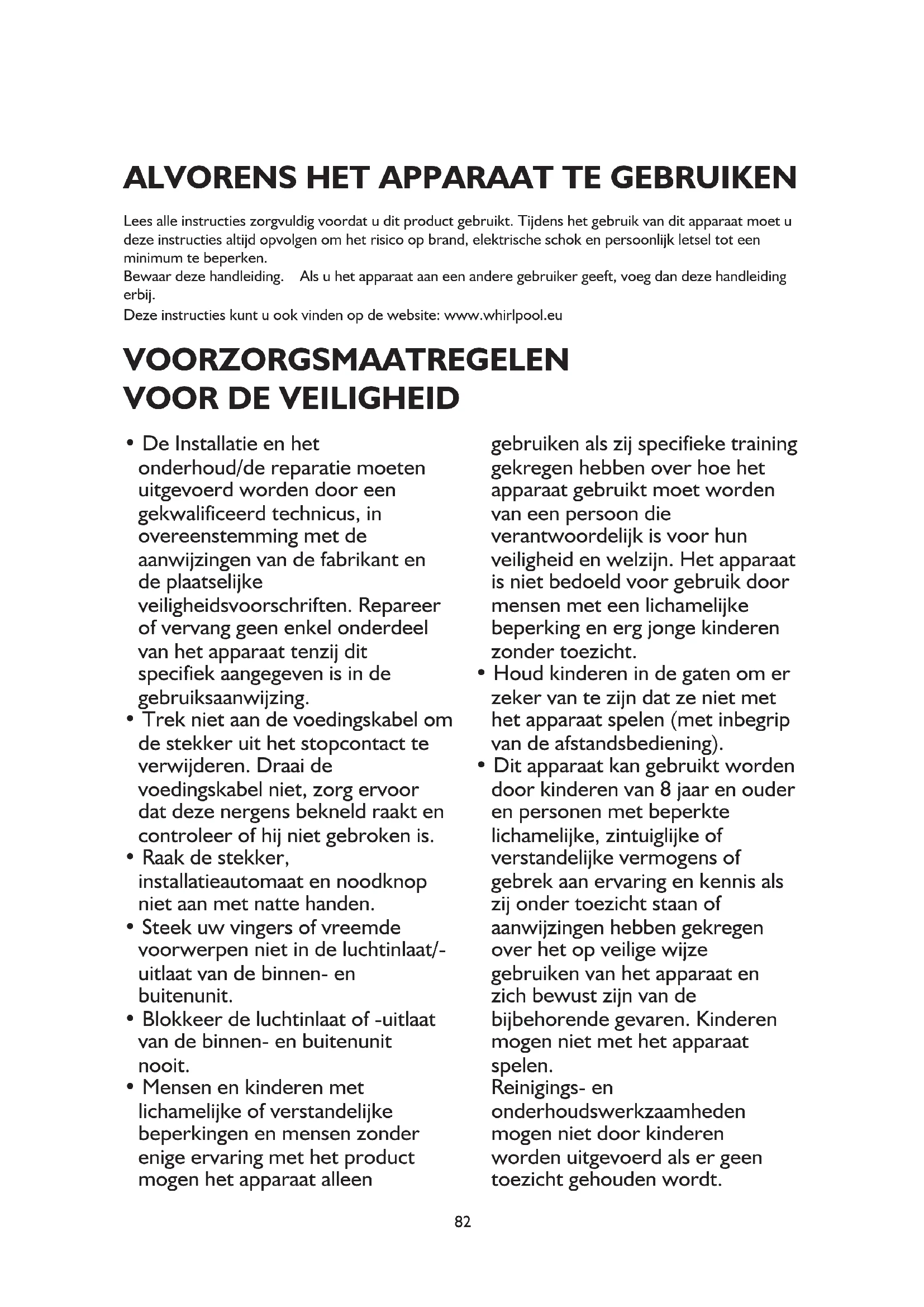 Lees alle instructies zorgvuldig voordat u dit product gebruikt. Tijdens het gebruik van dit apparaat moet u deze instructies altijd opvolgen om het risico op brand, elektrische schok en persoonlijk letsel tot een minimum te beperken. Bewaar deze handleiding. Als u het apparaat aan een andere gebruiker geeft, voeg dan deze handleiding erbij. Deze instructies kunt u ook vinden op de website: www.whirlpool.eu VOORZORGSMAATREGELEN