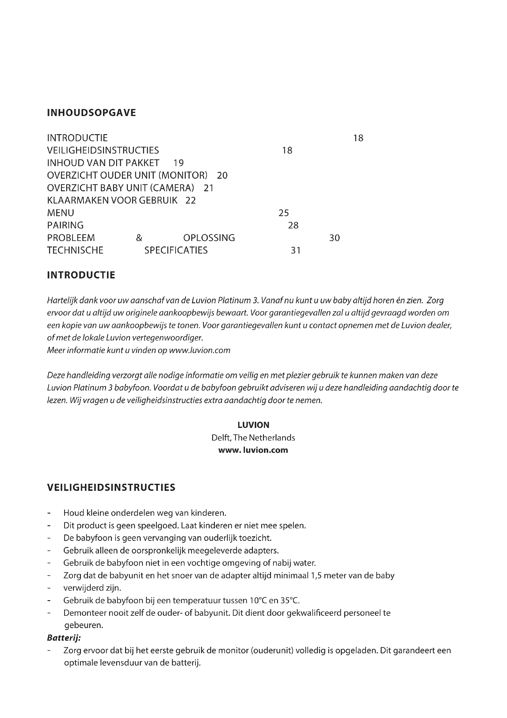 MENU 25 PAIRING 28 PROBLEEM & OPLOSSING 30 TECHNISCHE SPECIFICATIES 31 INTRODUCTIE Hartelijk dank voor uw aanschaf van de Luvion Platinum 3. Vanaf nu kunt u uw baby altijd horen én zien. Zorg ervoor dat u altijd uw originele aankoopbewijs bewaart. Voor garantiegevallen zal u altijd gevraagd worden om een kopie van uw aankoopbewijs te tonen. Voor garantiegevallen kunt u contact opnemen met de Luvion dealer, of met de lokale Luvion vertegenwoordiger. Meer informatie kunt u vinden op www.luvion.com Deze handleiding verzorgt alle nodige informatie om veilig en met plezier gebruik te kunnen maken van deze Luvion Platinum 3 babyfoon. Voordat u de babyfoon gebruikt adviseren wij u deze handleiding aandachtig door te lezen. Wij vragen u de veiligheidsinstructies extra aandachtig door te nemen. LUVION Delft, The Netherlands www. luvion.com VEILIGHEIDSINSTRUCTIES - Houd kleine onderdelen weg van kinderen. - Dit product is geen speelgoed. Laat kinderen er niet mee spelen. - De babyfoon is geen vervanging van ouderlijk toezicht. - Gebruik alleen de oorspronkelijk meegeleverde adapters. - Gebruik de babyfoon niet in een vochtige omgeving of nabij water. - Zorg dat de babyunit en het snoer van de adapter altijd minimaal 1,5 meter van de baby - verwijderd zijn. - Gebruik de babyfoon bij een temperatuur tussen 10°C en 35°C. - Demonteer nooit zelf de ouder- of babyunit. Dit dient door gekwali ceerd personeel te gebeuren. Batterij: - Zorg ervoor dat bij het eerste gebruik de monitor (ouderunit) volledig is opgeladen. Dit garandeert een optimale levensduur van de batterij.19 LUVION