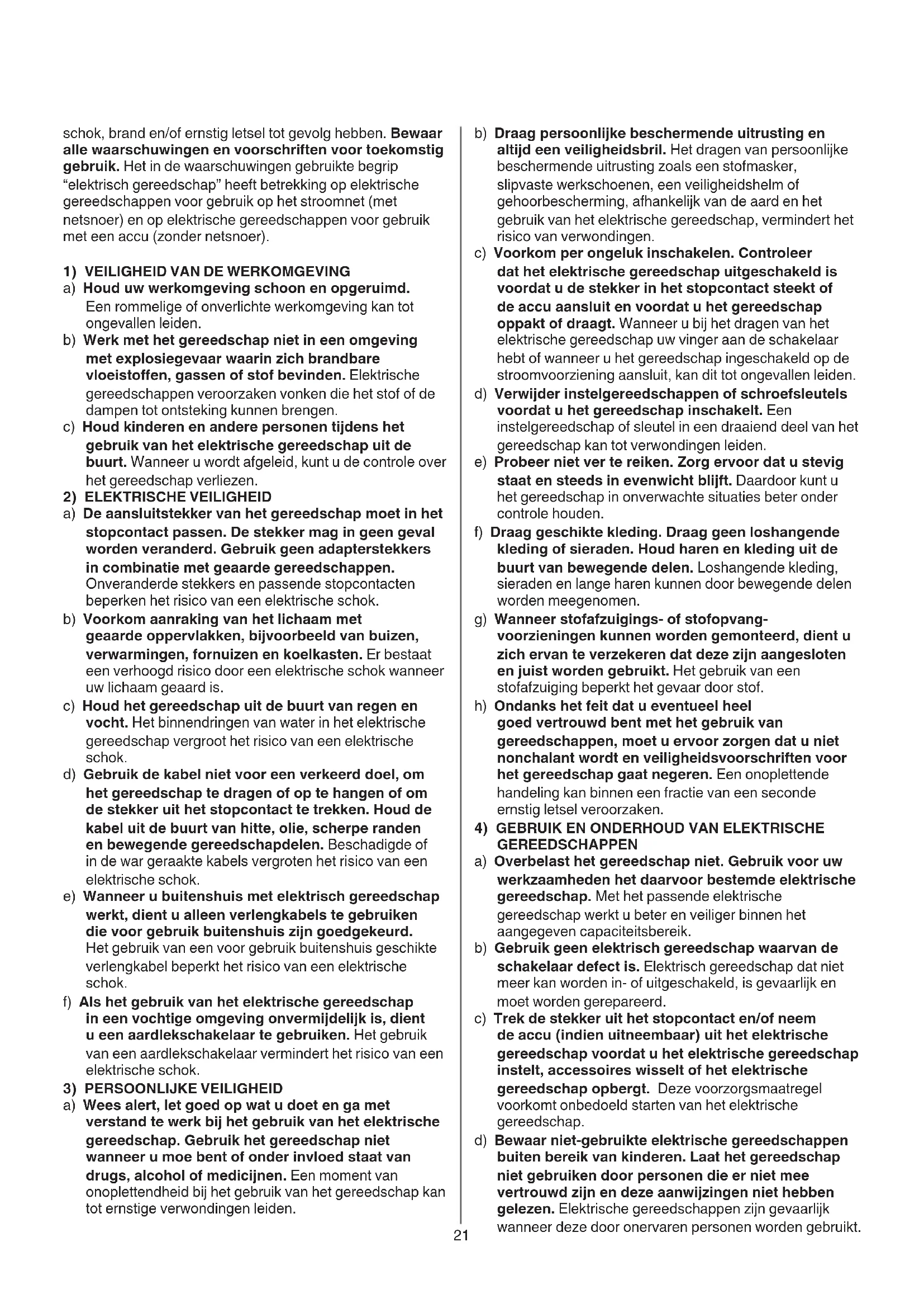 g) Gebruik elektrische gereedschappen, toebehoren, inzetgereedschappen en dergelijkke volgens deze aanwijzingen. Let waar bij op de arbeidsomstandigheden en de uit te voeren werkzaamheden. Het gebruik van elektrische gereedschappen voor andere dan de Voorziene toepassingen kan tot gevaarlijke situatuies leiden.