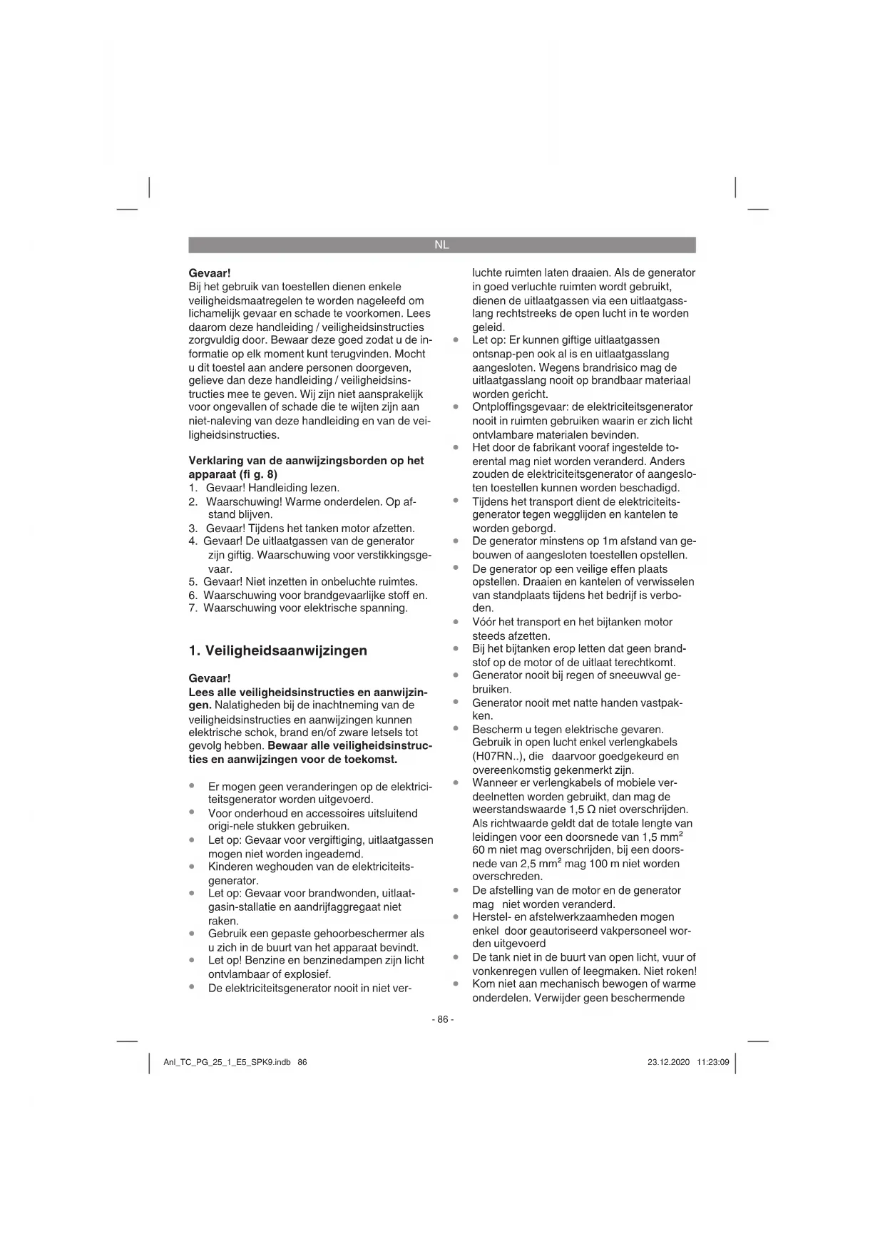 De generator niet aansluiten aan een hu- ishoudelijk net, aangezien daardoor een beschadiging van de generator of andere elektrische apparaten in het huis kan worden veroorzaakt. Anl_TC_PG_25_1_E5_SPK9.indb 89Anl_TC_PG_25_1_E5_SPK9.indb 89 23.12.2020 11:23:1023.12.2020 11:23:10NL