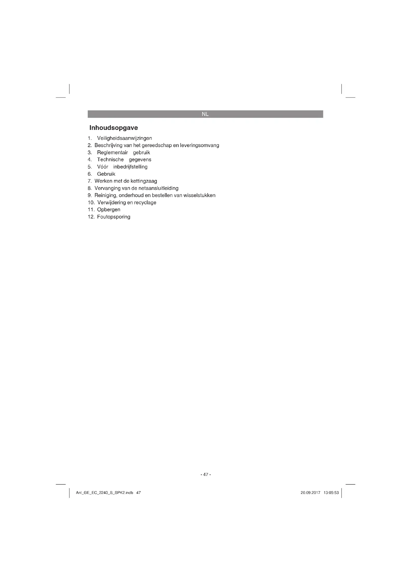 Controleer of de gegevens vermeld op het ken- plaatje overeenkomen met de gegevens van het stroomnet alvorens het gereedschap aan te sluiten. Waarschuwing! Verwijder altijd de netstekker uit het stop- contact voordat u het gereedschap anders afstelt. Sluit de kettingzaag pas aan op het stroomnet als deze volledig is gemonteerd en de kettingspan- ning is ingesteld. Draag altijd veiligheidshand- schoenen als u werkzaamheden op de ketting- Anl_GE_EC_2240_S_SPK2.indb 49Anl_GE_EC_2240_S_SPK2.indb 49 20.09.2017 13:05:5320.09.2017 13:05:53NL