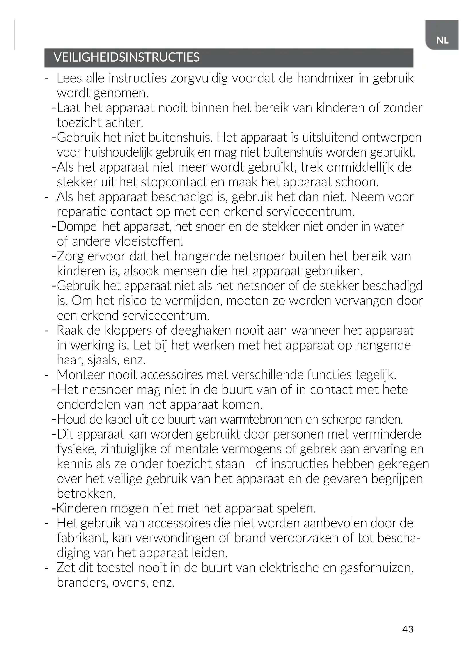 VEILIGHEIDSINSTRUCTIES - Lees alle instruces zorgvuldig voordat de handmixer in gebruik wordt genomen.