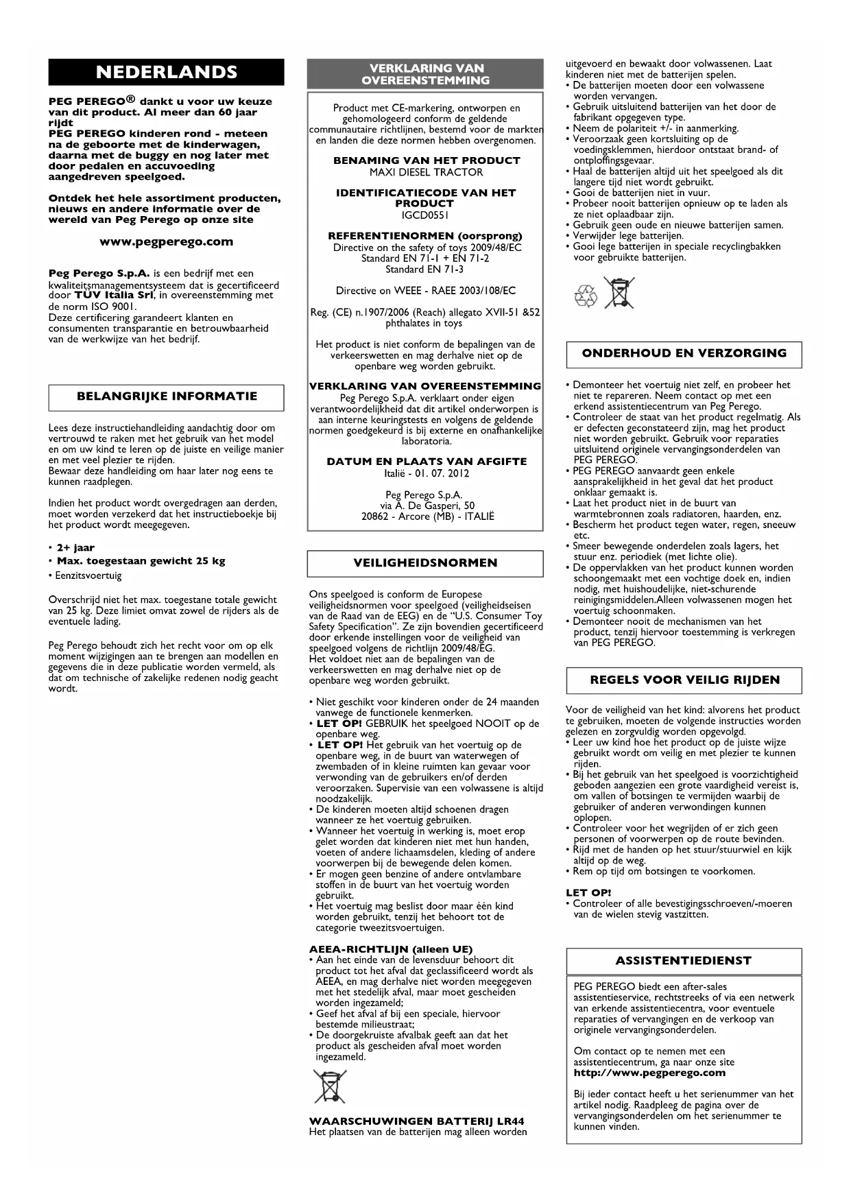 Italië - 01. 07. 2012 Peg Perego S.p.A. via A. De Gasperi, 50 20862 - Arcore (MB) - ITALIË NEDERLANDS VERKLARING VAN OVEREENSTEMMING BELANGRIJKE INFORMATIE Ons speelgoed is conform de Europese veiligheidsnormen voor speelgoed (veiligheidseisen van de Raad van de EEG) en de “U.S. Consumer Toy Safety Specification”. Ze zijn bovendien gecertificeerd door erkende instellingen voor de veiligheid van speelgoed volgens de richtlijn 2009/48/EG. Het voldoet niet aan de bepalingen van de verkeerswetten en mag derhalve niet op de openbare weg worden gebruikt.