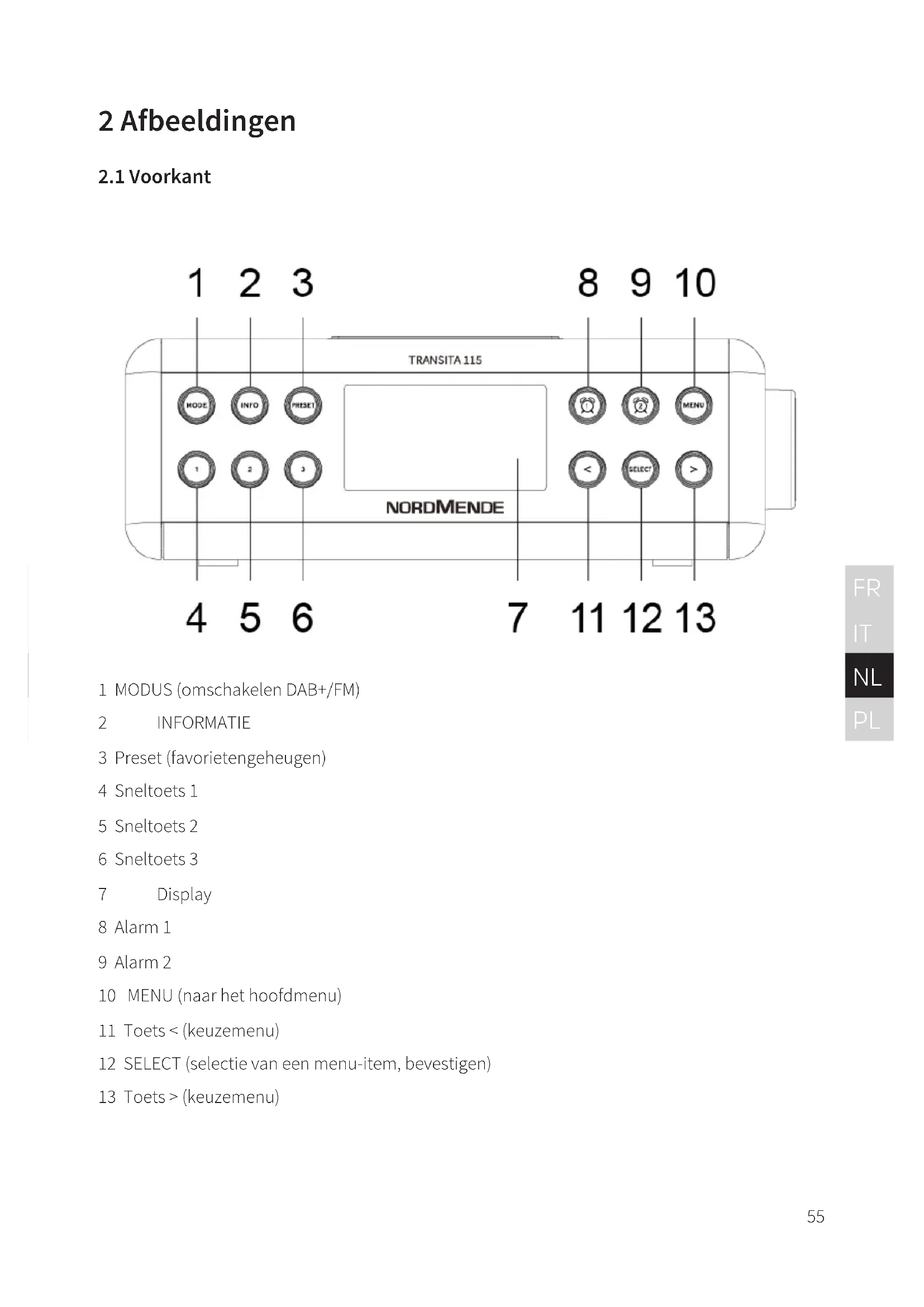 1 MODUS (omschakelen DAB+/FM) 2 INFORMATIE 3 Preset (favorietengeheugen) 4 Sneltoets 1 5 Sneltoets 2 6 Sneltoets 3 7 Display 8 Alarm 1 9 Alarm 2 10 MENU (naar het hoofdmenu) 11 Toets < (keuzemenu) 12 SELECT (selectie van een menu-item, bevestigen) 13 Toets > (keuzemenu)56