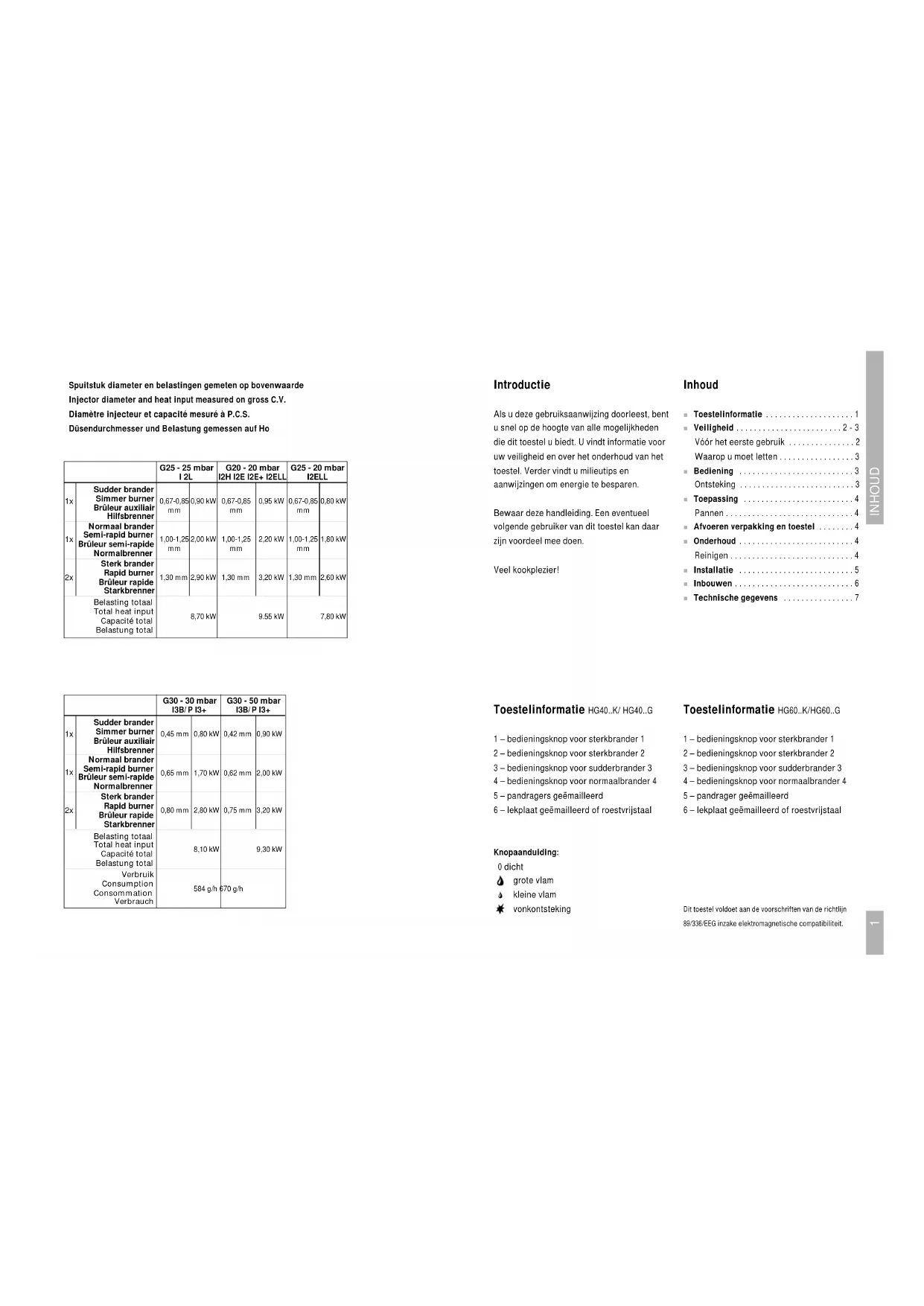 - ■ Technische gegevens Dit toestel voldoet aan de voorschriften van de richtlijn 89/336/EEG inzake elektromagnetische compatibiliteit. Toestelinformatie HG40 K/ HG40 G 1 – bedieningsknop voor sterkbrander 1 2 – bedieningsknop voor sterkbrander 2 3 – bedieningsknop voor sudderbrander 3 4 – bedieningsknop voor normaalbrander 4 5 – pandragers geëmailleerd 6 – lekplaat geëmailleerd of roestvrijstaal Knopaanduiding: 0 dicht grote vlam kleine vlam vonkontsteking Toestelinformatie HG60 K/HG60 G 1 – bedieningsknop voor sterkbrander 1 2 – bedieningsknop voor sterkbrander 2 3 – bedieningsknop voor sudderbrander 3 4 – bedieningsknop voor normaalbrander 4 5 – pandrager geëmailleerd 6 – lekplaat geëmailleerd of roestvrijstaal Sudder brander Simmer burner Brûleur auxiliair Hilfsbrenner G25 - 25 mbar I 2L G20 - 20 mbar I2H I2E I2E+ I2ELL Normaal brander Semi-rapid burner Brûleur semi-rapide Normalbrenner Sterk brander Rapid burner Brûleur rapide Starkbrenner Belasting totaal Total heat input Capacité total Belastung total p. 7
