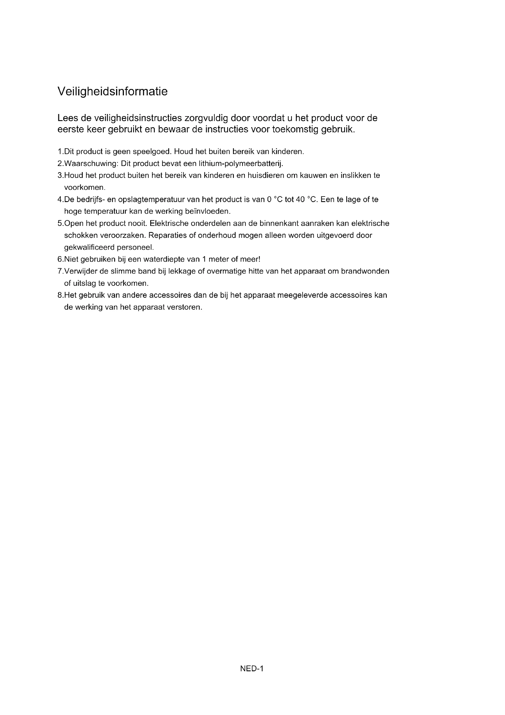 og klik på søgeikonet øverst på hjemmesiden. Skriv DEN-6 Denver denver.eu denver.eumodelnummeret: SW-151 MK2. Du kommer nu ind på produktsiden, hvor RED-direktivet kan findes under downloads/andre downloads. Driftsfrekvensområde: 2412-2484 MHZ Maksimal udgangseffekt: 0.555W Omega 5A, Soeften DK-8382 Hinnerup Danmark DEN-7 Denver A/S facebook.com/Denver.eu1.Dit product is geen speelgoed. Houd het buiten bereik van kinderen. 2.Waarschuwing: Dit product bevat een lithium-polymeerbatterij. 3.Houd het product buiten het bereik van kinderen en huisdieren om kauwen en inslikken te voorkomen. 4.De bedrijfs- en opslagtemperatuur van het product is van 0 °C tot 40 °C. Een te lage of te hoge temperatuur kan de werking beïnvloeden. 5.Open het product nooit. Elektrische onderdelen aan de binnenkant aanraken kan elektrische schokken veroorzaken. Reparaties of onderhoud mogen alleen worden uitgevoerd door gekwalificeerd personeel. 6.Niet gebruiken bij een waterdiepte van 1 meter of meer! 7.Verwijder de slimme band bij lekkage of overmatige hitte van het apparaat om brandwonden of uitslag te voorkomen. 8.Het gebruik van andere accessoires dan de bij het apparaat meegeleverde accessoires kan de werking van het apparaat verstoren. Lees de veiligheidsinstructies zorgvuldig door voordat u het product voor de eerste keer gebruikt en bewaar de instructies voor toekomstig gebruik. Veiligheidsinformatie NED-11. Compatibel systeem van telefoons en BLE-versie: Android 4.2 en hoger iOS 8.0 en hoger BT4.0
