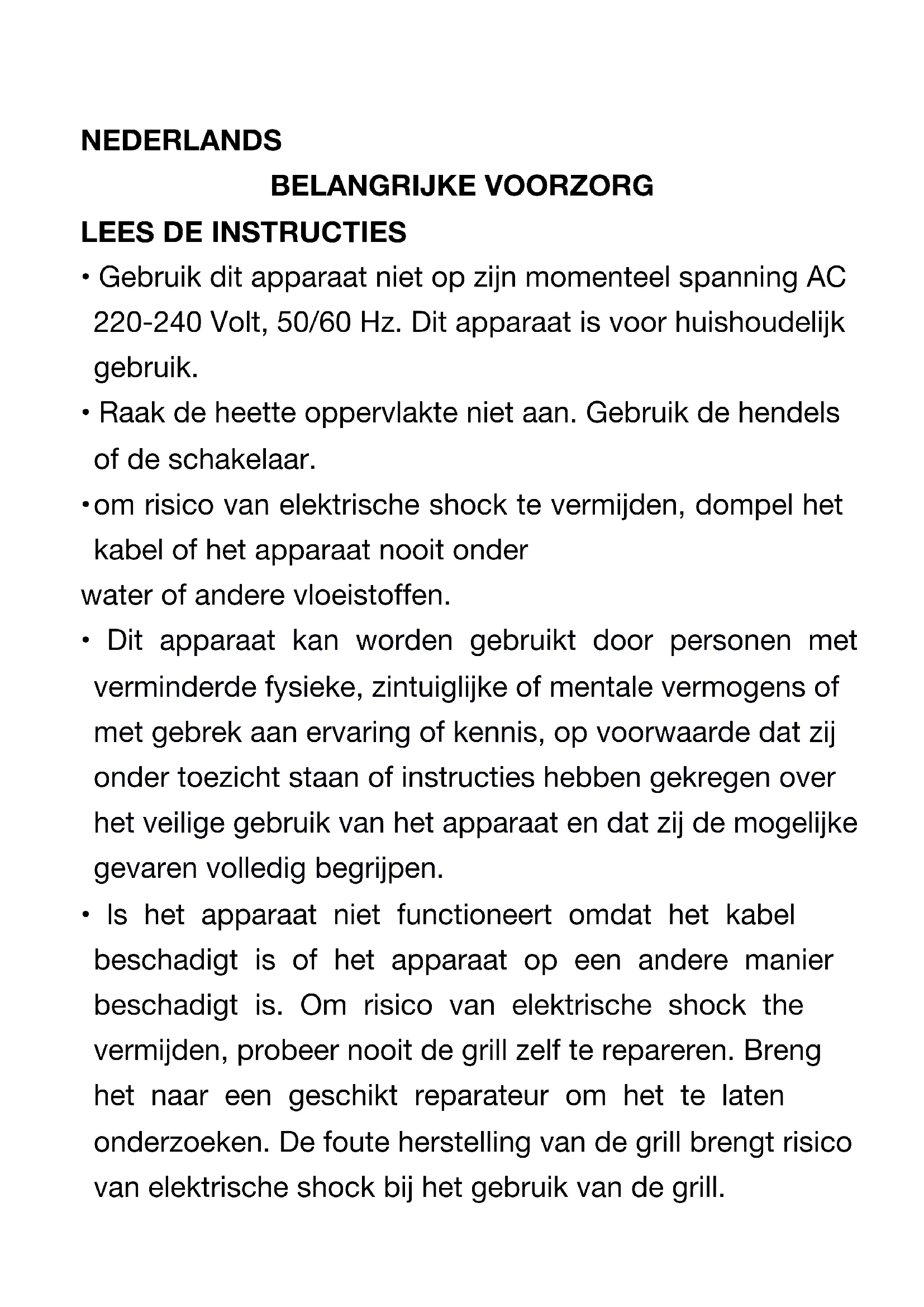 - Bij het gebruik van elektrische apparatuur moeten altijd veiligheidsmaatregelen worden genomen om het risico van brand, elektrische schokken en/of letsel in geval van verkeerd gebruik te voorkomen.