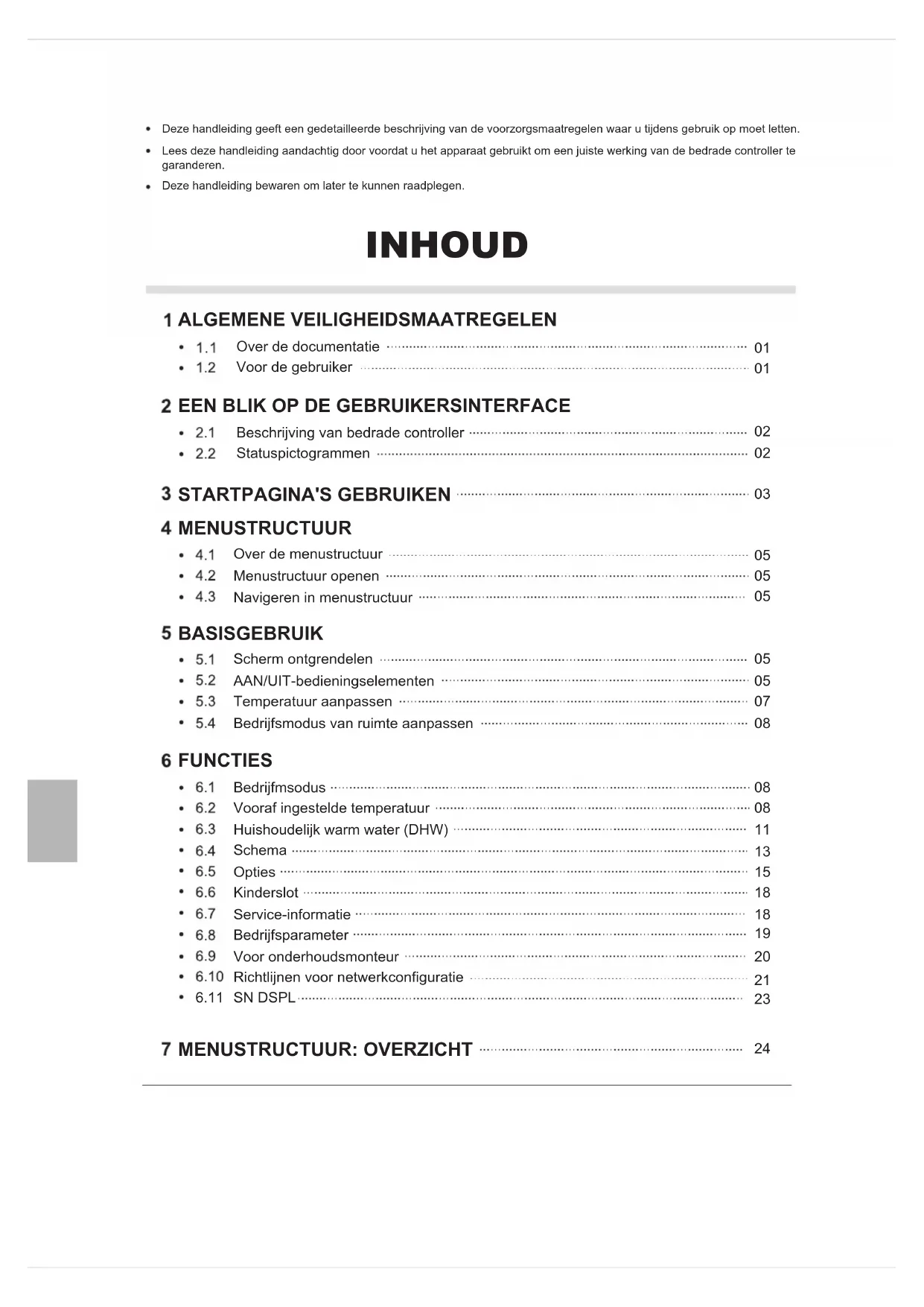 7Deze handleiding geeft een gedetailleerde beschrijving van de voorzorgsmaatregelen waar u tijdens gebruik op moet letten. Lees deze handleiding aandachtig door voordat u het apparaat gebruikt om een juiste werking van de bedrade controller te garanderen. Deze handleiding bewaren om later te kunnen raadplegen. INHOUD Over de documentatie Voor de gebruiker Beschrijving van bedrade controller Statuspictogrammen Over de menustructuur Menustructuur openen Navigeren in menustructuur Scherm ontgrendelen AAN/UIT-bedieningselementen Temperatuur aanpassen Bedrijfsmodus van ruimte aanpassen Bedrijfmsodus Vooraf ingestelde temperatuur Huishoudelijk warm water (DHW) Schema Opties Kinderslot Service-informatie Bedrijfsparameter Voor onderhoudsmonteur Richtlijnen voor netwerkconfiguratie ALGEMENE VEILIGHEIDSMAATREGELEN